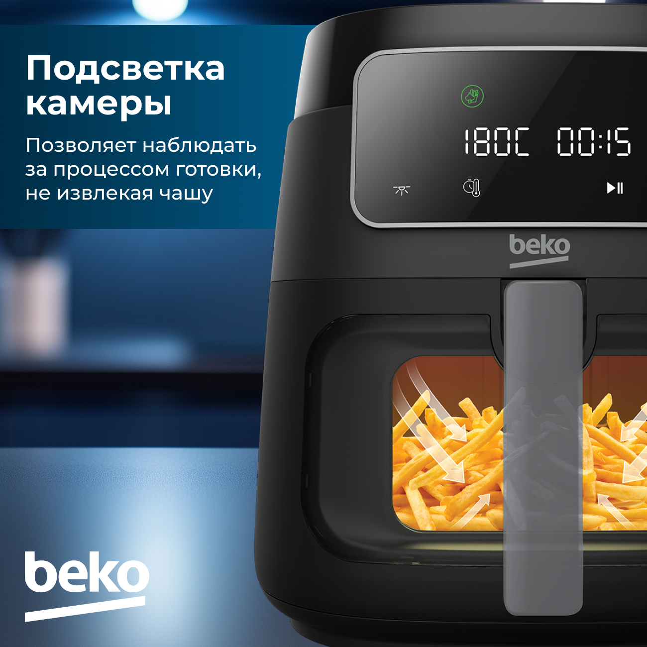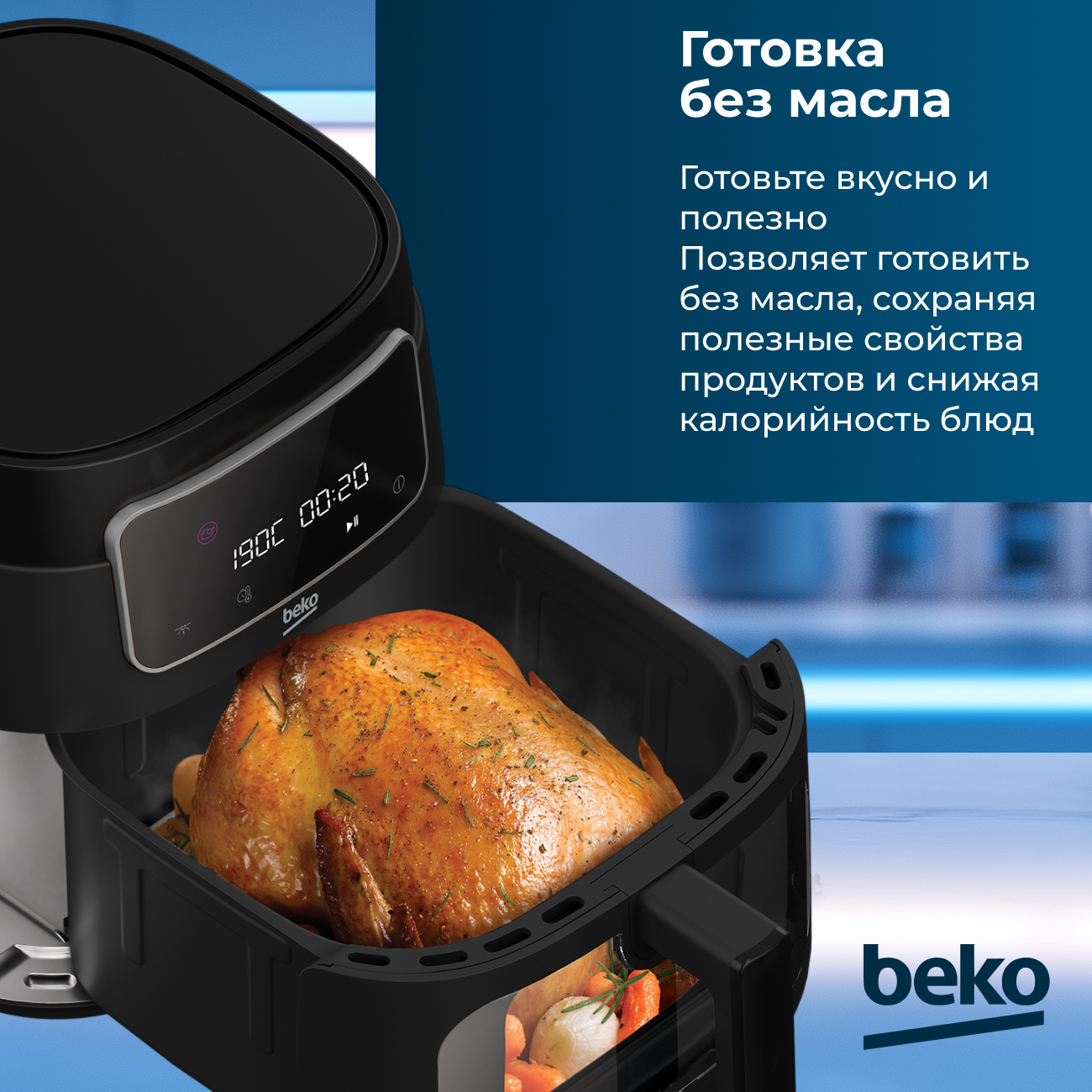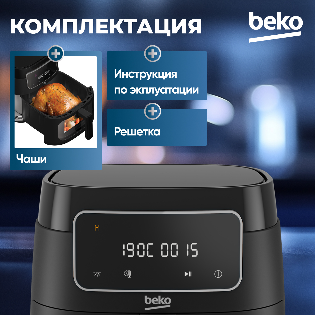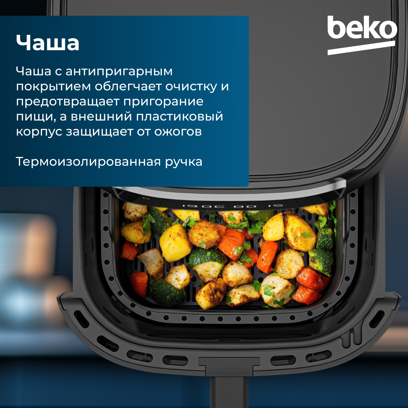 Если нужна более вместительная модель, обратите внимание на этот аэрогриль с чашей на 7,6 л и мощностью 1750 Вт, который предлагает сразу 9 программ. Здесь есть всё: классические режимы (картофель фри, выпечка, разморозка) и сушка, а также функция «Шампур», позволяющая приготовить сочное мясо или овощи. Максимальная температура достигает 200 °C, а подсветка камеры позволяет наблюдать за готовкой без лишних открываний. Управление полностью сенсорное, можно настроить таймер (до 60 минут) или использовать ручной режим. Как и в предыдущей модели, при извлечении чаши аэрогриль автоматически ставит процесс на паузу, чтобы после возвращения продолжить с теми же параметрами. Ухаживать за устройством тоже просто: антипригарное покрытие чаши легко отмывается, в том числе и в посудомоечной машине, а термоизолированная ручка и пластиковый корпус защищают от ожогов. Дополнительная решётка даёт возможность готовить на двух уровнях одновременно. Габариты остаются достаточно компактными для такого объёма, а кабель длиной 90 см удобно убирается в отсек. Двухлетняя гарантия от BEKO — ещё один плюс в пользу долговечности этого аэрогриля.