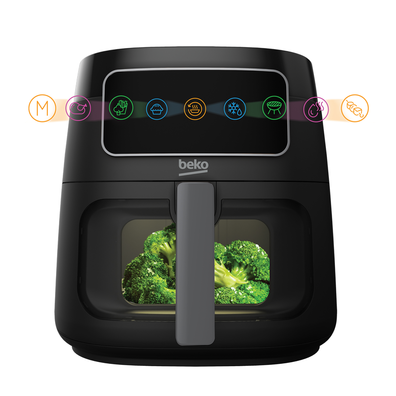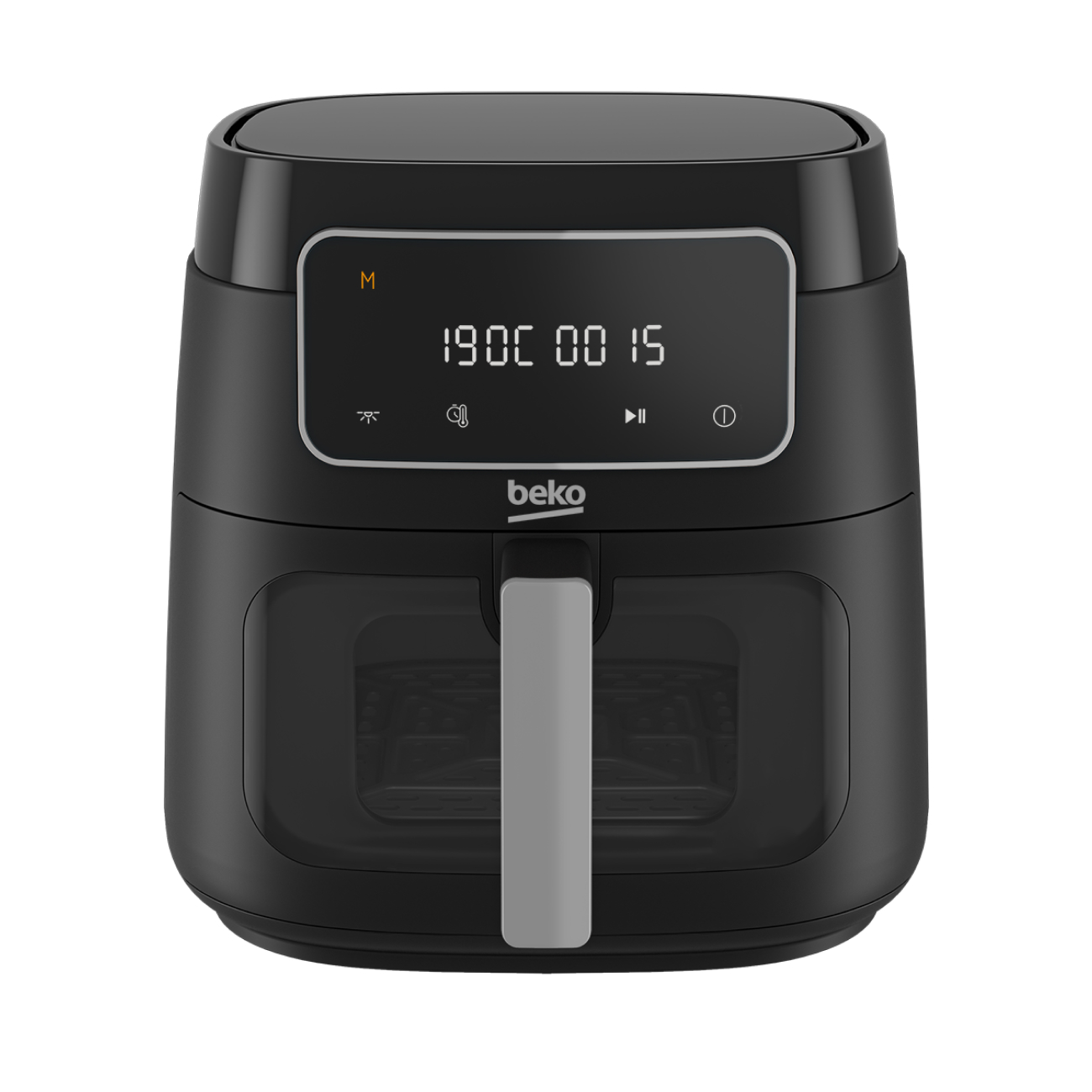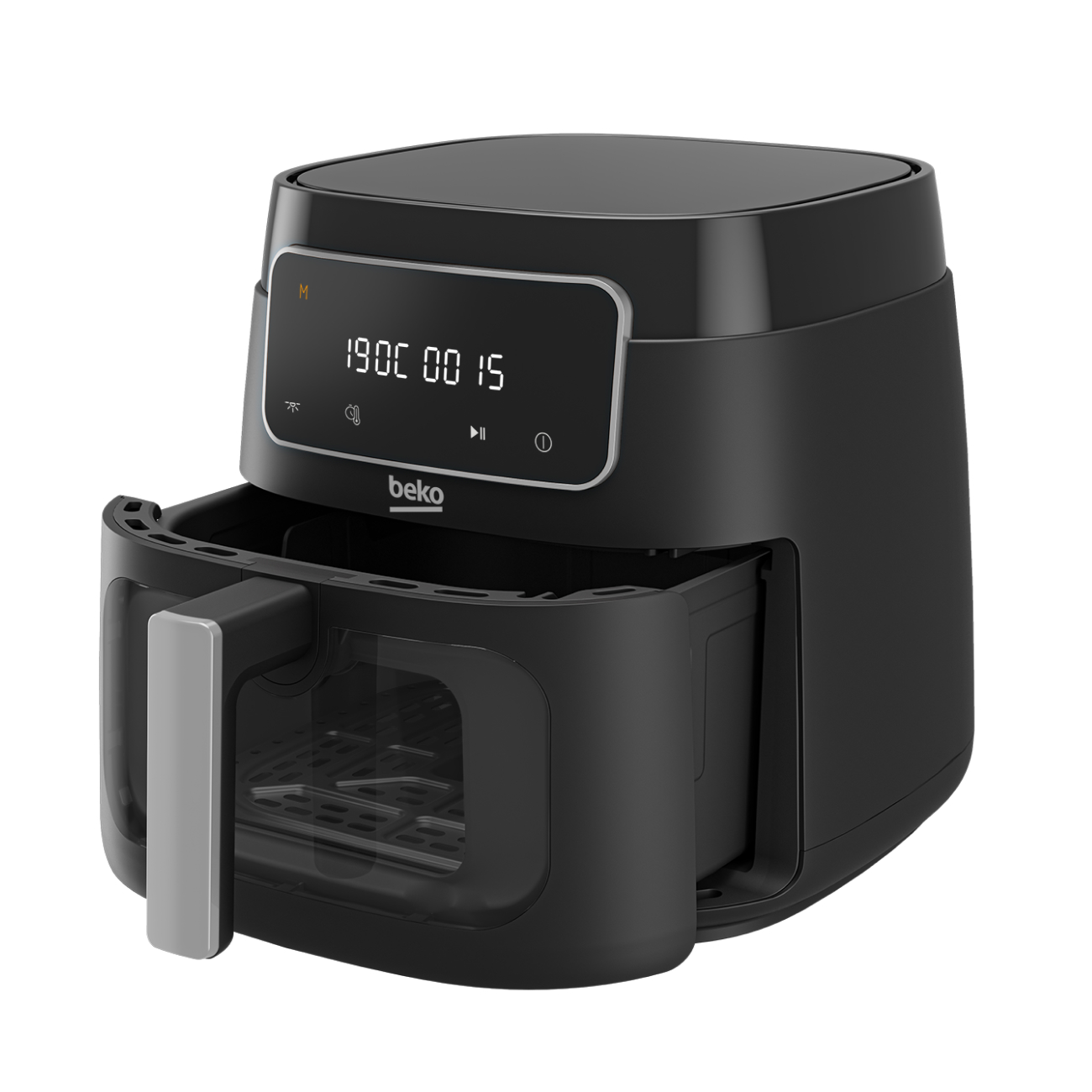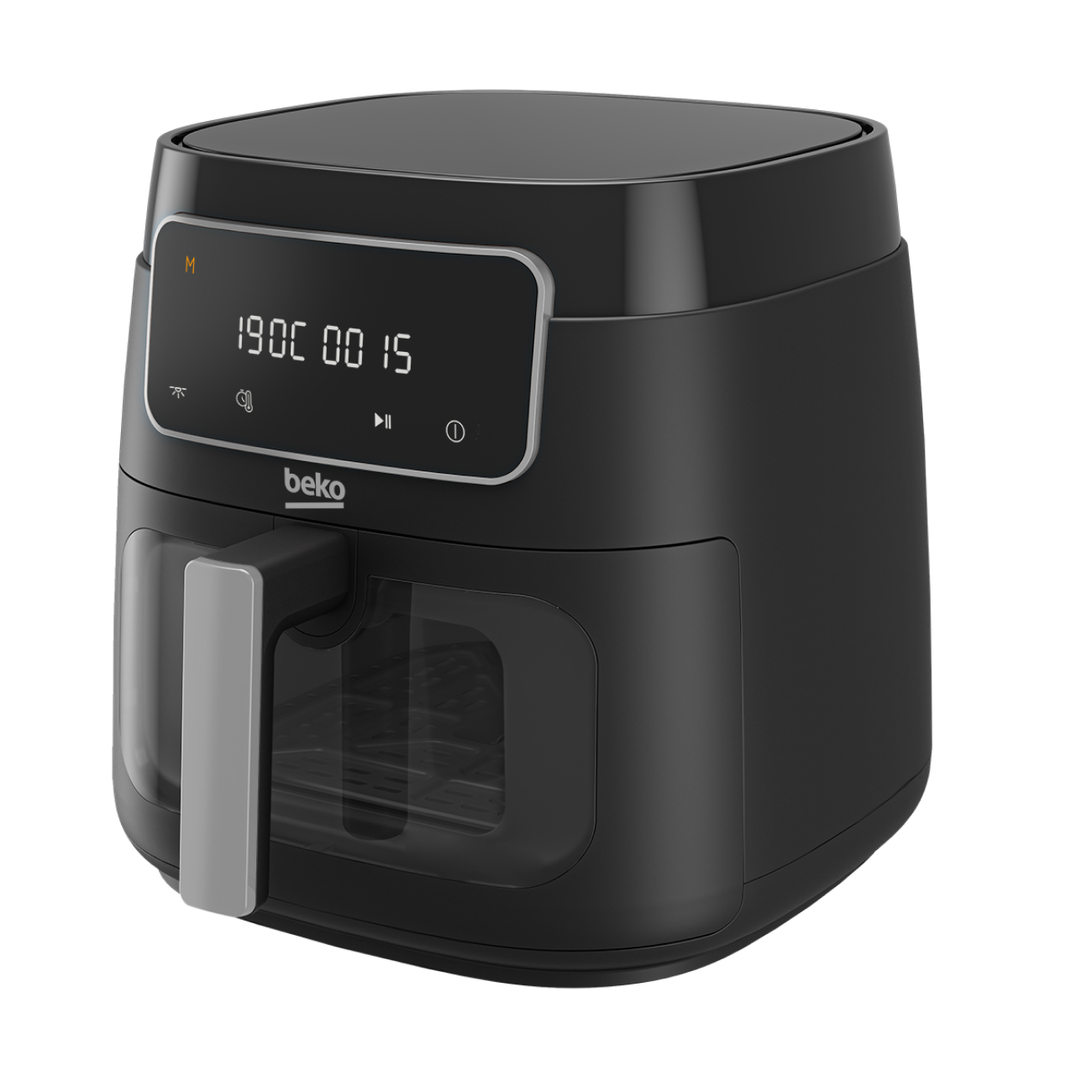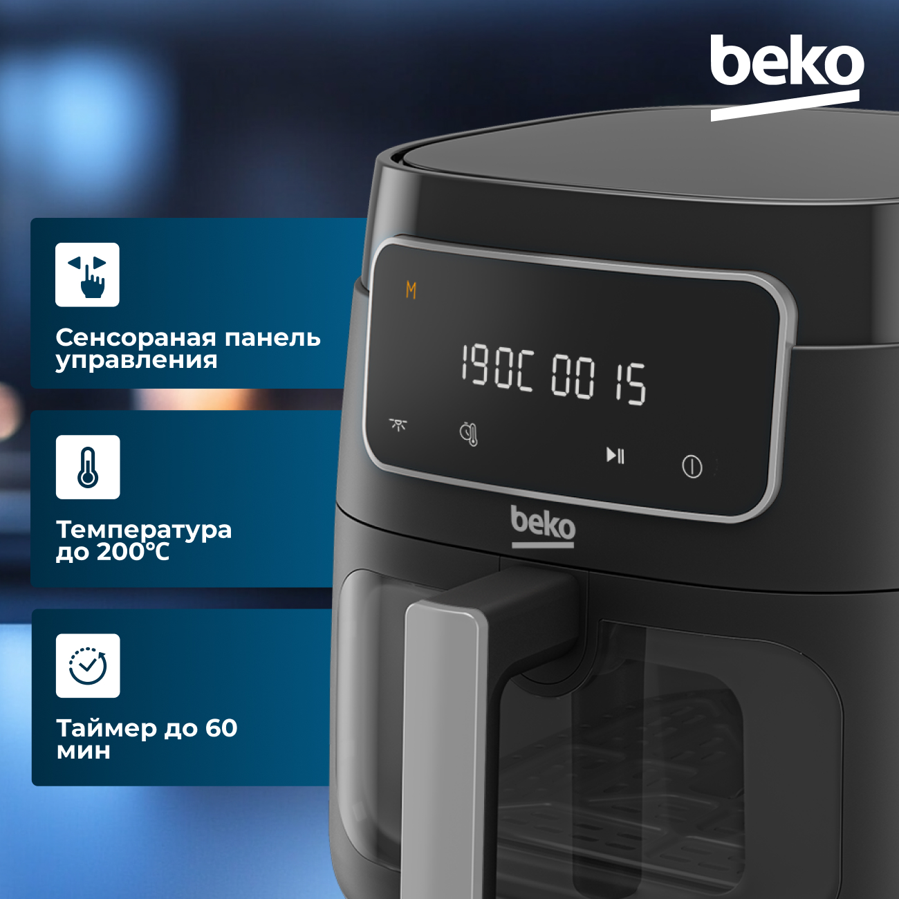 Если нужна более вместительная модель, обратите внимание на этот аэрогриль с чашей на 7,6 л и мощностью 1750 Вт, который предлагает сразу 9 программ. Здесь есть всё: классические режимы (картофель фри, выпечка, разморозка) и сушка, а также функция «Шампур», позволяющая приготовить сочное мясо или овощи. Максимальная температура достигает 200 °C, а подсветка камеры позволяет наблюдать за готовкой без лишних открываний. Управление полностью сенсорное, можно настроить таймер (до 60 минут) или использовать ручной режим. Как и в предыдущей модели, при извлечении чаши аэрогриль автоматически ставит процесс на паузу, чтобы после возвращения продолжить с теми же параметрами. Ухаживать за устройством тоже просто: антипригарное покрытие чаши легко отмывается, в том числе и в посудомоечной машине, а термоизолированная ручка и пластиковый корпус защищают от ожогов. Дополнительная решётка даёт возможность готовить на двух уровнях одновременно. Габариты остаются достаточно компактными для такого объёма, а кабель длиной 90 см удобно убирается в отсек. Двухлетняя гарантия от BEKO — ещё один плюс в пользу долговечности этого аэрогриля.