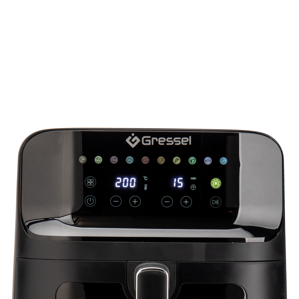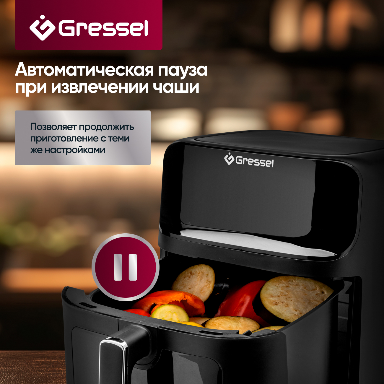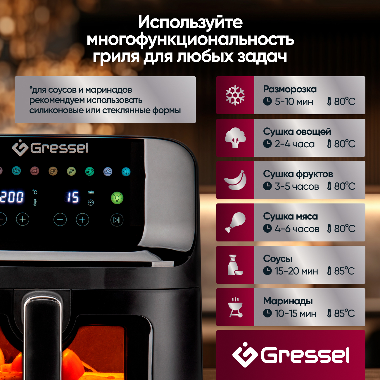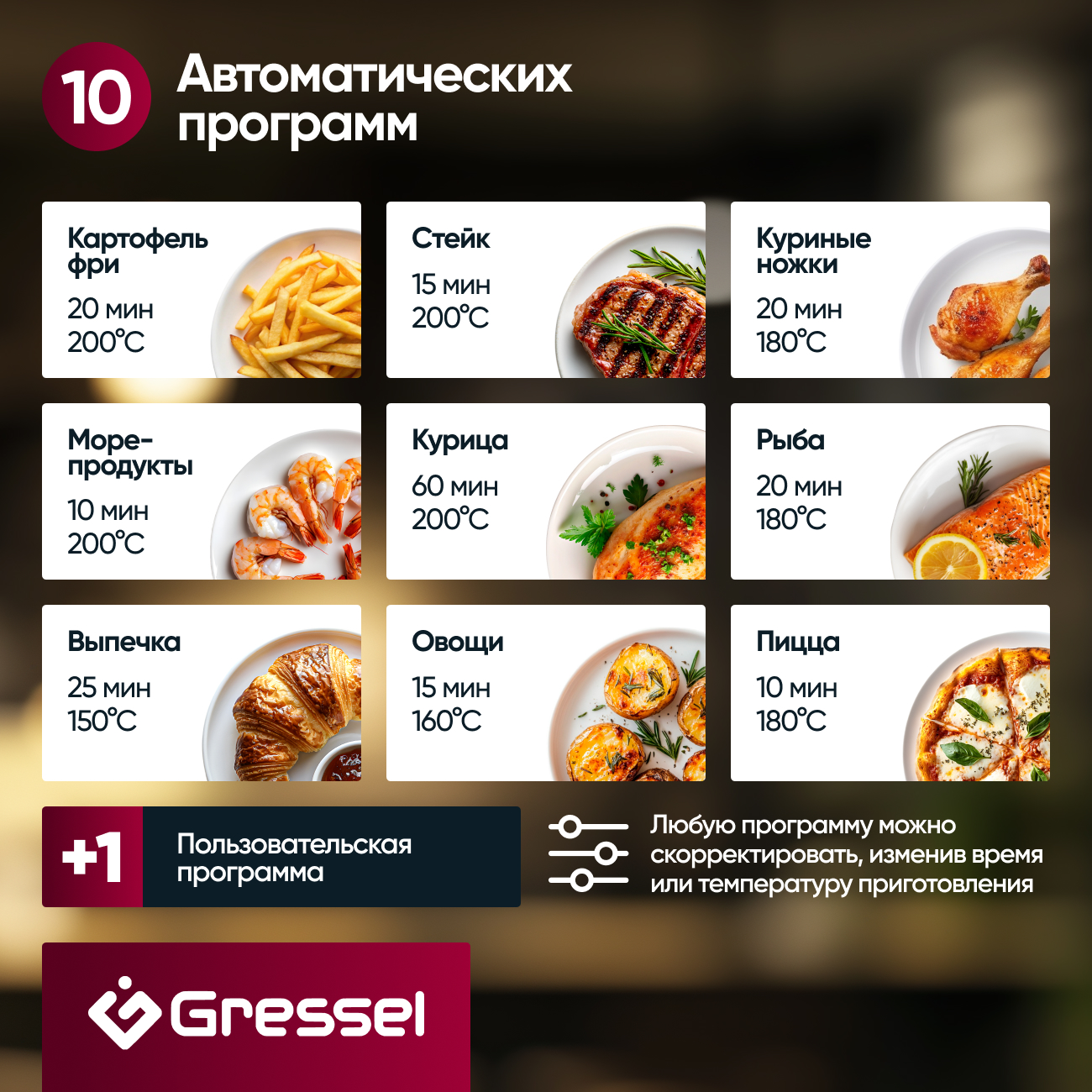 9 программ приготовления еды + 1 пользовательская: «Стейк», «Картофель фри», «Морепродукты», «Рыба», «Курица», «Куриные ножки», «Пицца», «Овощи», «Выпечка», «Пользовательская»
