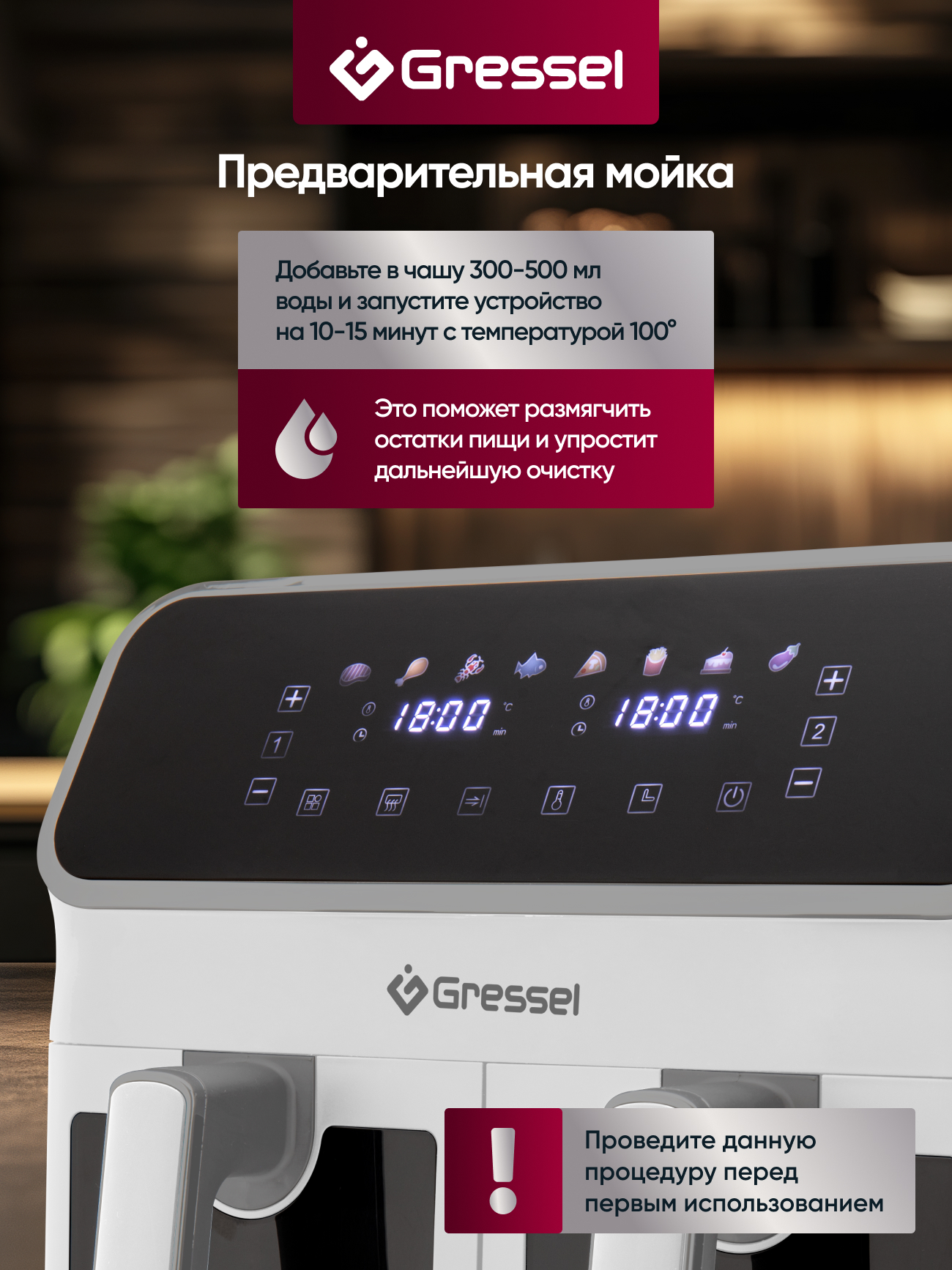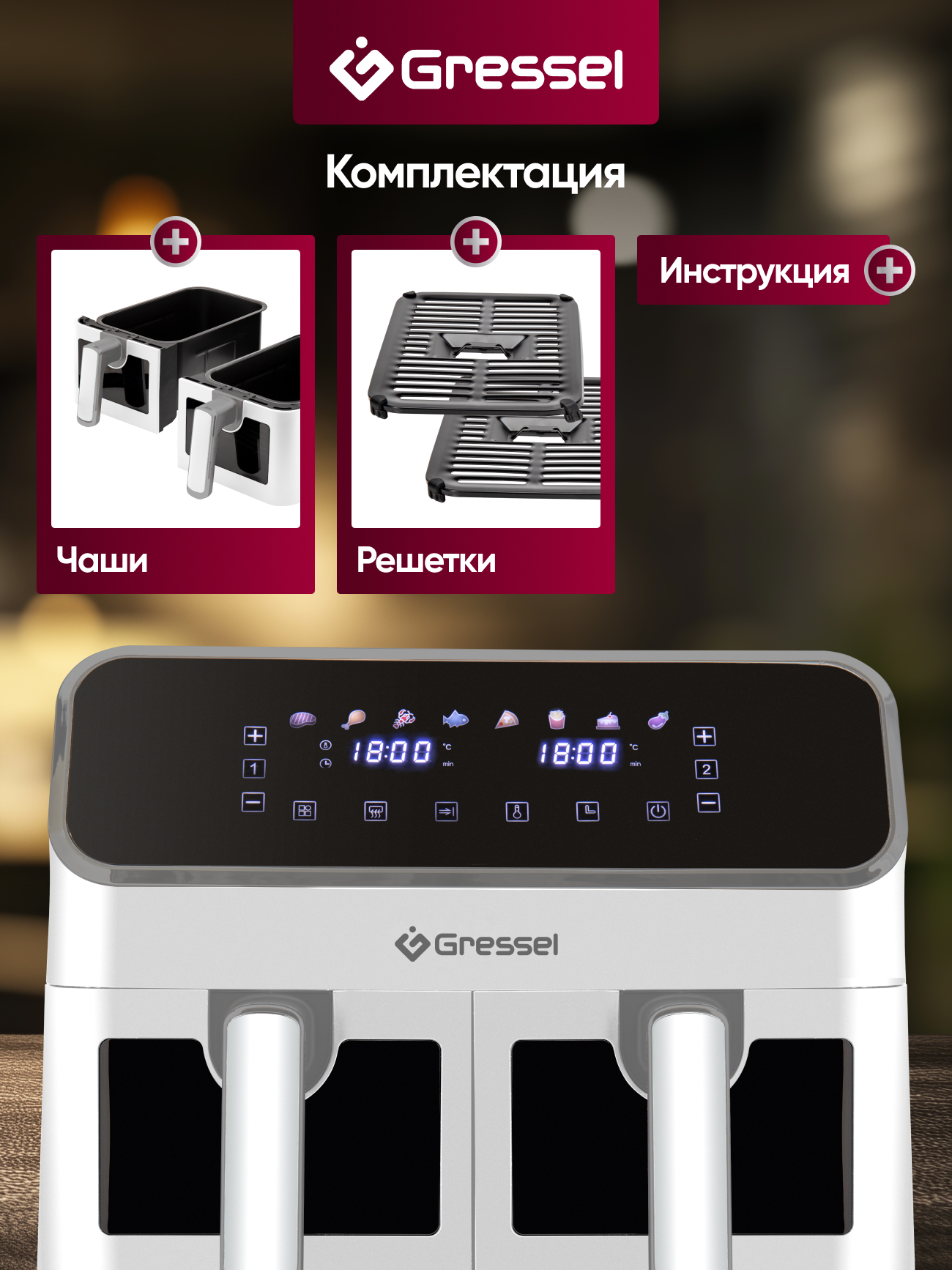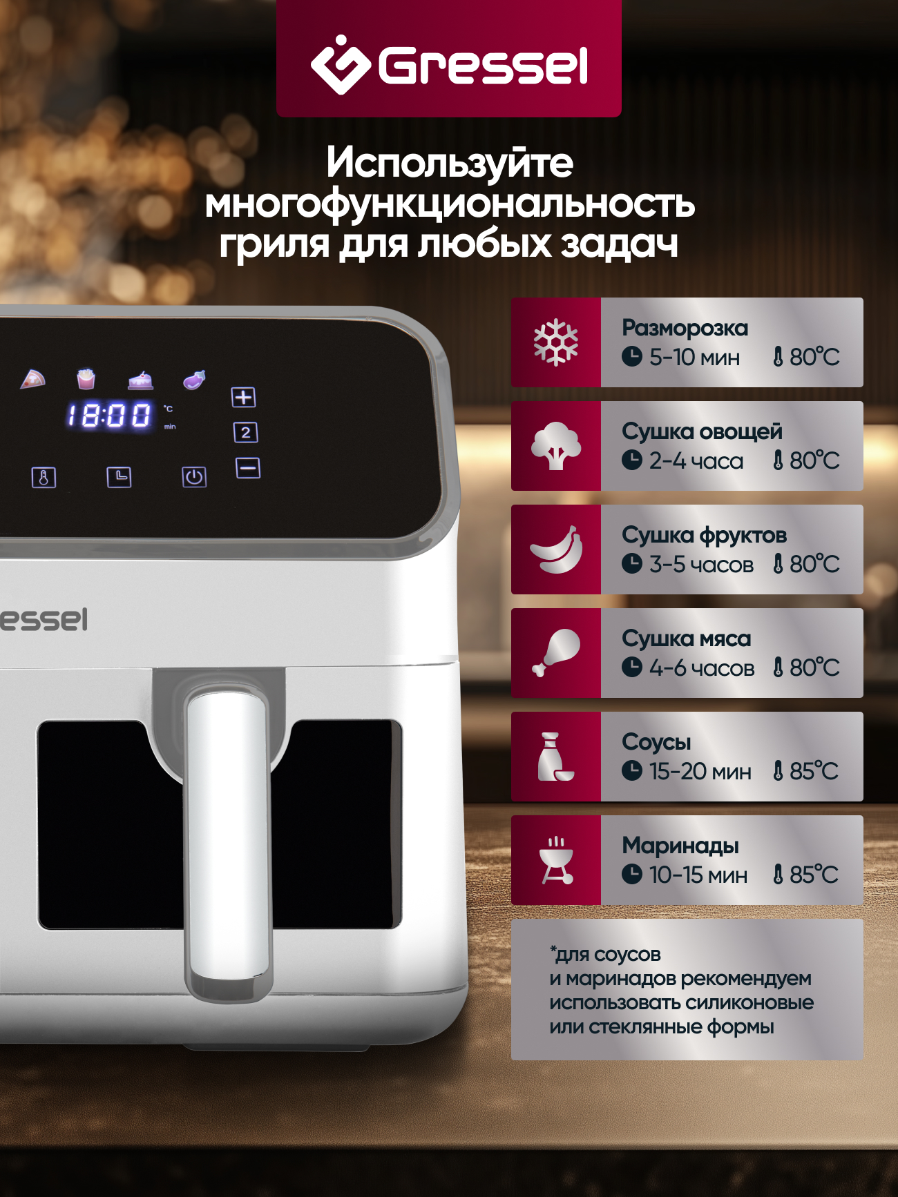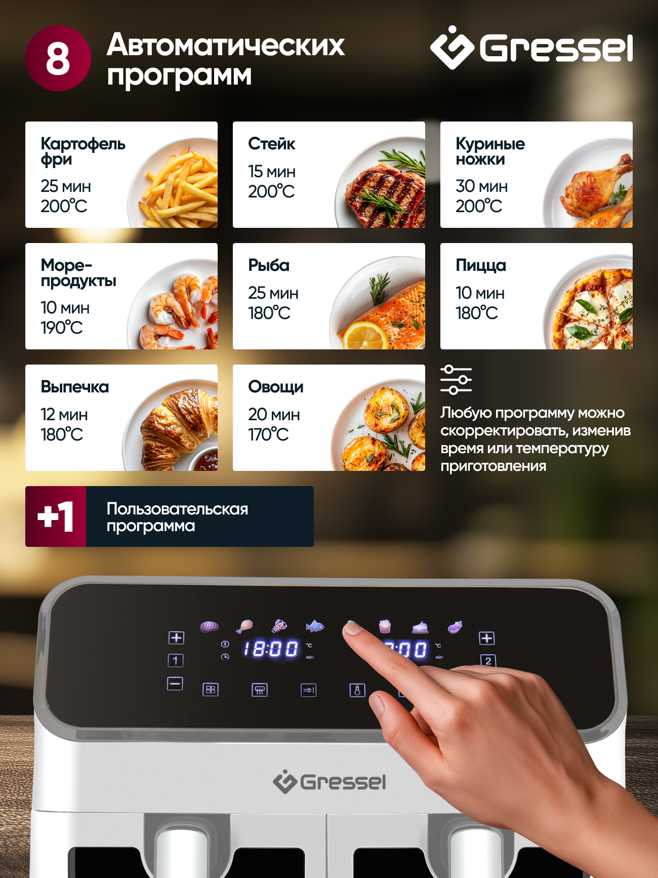 8 программ приготовления еды: «Стейк», «Куриные ножки», «Морепродукты», «Рыба», «Пицца», «Картофель фри», «Выпечка»,«Овощи»