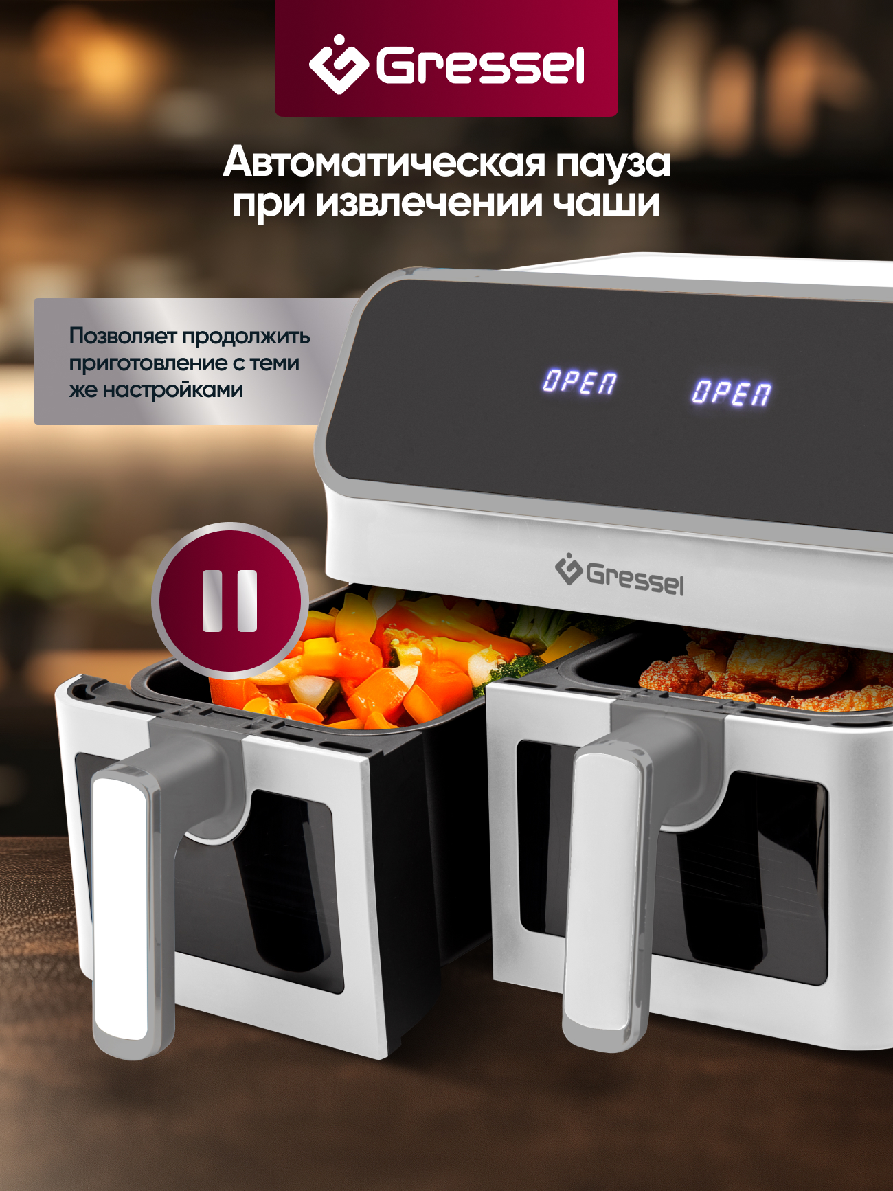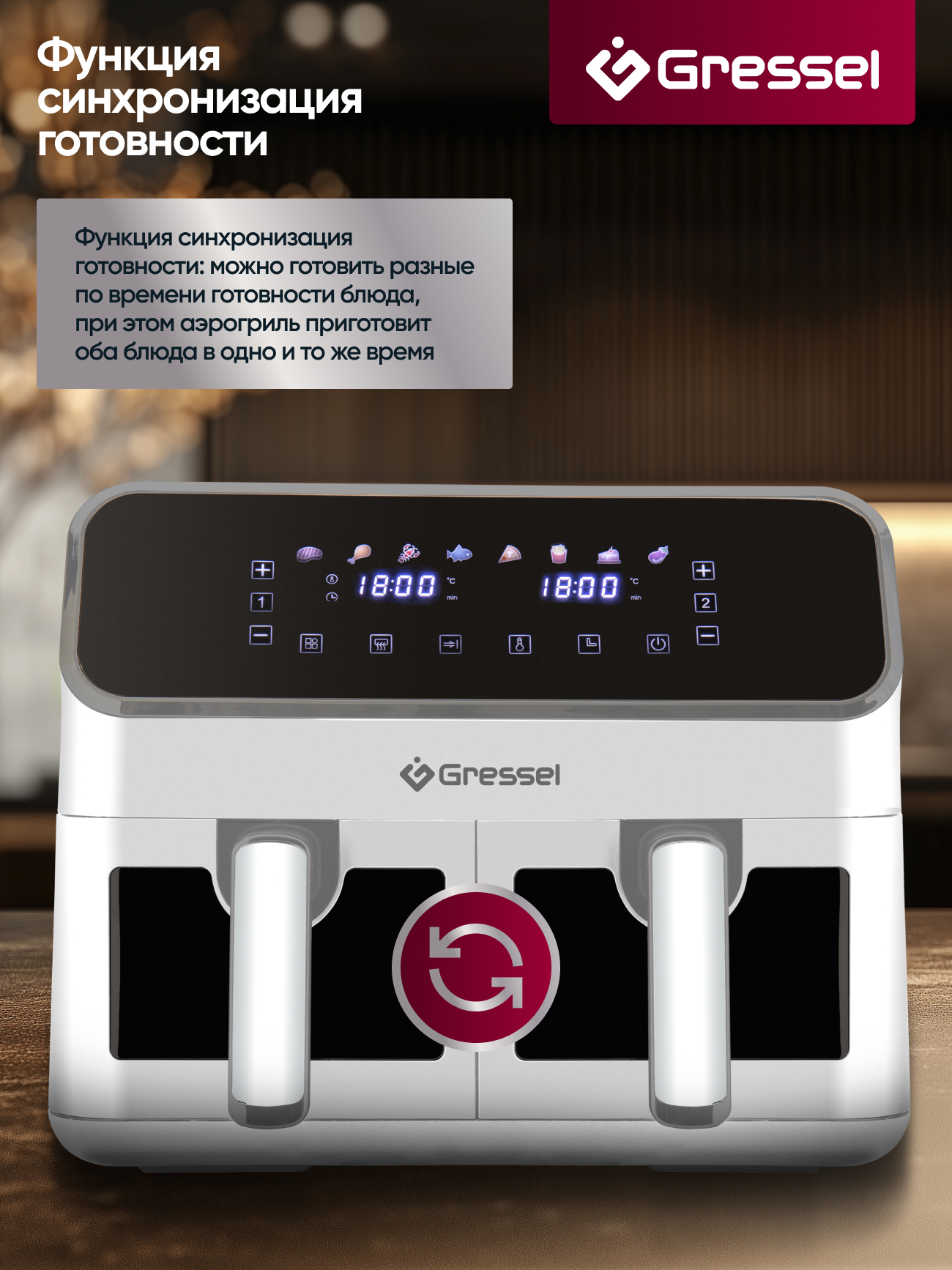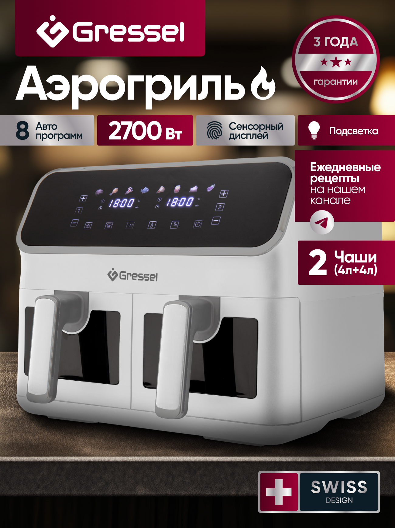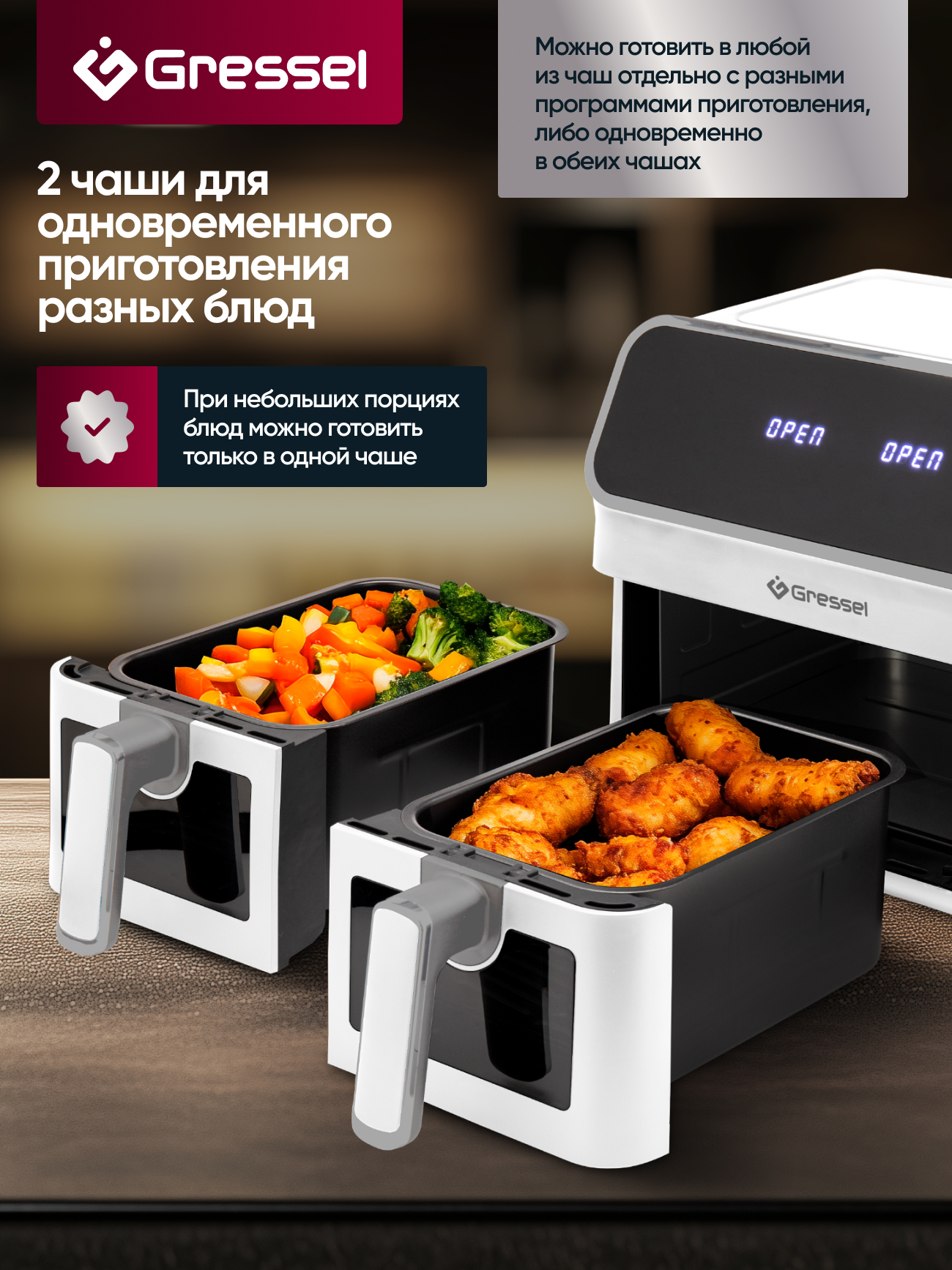 8 программ приготовления еды: «Стейк», «Куриные ножки», «Морепродукты», «Рыба», «Пицца», «Картофель фри», «Выпечка»,«Овощи»