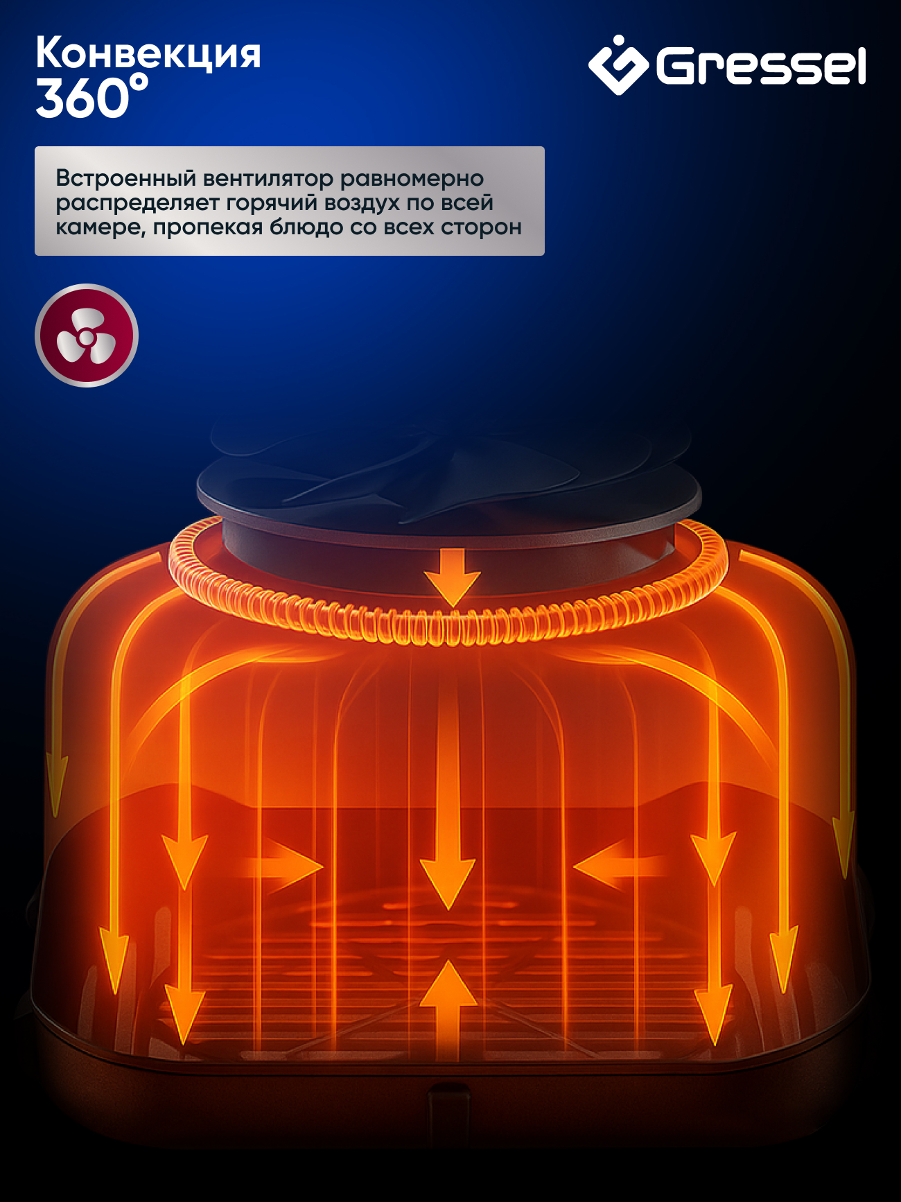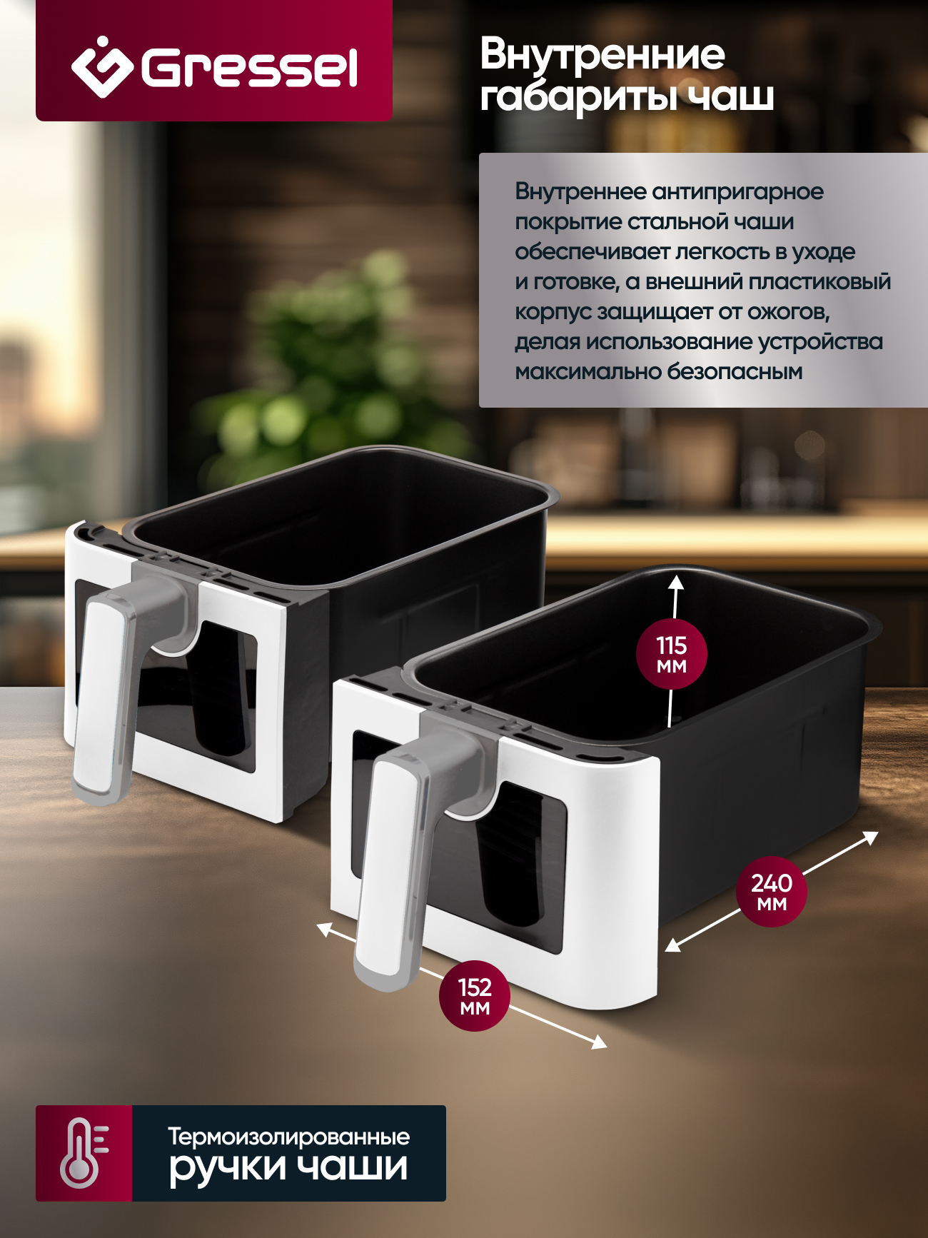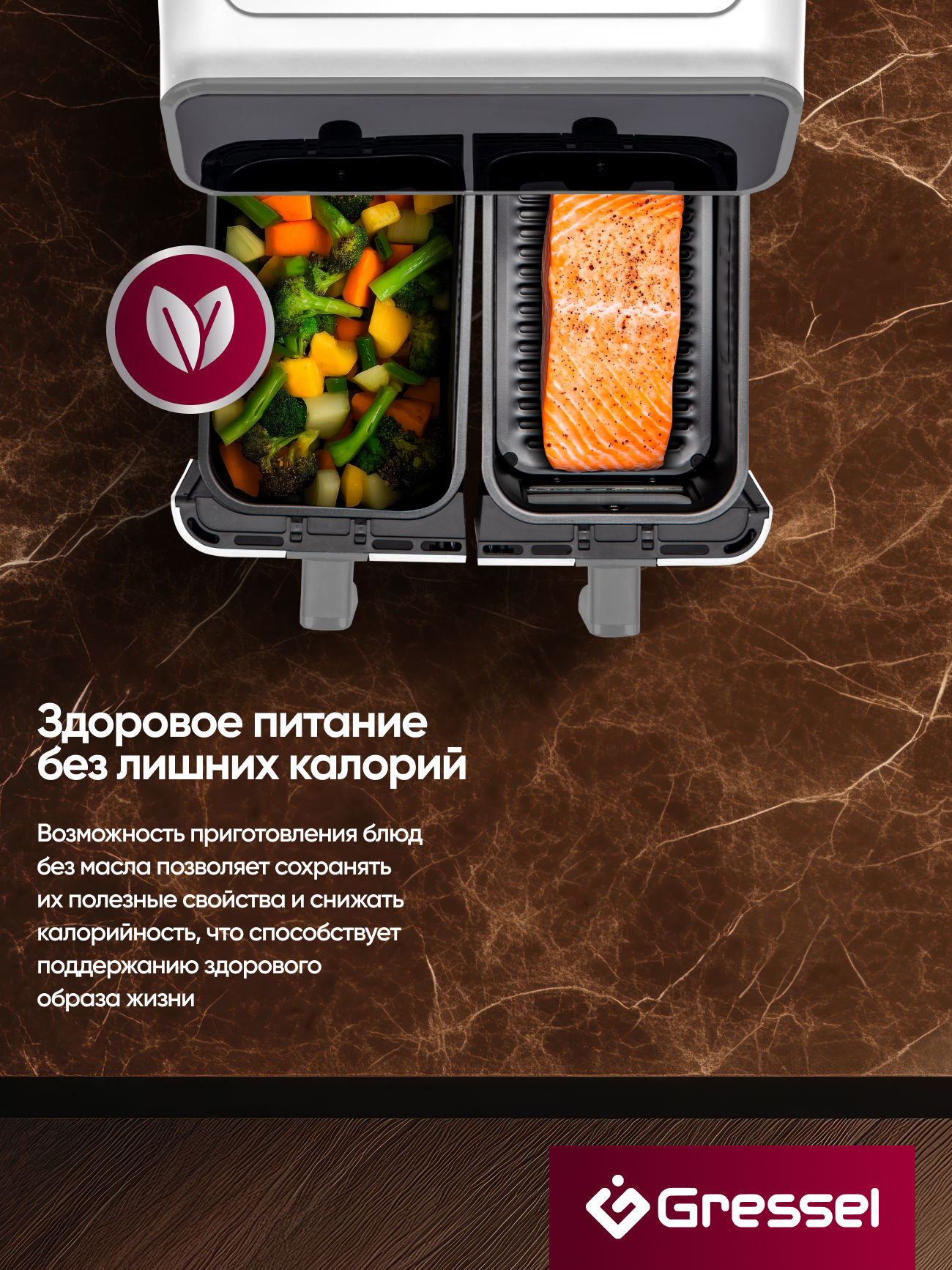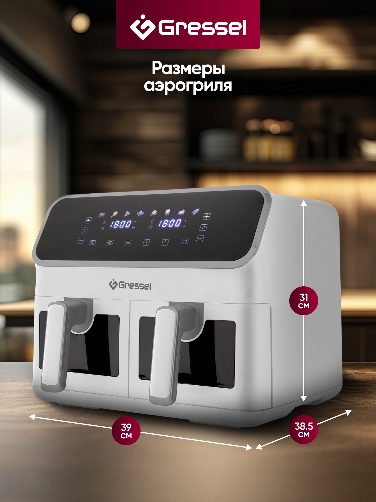 8 программ приготовления еды: «Стейк», «Куриные ножки», «Морепродукты», «Рыба», «Пицца», «Картофель фри», «Выпечка»,«Овощи»