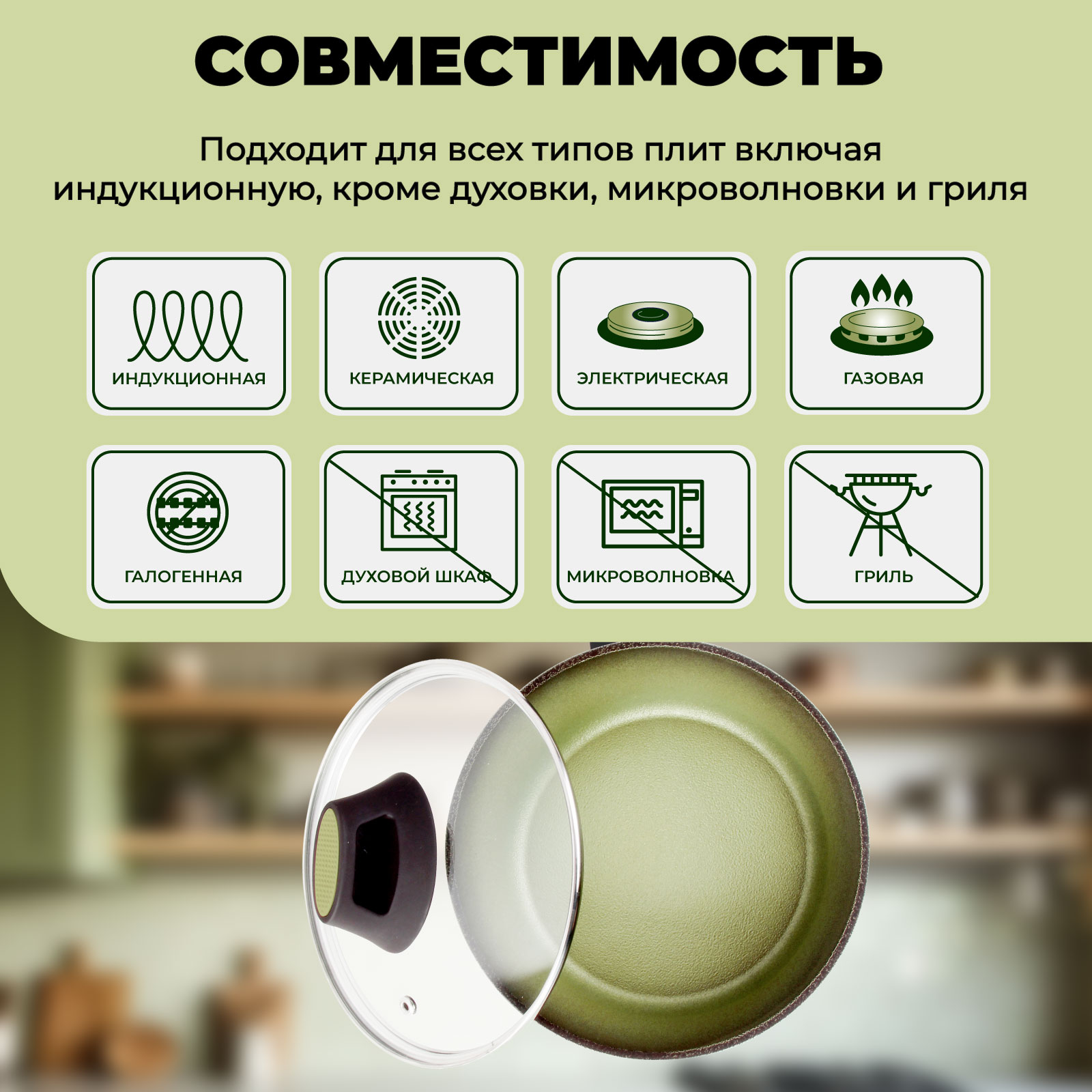 Совместимость: Подходит для всех типов плит включая индукционную, кроме духовки.