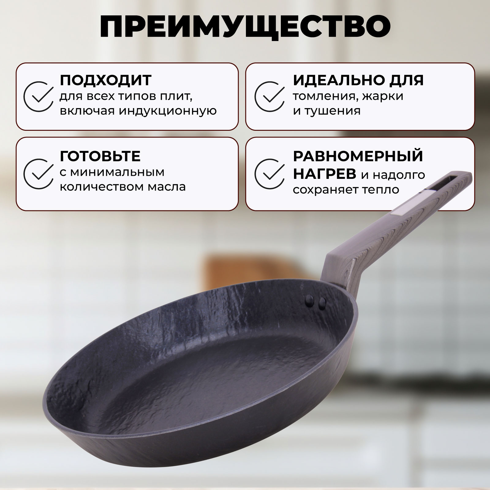 Сковорода, серия ROCKSTONE. Покрытие внутреннее: 2-х слое антипригарное Greblon С2 (устойчивое к царапинам) Покрытие внешнее: Цветной термостойкий лак (стойкий к истиранию) Тип материала: Кованный алюминий. Ручка: Деревянная, окрашенная в бакелит. Толщина стенок/толщина дна: 3,8 мм/4,0 мм Совместимость: Подходит для всех типов плит включая индукционную, кроме духовки. Рекомендуется ручная мойка для более долгого срока службы, но допускается и мытье в посудомоечной машине. Цвет: Черный, Серый.