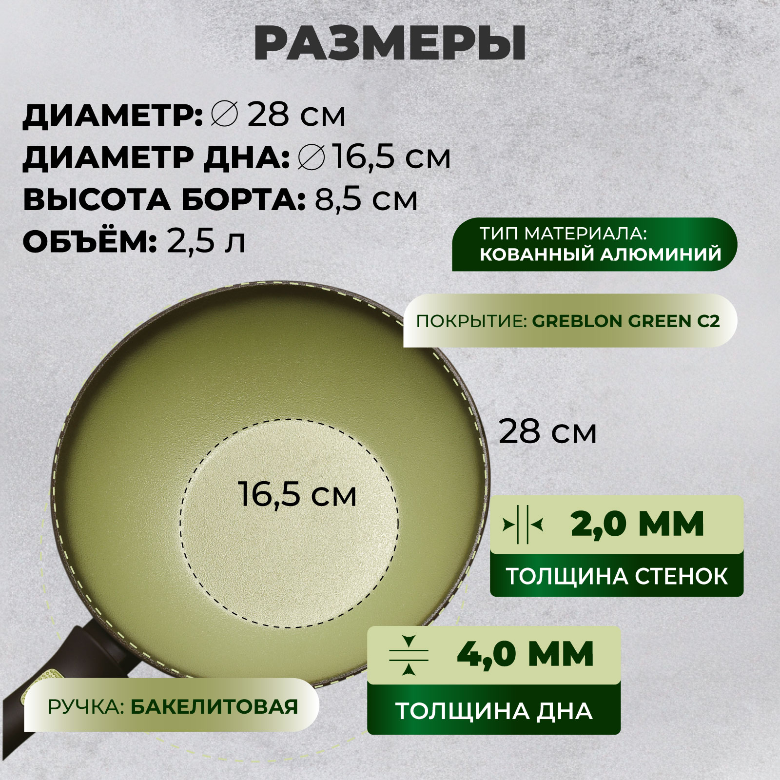 Покрытие внутреннее: Антипригарное Greblon green С2 (устойчивое к царапинам)