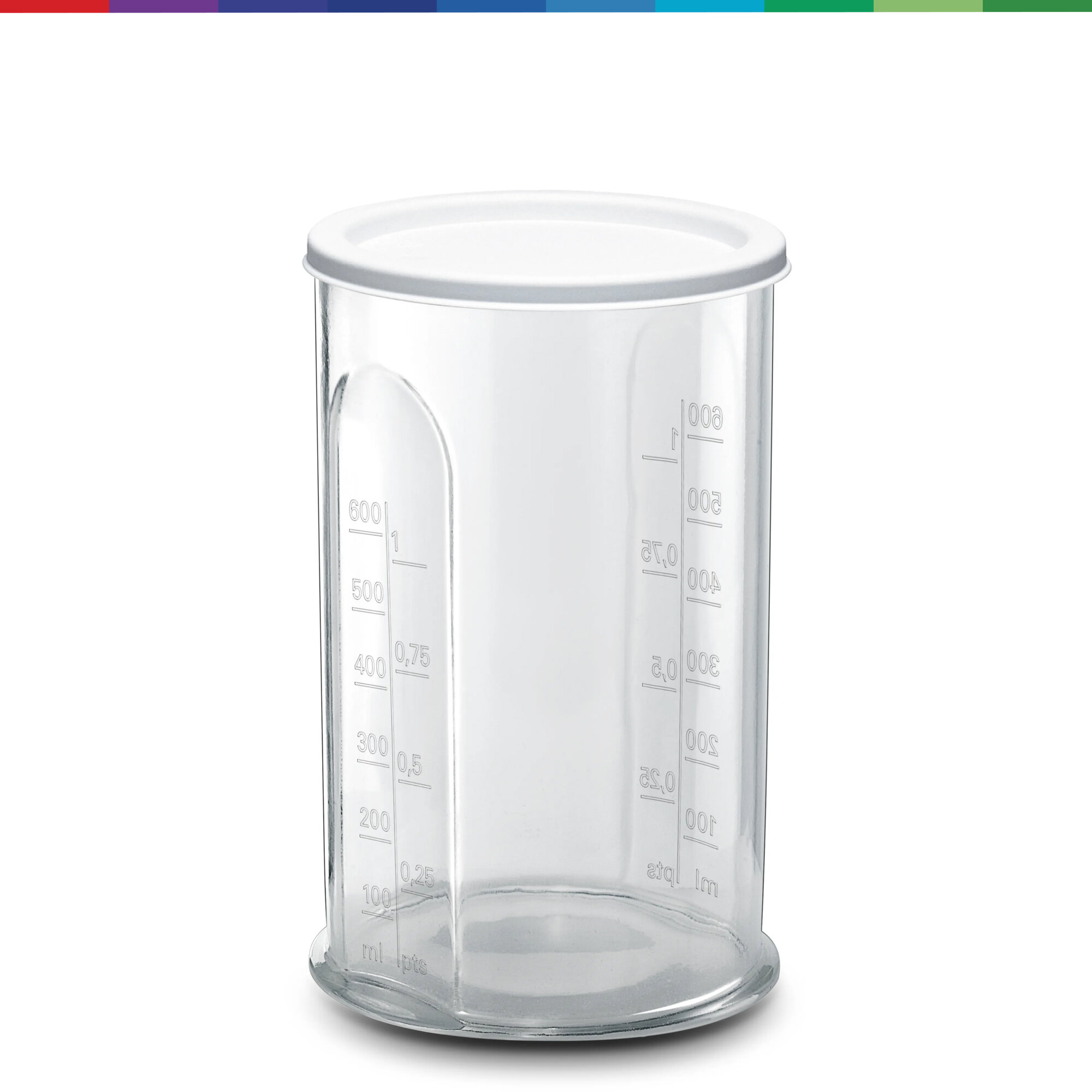 В комплекте с блендером продается мерный стакан. Его объем – 0,6 л.На корпусе есть метки, указывающие объем. Изготовлен стакан из высокопрочного пищевого пластика.Блендер имеет приятный серый цвет, благодаря которому идеально впишется в интерьер любой кухни.