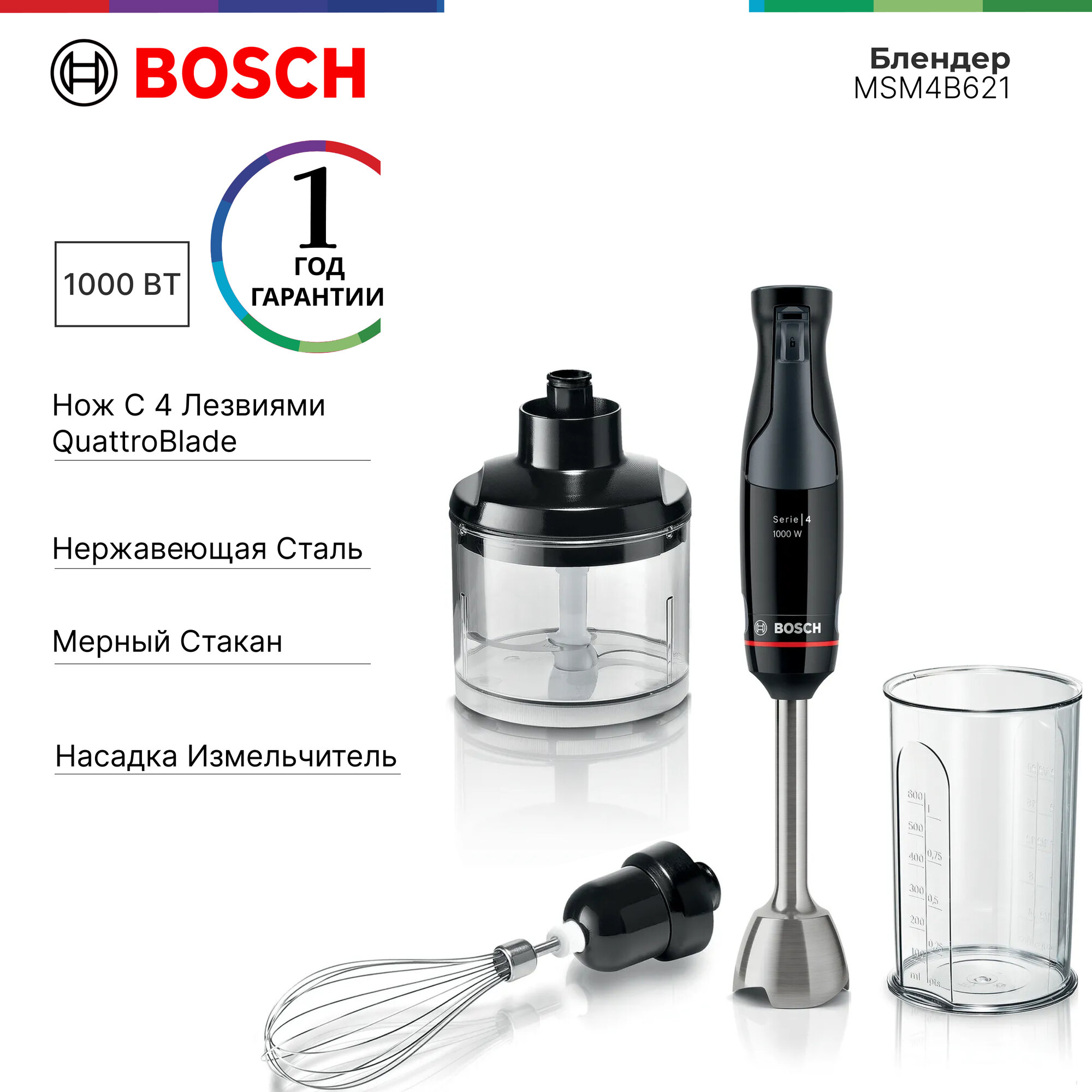 Общие характеристики: Бренд: BOSCH Модель: MSM4B621 Тип: Погружной Технические характеристики: Мощность: 1000 Вт Материалы: Материал погружной части: Нержавеющая сталь Материал ножей: Нержавеющая сталь Насадки в комплекте: Измельчитель Венчик для взбивания Особенности: Режим измельчения: Есть Мойка в посудомоечной машине: Да, можно мыть съемные части Мерный стакан: Есть Электропитание: Электропитание: От сети Корпус: Материал корпуса: Пластик Цвет: Черный Габариты и вес: Размеры (ШхВхГ): 57 x 385 x 78 мм Вес товара: 1,3 кг Упаковка: Габариты упаковки (ДхШхВ): 0.201 x 0.139 x 0.429 м Вес упаковки: 1,76 кг Блендер BOSCH MSM4B621 оснащен мощным мотором и высококачественными насадками, которые позволяют измельчать, взбивать и смешивать ингредиенты с легкостью. Прочные материалы и возможность мыть съемные части в посудомоечной машине обеспечивают долговечность и удобство в уходе. Этот блендер станет незаменимым помощником на вашей кухне, позволяя быстро и легко готовить любимые блюда.
