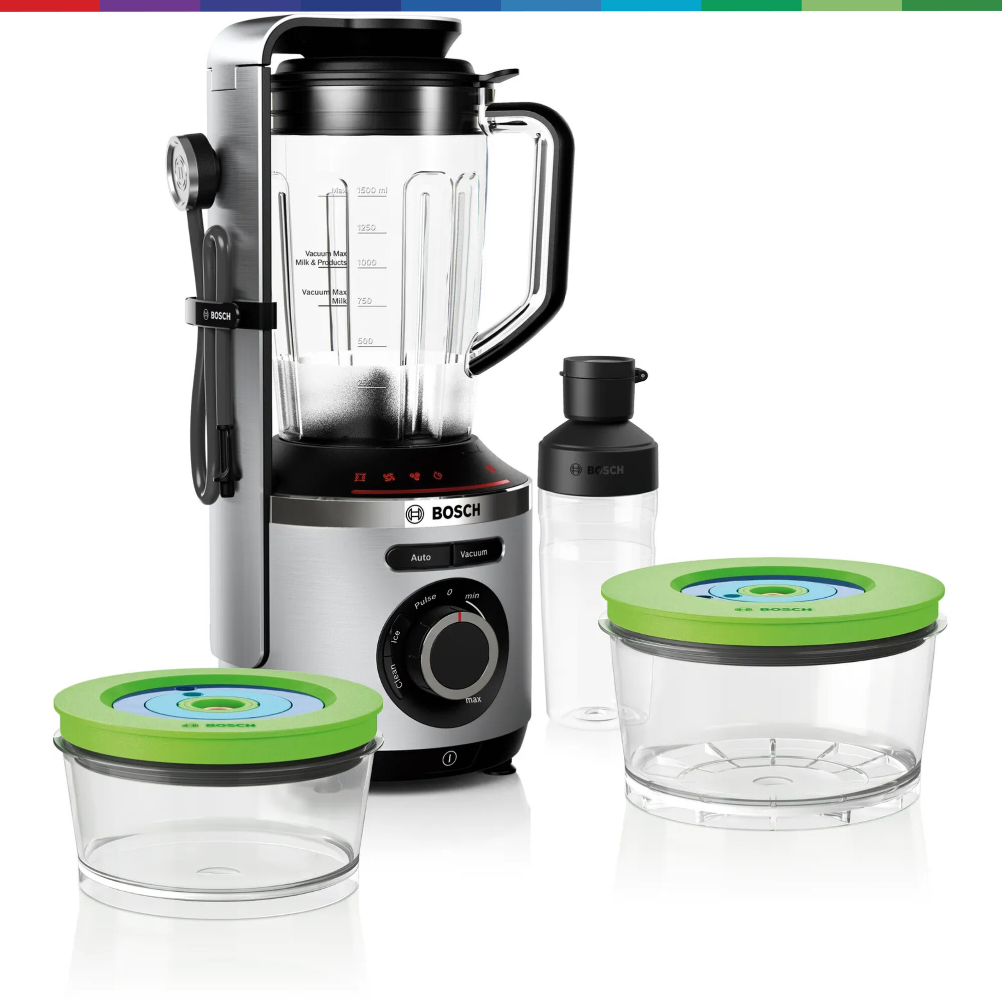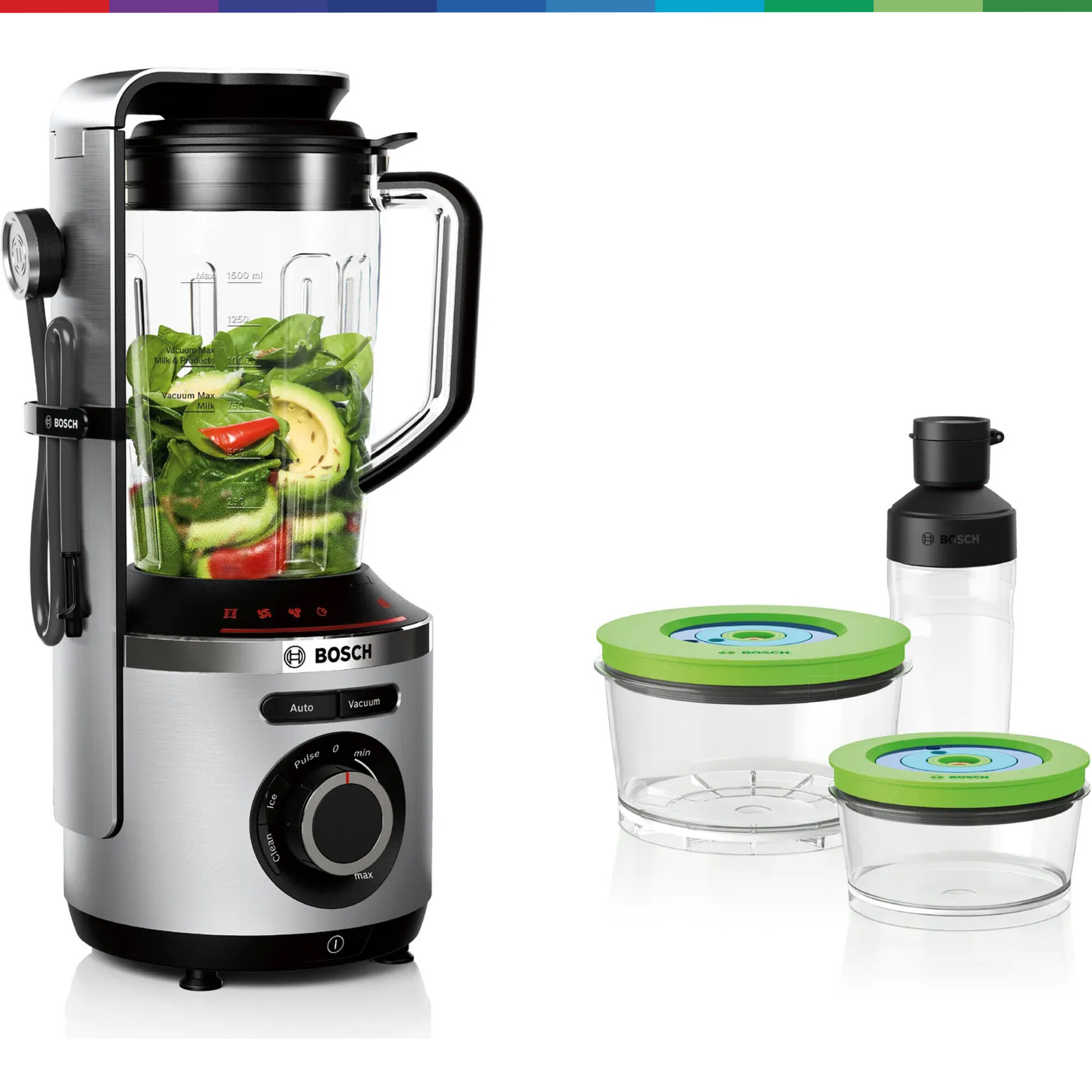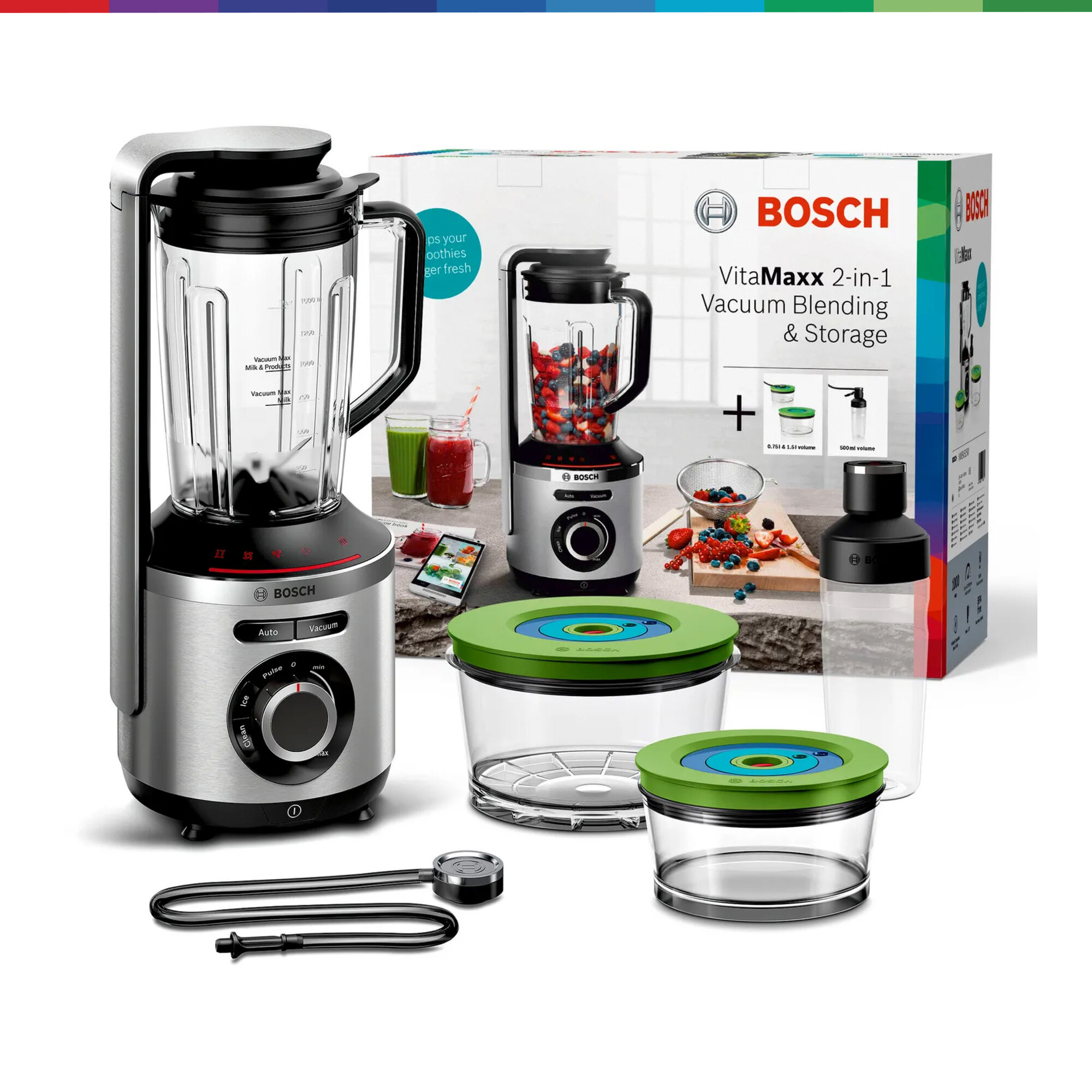 Живи со свежестью VitaMaxx. Вакуумный блендер Bosch VitaMaxx - идеальный партнер для здорового образа жизни. Блендер VitaMaxx от Bosch гарантирует 100% блестящий результат: смузи имеет нежную и однородную консистенцию, выглядит более привлекательно, сохраняется натуральный цвет продуктов. Кроме того, напитки дольше остаются свежими! При смешивании в вакууме фрукты и овощи защищены от окисления, поэтому витамин С и другие питательные вещества сохраняются дольше, чем при смешивании обычным методом без вакуума. Премиальный дизайн, корпус из высококачественного алюминия. Легко справляется с измельчением и смешиванием благодаря мощному мотору 1000 Вт и высокой скорости вращения до 37.000 оборотов в минуту. Благодаря насосу мощностью 75 кПа, в чаше для смешивания создается вакуум, позволяющий смешивать ингредиенты с минимальным окислением. В результате достигается более длительное сохранение витамина С и других чувствительных к кислороду витаминов. Смузи, приготовленный с Bosch VitaMaxx, сохраняет до 5 раз больше витамина С спустя 24 часа по сравнению с обычным смешиванием без вакуумирования. Острый нож из нержавеющей стали с шестью лезвиями, вращающийся со скоростью до 37 000 об/мин и мощность 1000 Вт - для однородного и тщательного измельчения. Бесступенчатая регулировка скорости, световая индикация и импульсный режим. VitaMaxx оснащен 4-мя автоматическими программами - для колки льда, очистки блендера, Auto (Вакуумизация + Смешивание), Vacuum (создание вакуума - для вакуумизации напитков и продуктов в контейнерах и бутылочке ToGo). 1,5 л чаша блендера (полезный объем) выполнена из прочного пластика тритан - безопасного для здоровья, без запаха, легкого и прочного. Все пластиковые элементы, контактирующие с продуктами, не содержат Бисфенол-А (BPA). Легкий уход за блендером - чашу, нож, крышку и контейнеры можно мыть в посудомоечной машине. Аксессуары в комплекте: 2 вакуумных контейнера объёмом 1,5 л и 0,75 л, а также вакуумная бутылка 2Go (0,5 л) дольше сохраняют продукты свежими, практичная вакуумная бутылка ToGo позволяет взять готовые смузи с собой и насладиться ими в дороге, брошюра с рецептами разнообразных напитков, вкусных и полезных для здоровья.
