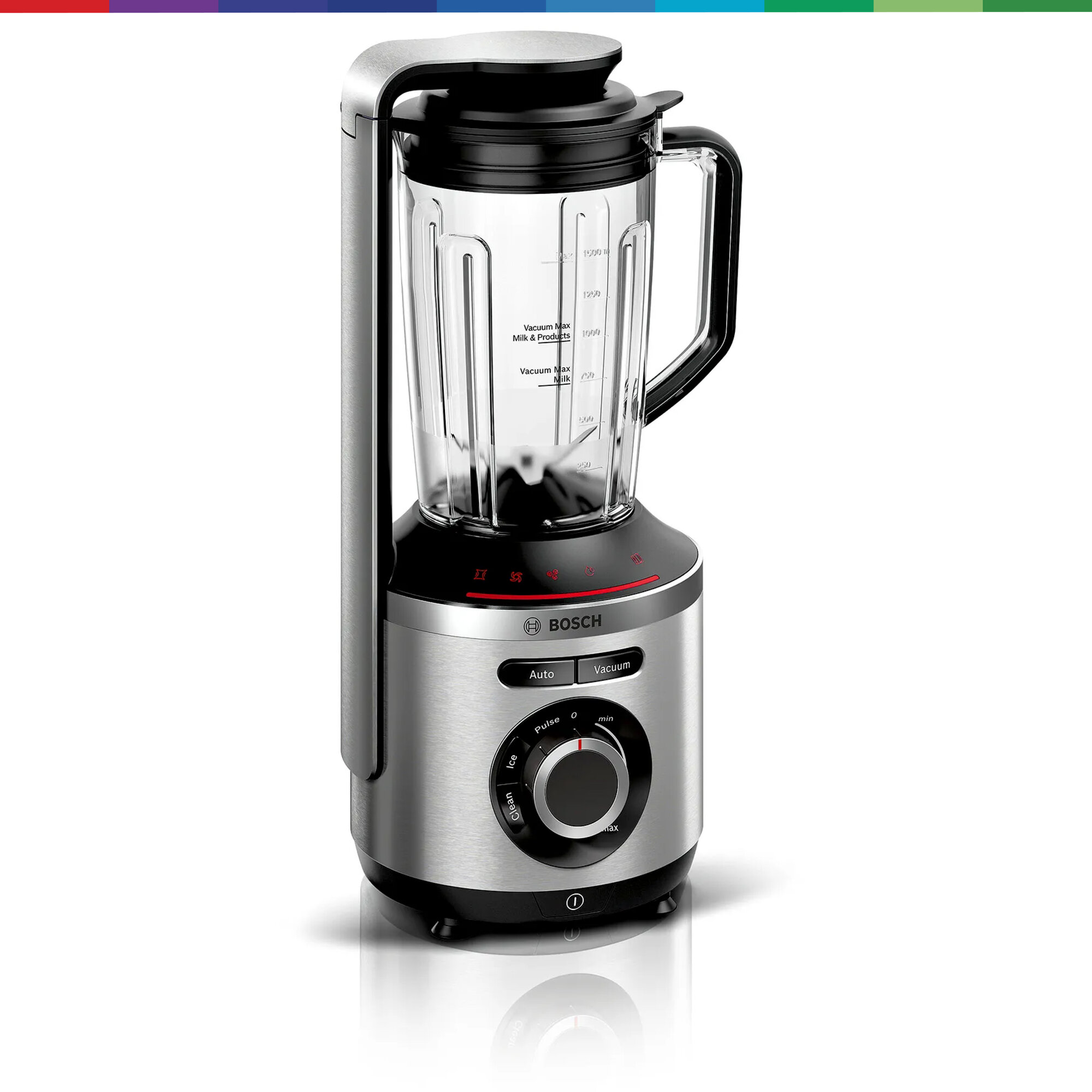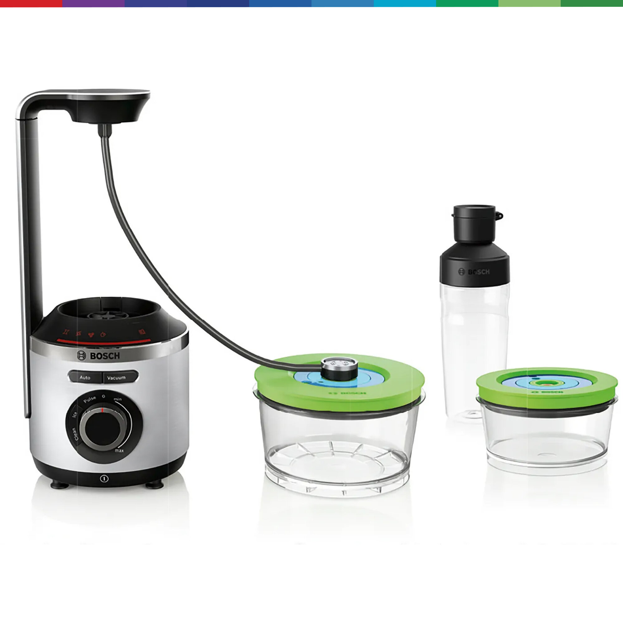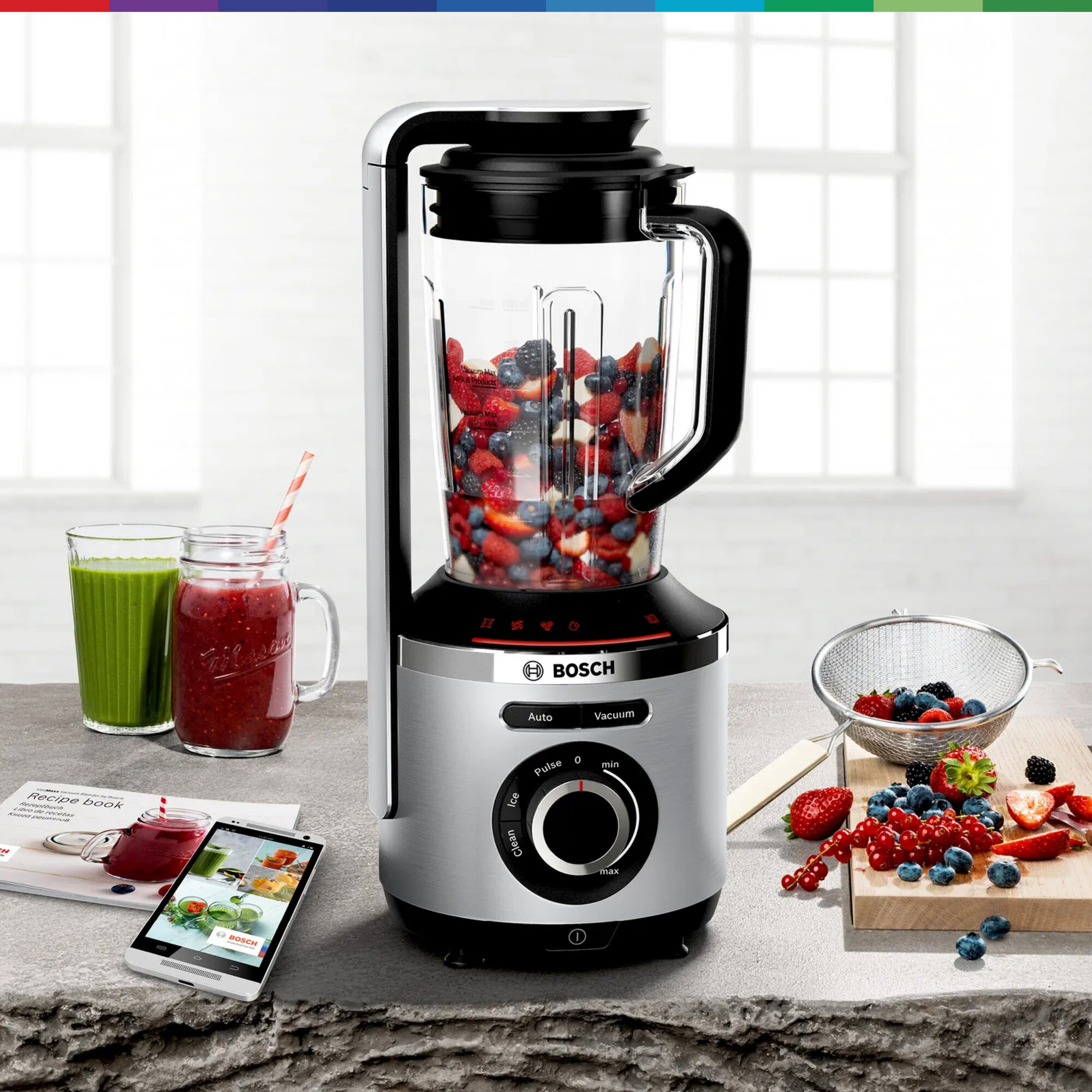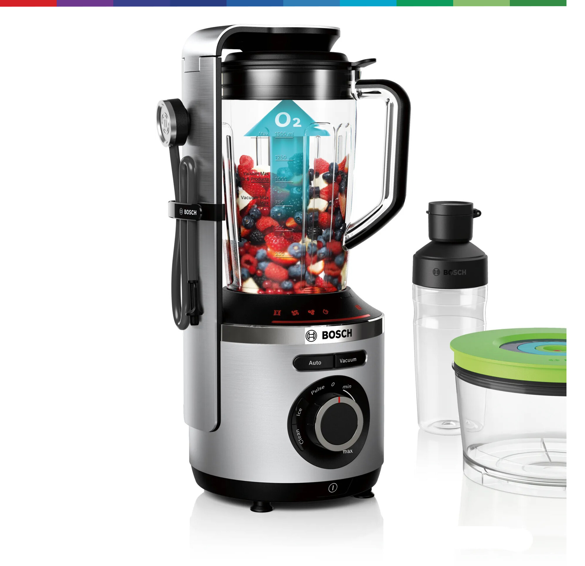 Живи со свежестью VitaMaxx. Вакуумный блендер Bosch VitaMaxx - идеальный партнер для здорового образа жизни. Блендер VitaMaxx от Bosch гарантирует 100% блестящий результат: смузи имеет нежную и однородную консистенцию, выглядит более привлекательно, сохраняется натуральный цвет продуктов. Кроме того, напитки дольше остаются свежими! При смешивании в вакууме фрукты и овощи защищены от окисления, поэтому витамин С и другие питательные вещества сохраняются дольше, чем при смешивании обычным методом без вакуума. Премиальный дизайн, корпус из высококачественного алюминия. Легко справляется с измельчением и смешиванием благодаря мощному мотору 1000 Вт и высокой скорости вращения до 37.000 оборотов в минуту. Благодаря насосу мощностью 75 кПа, в чаше для смешивания создается вакуум, позволяющий смешивать ингредиенты с минимальным окислением. В результате достигается более длительное сохранение витамина С и других чувствительных к кислороду витаминов. Смузи, приготовленный с Bosch VitaMaxx, сохраняет до 5 раз больше витамина С спустя 24 часа по сравнению с обычным смешиванием без вакуумирования. Острый нож из нержавеющей стали с шестью лезвиями, вращающийся со скоростью до 37 000 об/мин и мощность 1000 Вт - для однородного и тщательного измельчения. Бесступенчатая регулировка скорости, световая индикация и импульсный режим. VitaMaxx оснащен 4-мя автоматическими программами - для колки льда, очистки блендера, Auto (Вакуумизация + Смешивание), Vacuum (создание вакуума - для вакуумизации напитков и продуктов в контейнерах и бутылочке ToGo). 1,5 л чаша блендера (полезный объем) выполнена из прочного пластика тритан - безопасного для здоровья, без запаха, легкого и прочного. Все пластиковые элементы, контактирующие с продуктами, не содержат Бисфенол-А (BPA). Легкий уход за блендером - чашу, нож, крышку и контейнеры можно мыть в посудомоечной машине. Аксессуары в комплекте: 2 вакуумных контейнера объёмом 1,5 л и 0,75 л, а также вакуумная бутылка 2Go (0,5 л) дольше сохраняют продукты свежими, практичная вакуумная бутылка ToGo позволяет взять готовые смузи с собой и насладиться ими в дороге, брошюра с рецептами разнообразных напитков, вкусных и полезных для здоровья.
