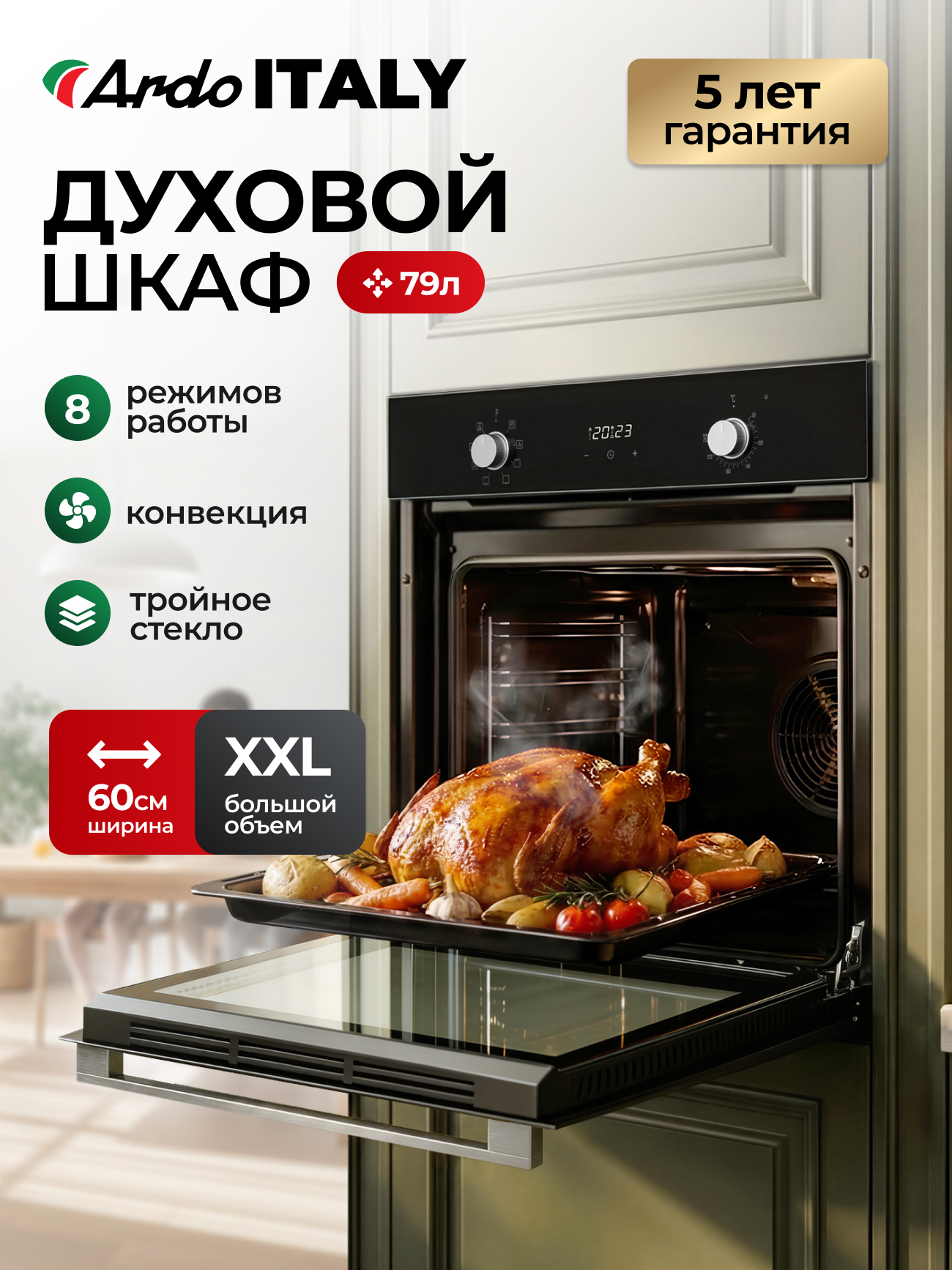 Духовой электрический шкаф Ardo BO28EB2 79 л, 8 режимов работы, конвекция, дисплей, утапливаемые ручки, три стекла