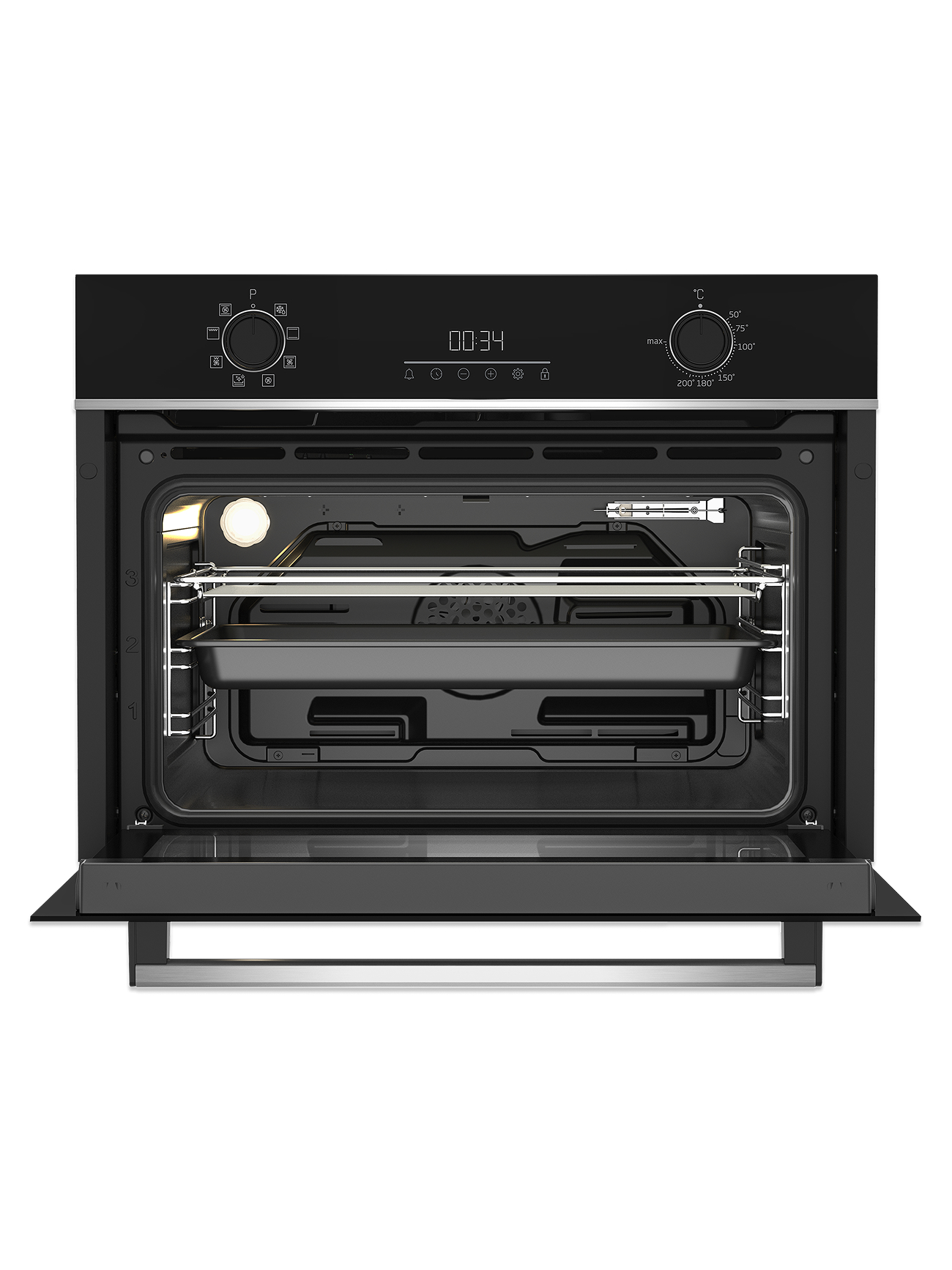 Встроен электрический гриль. Максимальная температура нагрева достигает 250°С. Электронный таймер позволяет установить время приготовления, по завершении которого прозвучит сигнал и сработает система автоотключения. Внутреннее освещение позволяет следить за процессом приготовления, не открывая дверь.