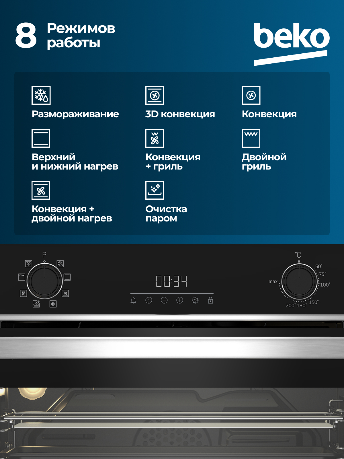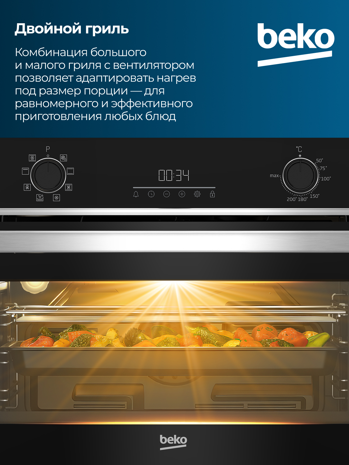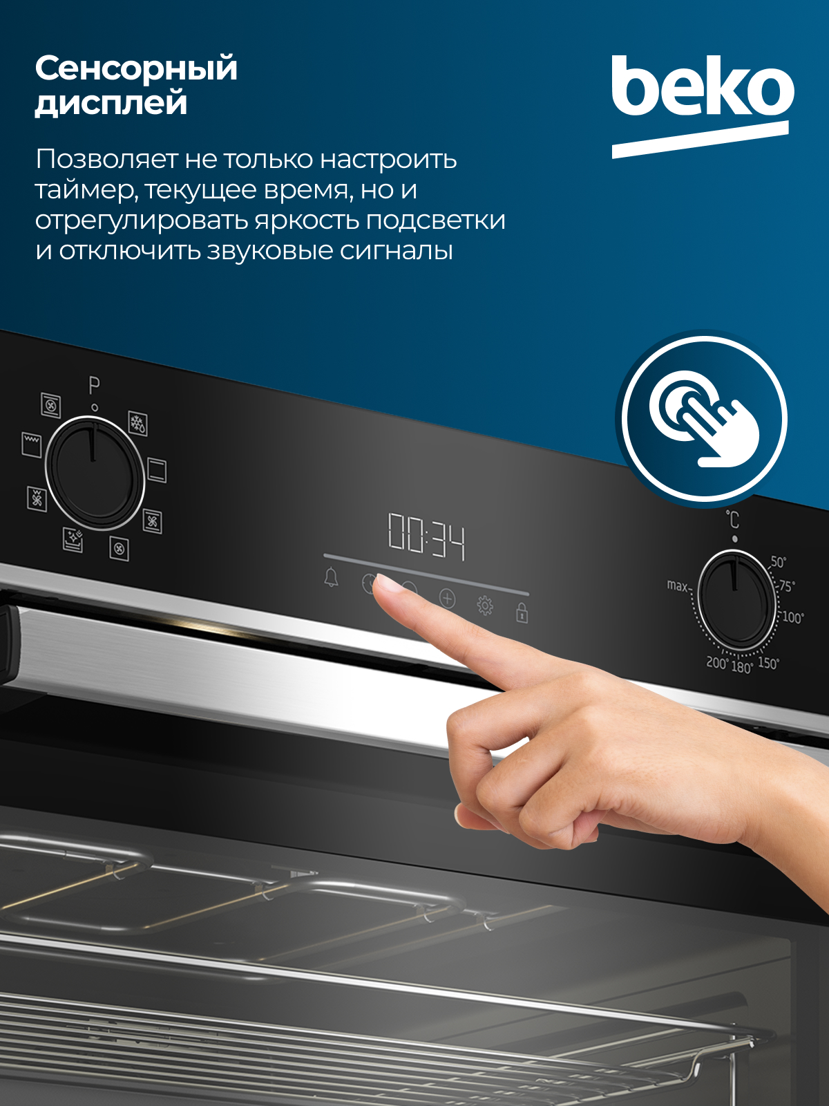 Электрический духовой шкаф Beko, черный с серебристой фурнитурой оборудован электромеханическим блоком управления. Панель представлена дисплеем с сенсорными кнопками и утопленными поворотными регуляторами. На экране отображаются включение, режим, текущее время, параметры таймера. Доступна блокировка панели.