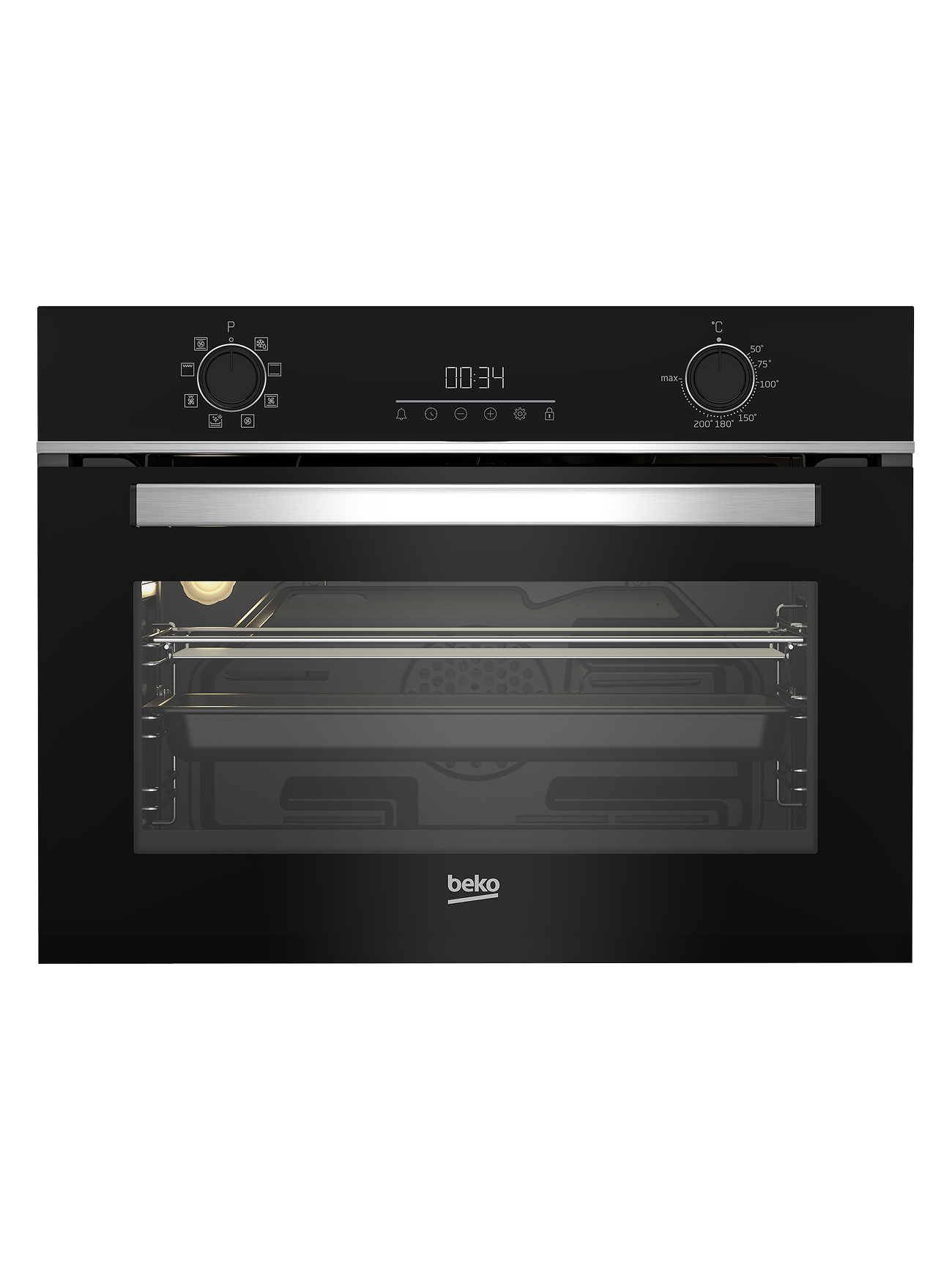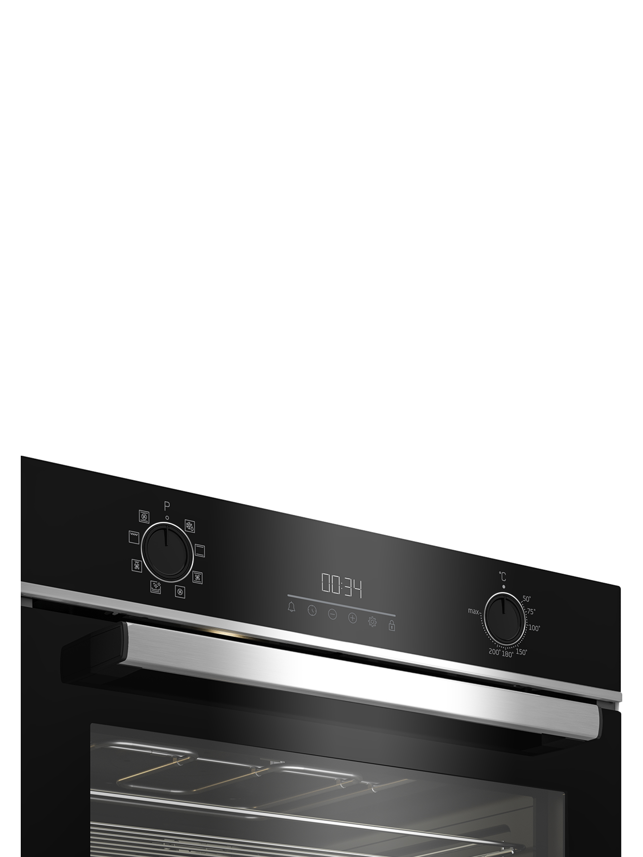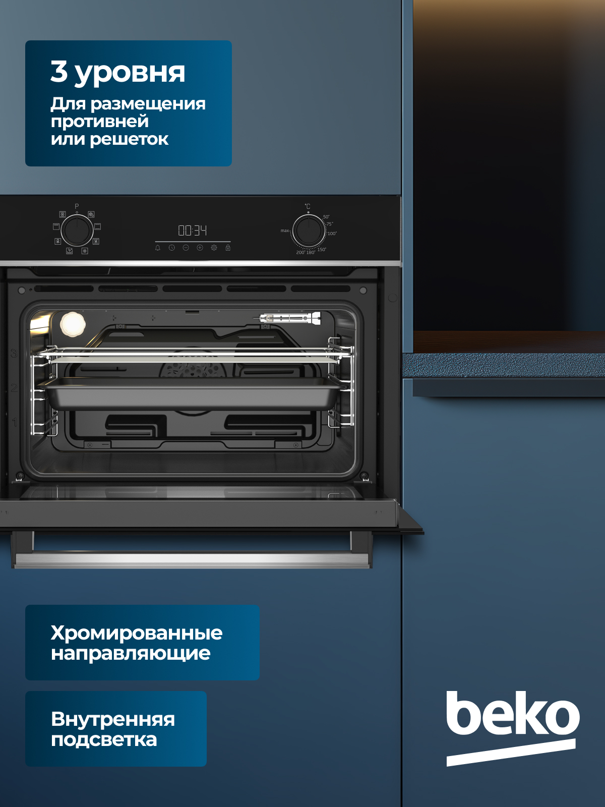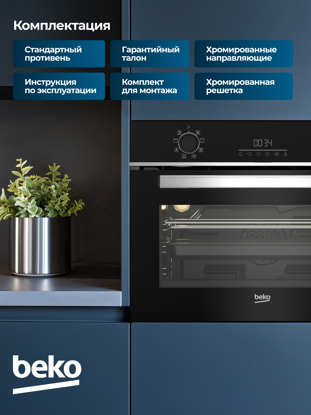 Электрический духовой шкаф Beko, черный с серебристой фурнитурой оборудован электромеханическим блоком управления. Панель представлена дисплеем с сенсорными кнопками и утопленными поворотными регуляторами. На экране отображаются включение, режим, текущее время, параметры таймера. Доступна блокировка панели.