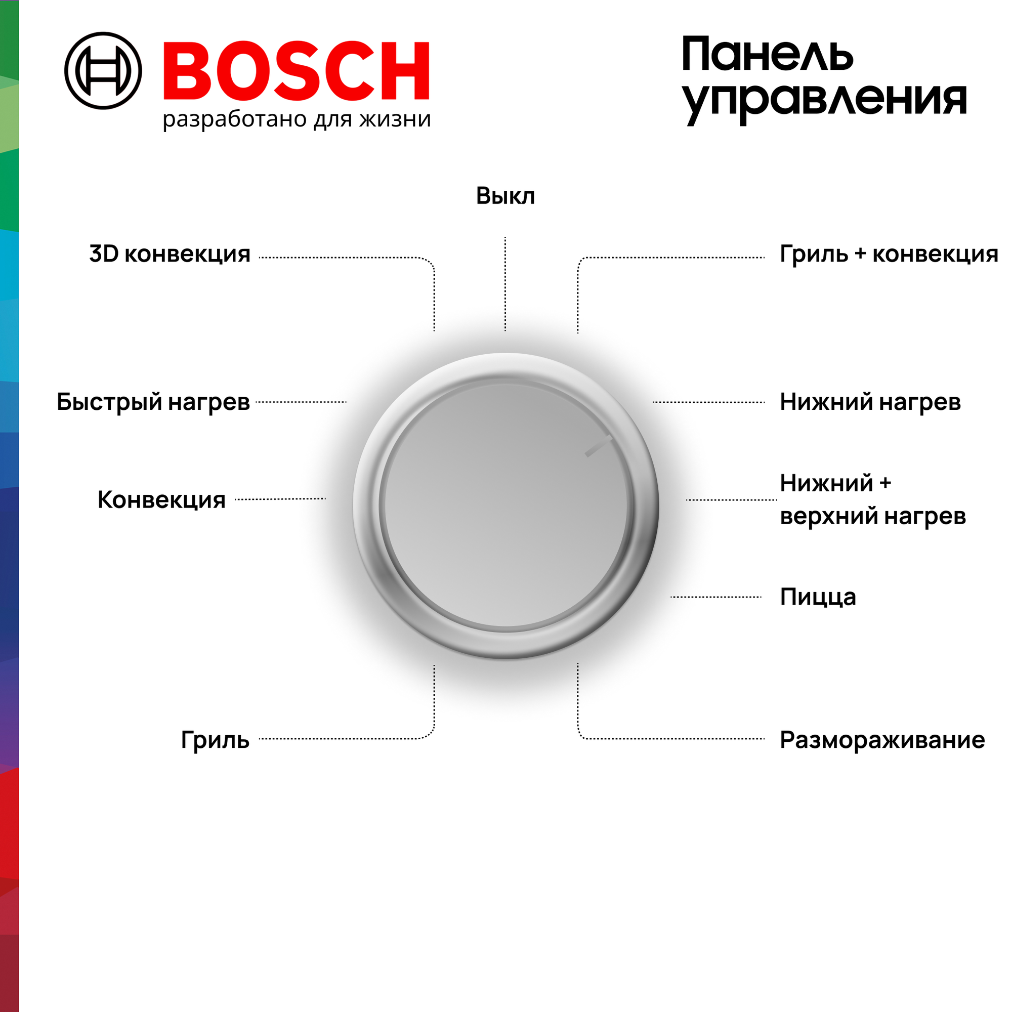 гриль, нижний нагрев+конвекция, верхний нагрев+конвекция, гриль+конвекция, верхний+нижний нагрев, верхний+нижний нагрев+конвекция, конвекция+освещение