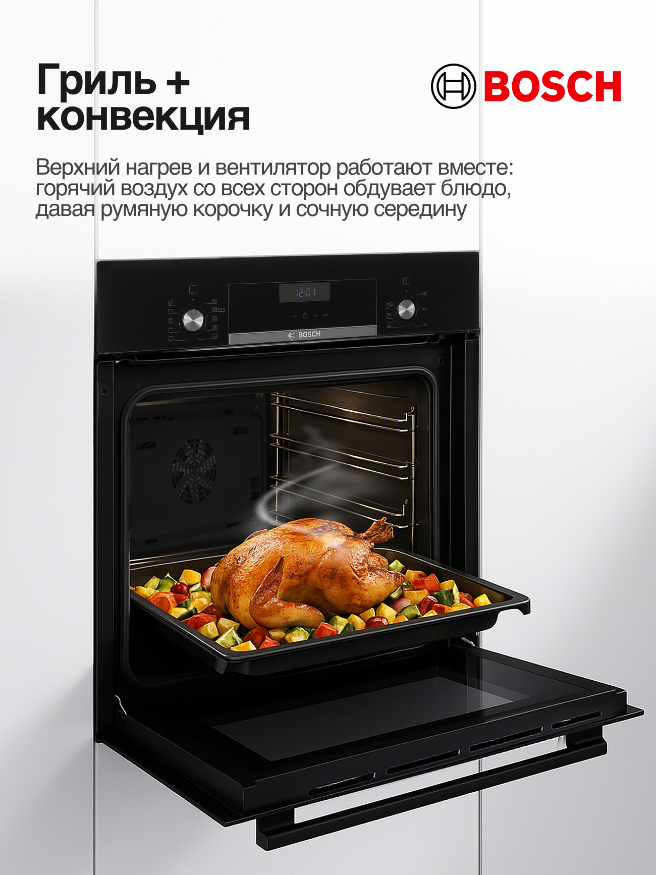 Мощность духового шкафа Бош позволяет максимально ускорить приготовление блюд даже самых внушительных объемов и весов. Поместите продукты на решетку, разместите под ней противень и включите «Большой гриль». В этом режиме включаются все нагревательные элементы гриля. Следуйте рекомендациям в инструкции, чтобы не пересушить продукты.