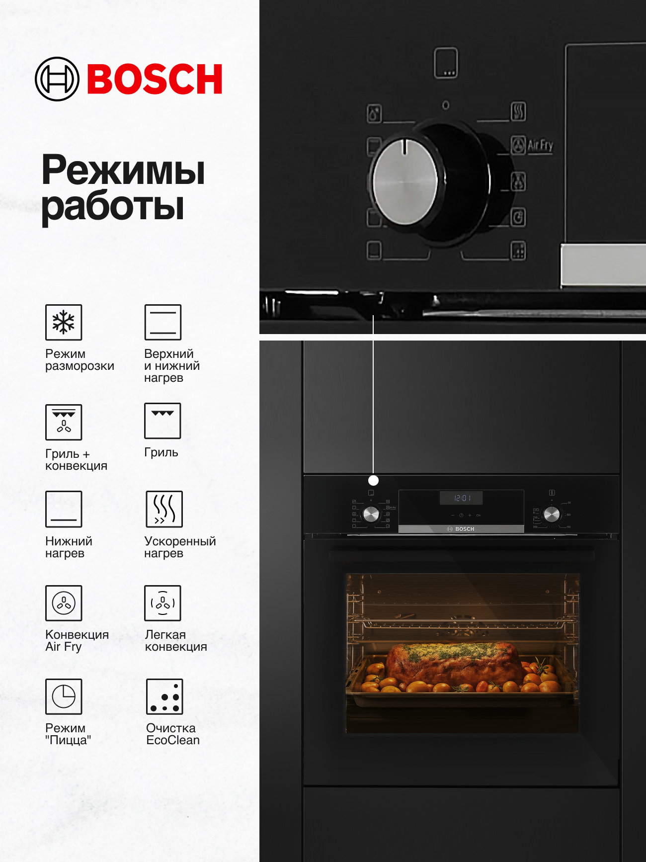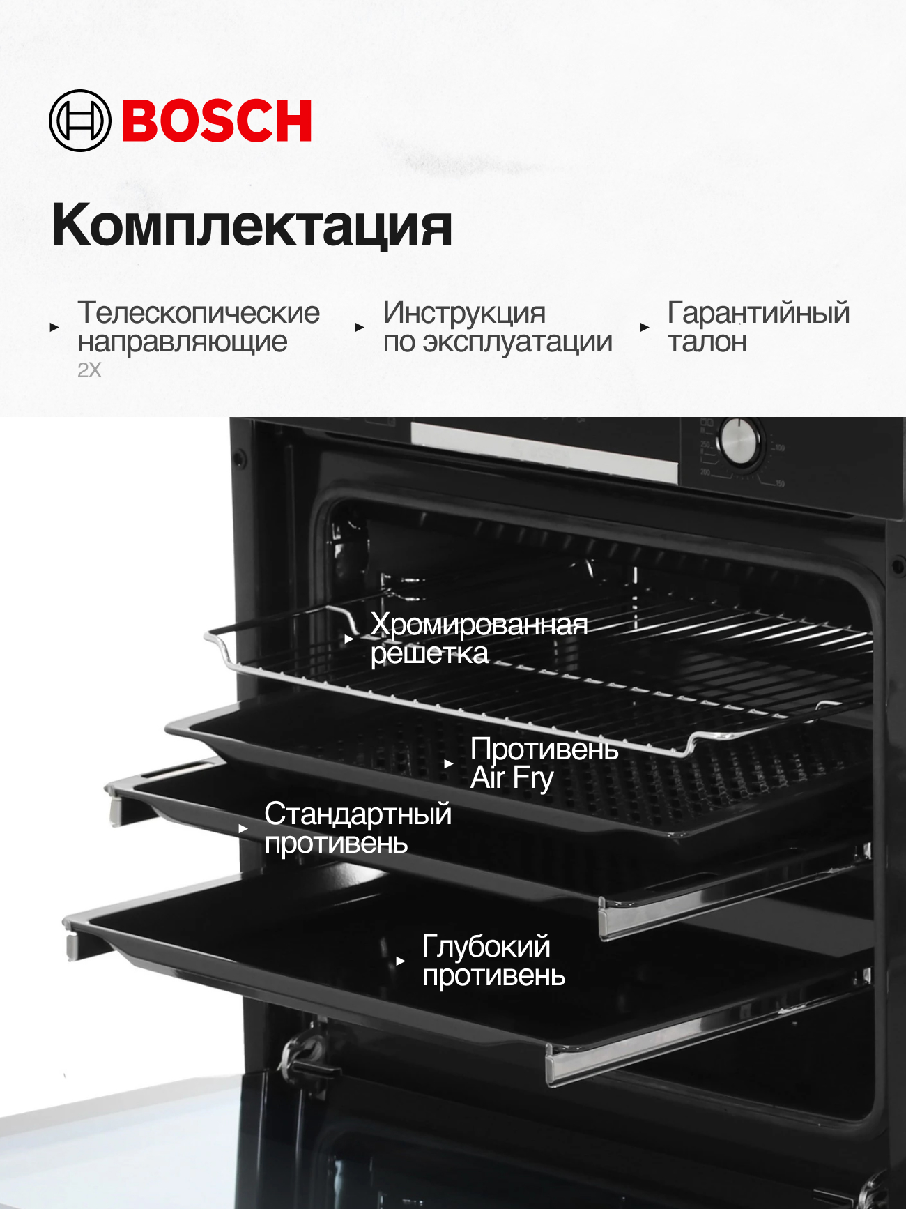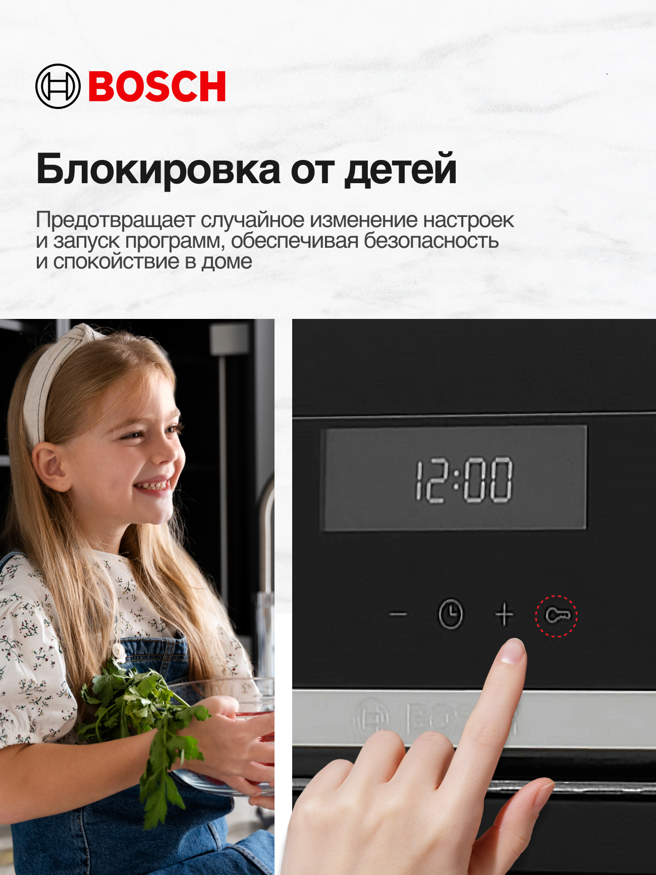 Страна производства: Турция. Товар новый в заводской упаковке. Духовой шкаф Bosch HBJ558YB3Q — это высококачественное устройство, изготовленное из нержавеющей стали, которое сочетает в себе элегантный дизайн и передовые технологии. Серия Serie | 6 отличается своими строгими линиями и современным видом, который прекрасно впишется в любой интерьер. Сенсорные поворотные утапливаемые элементы управления и LCD дисплей добавляют устройству утонченности и позволяют легко управлять всеми функциями. С вместимостью 66 литров, этот духовой шкаф предлагает достаточно пространства для приготовления различных блюд. Его размеры составляют 59.5 см в высоту, 59.4 см в ширину и 54.8 см в глубину, что делает его идеальным для встраивания в нишу размером 57.5-59.7×56-56.8×55 см. Устройство обладает 8 режимами нагрева и диапазоном температур от 50 до 275 градусов, что позволяет выбрать наиболее подходящий режим для каждого блюда. С помощью функции 3D-горячего воздуха и горячего воздуха Gentle можно равномерно распределить тепло внутри шкафа, обеспечивая идеальные результаты приготовления. Особенностью модели является пиролитическая система очистки, которая обеспечивает безупречную чистоту без необходимости трудоемкого ручного труда. Внутреннее галогенное освещение и трехслойное остекление дверцы обеспечивают отличную видимость внутри шкафа во время приготовления. Дверца устройства оснащена амортизатором SoftClose, который обеспечивает мягкое и тихое закрытие. Для безопасности детей предусмотрена специальная блокировка. В комплекте с духовым шкафом идут комбинированная решетка, эмалированный противень, универсальный противень, пригодный для пиролиза, и противень для гриля.
