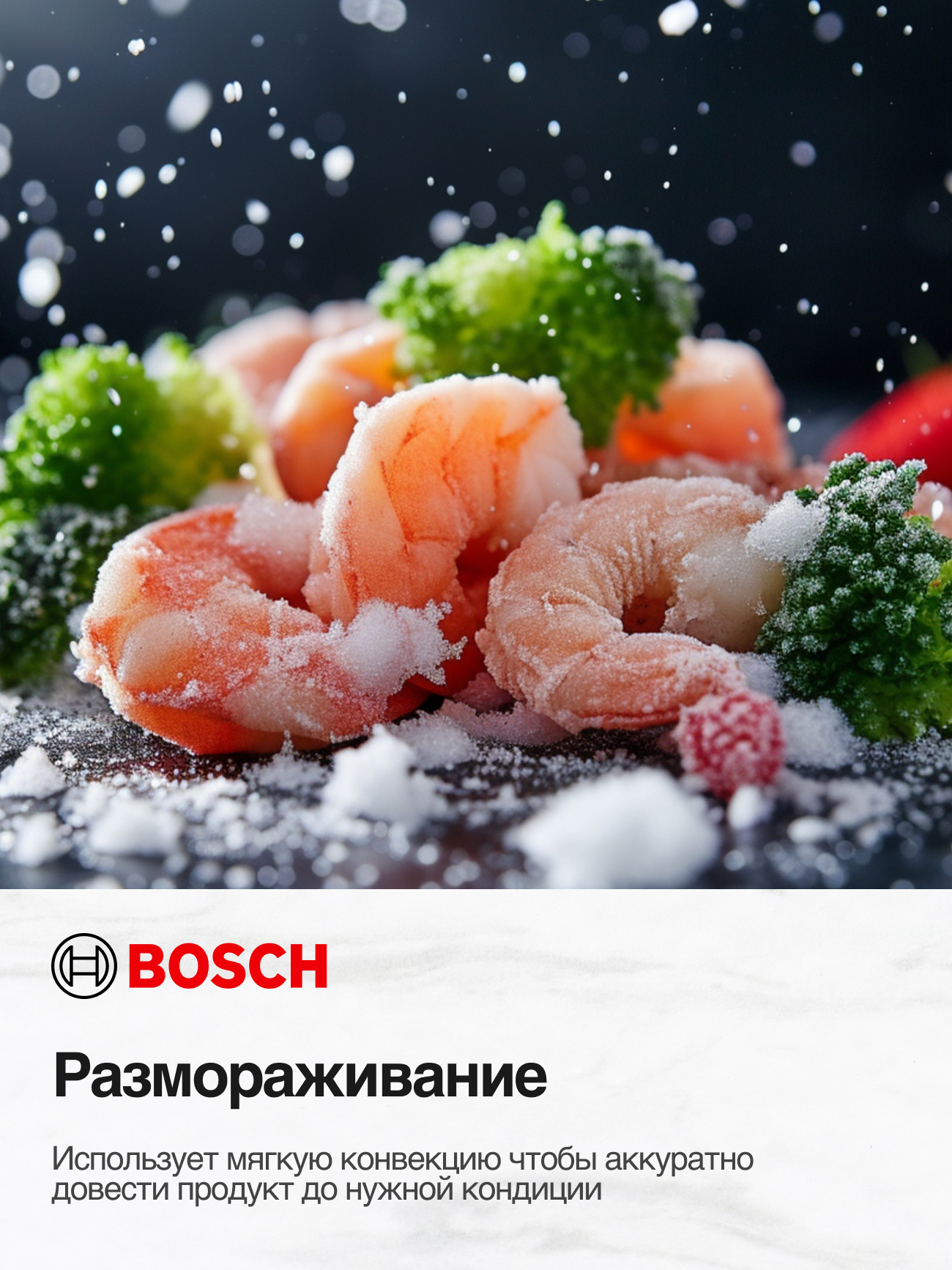 Данная функция обеспечивает максимально бережное размораживание с сохранением питательной ценности продуктов. В большинстве моделей микроволоновок Bosch имеется несколько режимов для размораживания продуктов разного веса и разных типов (животного или растительного происхождения).