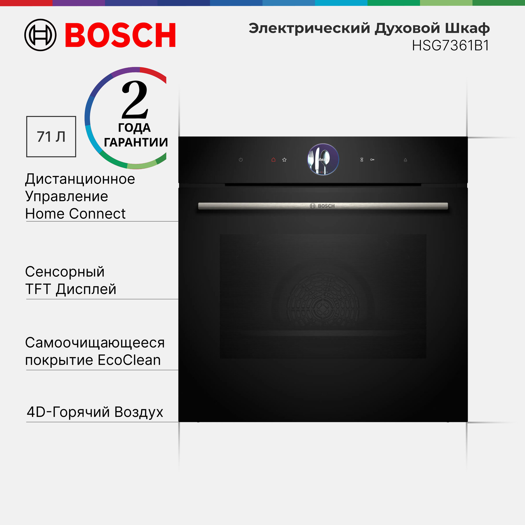 Страна производства: Германия. Товар новый в заводской упаковке. Электрический духовой шкаф Bosch HSG7361B1 из серии Serie 8 представляет собой идеальное сочетание стильного дизайна и передовых технологий. Черный цвет прибора добавляет ему элегантности и подчеркивает современный стиль интерьера. Духовка обладает внутренним объемом 71 литр, что позволяет готовить большие порции еды одновременно. Управление духовкой осуществляется с помощью сенсорных кнопок на 2.5" цветном TFT дисплее, что делает процесс использования прибора максимально удобным и интуитивным. Встроенные электронные часы и таймер помогут контролировать время приготовления блюд. В духовке предусмотрено 13 режимов нагрева, включая 4D-горячий воздух, верхний/нижний жар, гриль с конвекцией и многое другое. Диапазон температур составляет от 30 до 250 градусов, что позволяет готовить практически любые блюда.