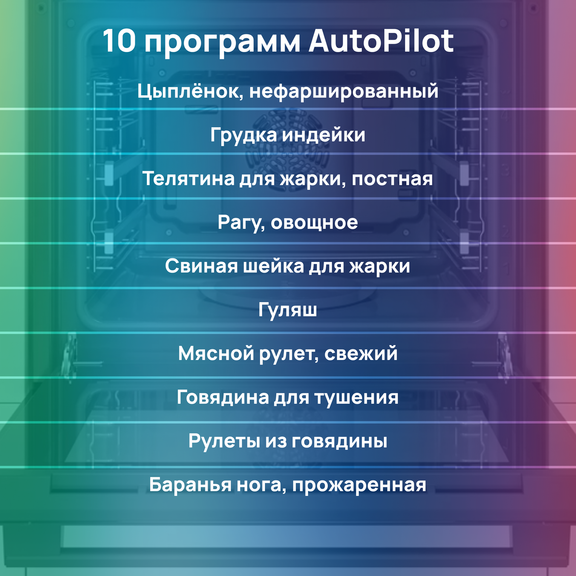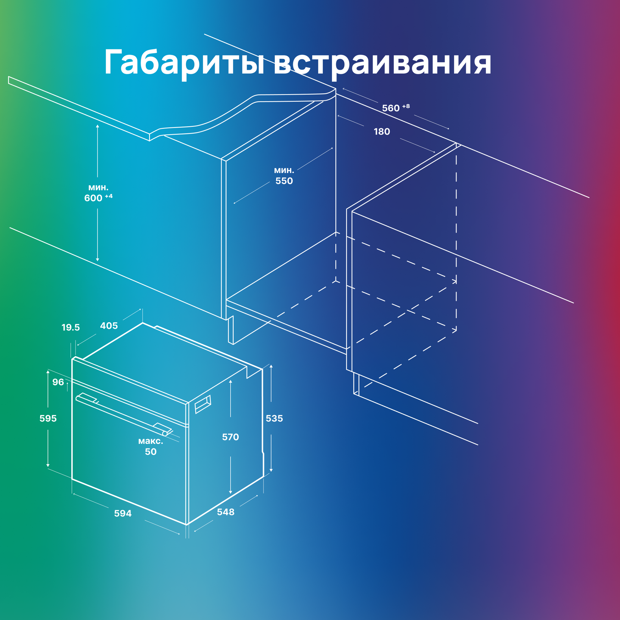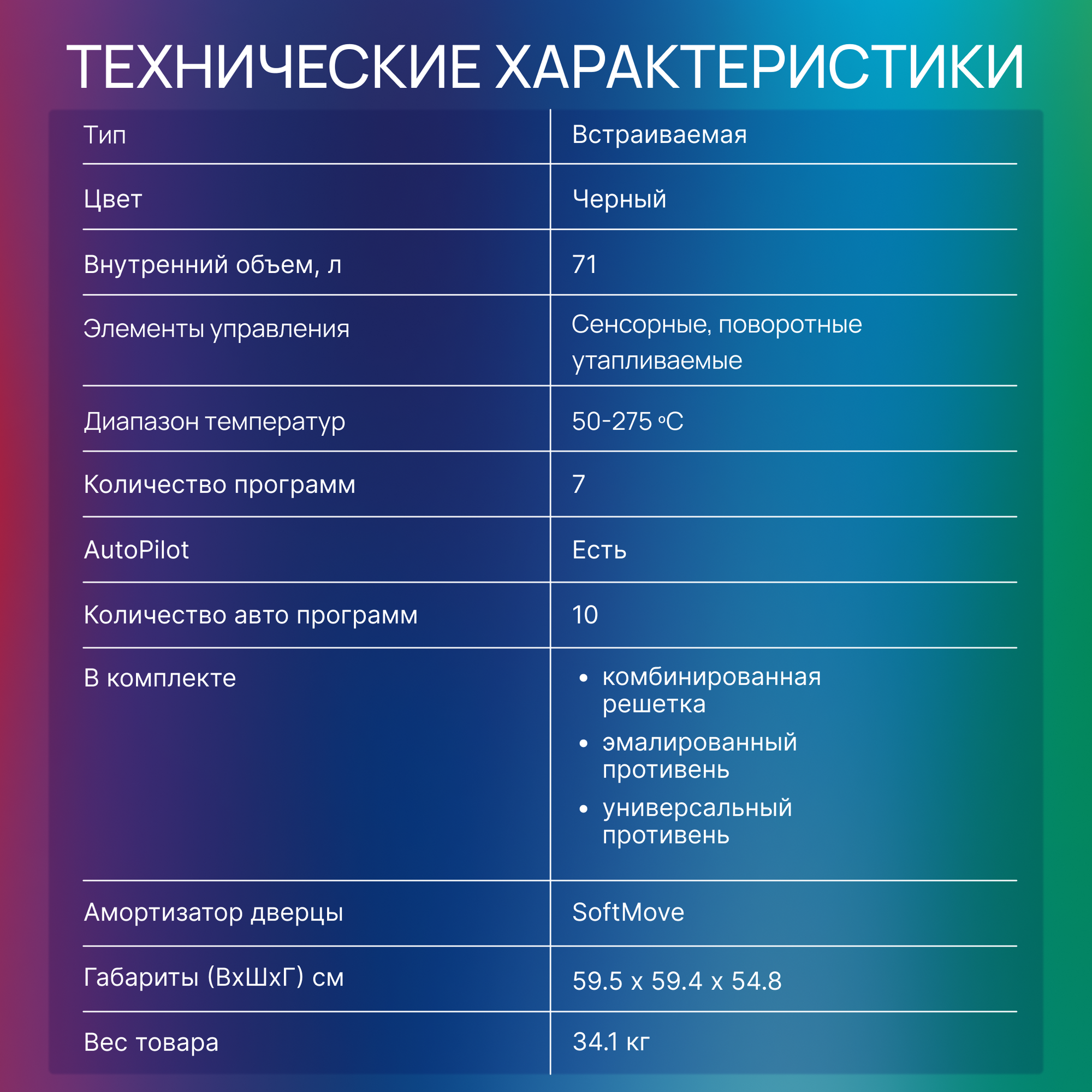 Страна производства: Испания. Товар новый в заводской упаковке. Духовой шкаф с 3D Hotair и AutoPilot для идеальных результатов приготовления, а покрытие EcoClean Direct практически не требует очистки. • AutoPilot 10: каждое блюдо получается идеальным благодаря 10 предустановленным автоматическим программам. • Управление с ЖК-дисплеем, белый: простота в использовании благодаря дополнительным функциям и индикации температуры. • Выдвижные элементы управления: Облегчают чистку передней панели печи и придают ей элегантный вид. • Eco Clean Direct: меньше усилий при уборке благодаря специальному покрытию задней стенки, которое автоматически впитывает грязь. • Откидная дверца с функциями Soft Open и Soft Close: дверца духовки открывается и закрывается особенно мягко и тихо.Тип духовки / системы подогрева • Духовой шкаф с 7 методами нагрева: 3D Hotair, Стандартный нагрев, Hotair-гриль, Гриль по всей ширине, Настойка для пиццы, Нагрев снизу, Hotair-деликатный режим • Диапазон температур 50 °C - 275 °C • Объем камеры: 71 л • 2 уровневые телескопические направляющие для полок, со стопором, с полным выдвижением • Поворачиваемые ручки, выдвижные элементы управления, черный • Духовой шкаф с повышенной вместимостью с серым эмалированным покрытием • EcoClean Direct: покрытие задней панели • Основная внутренняя дверца: Полностью стеклянная внутренняя дверца Комфорт: • Элементы управления на ЖК-дисплее (белый) • Электронные часы • Автоматический старт • Управление нагревом • AutoPilot 10 • Плавно открывающаяся и закрывающаяся дверца духовки • Количество стекол в дверце: 2 • Быстрый предварительный нагрев • Галогенное внутреннее освещение • Встроенный охлаждающий вентилятор • Замок от детей • Индикатор остаточного тепла Дополнительные принадлежности: • 1 x эмалированный противень для выпечки, 1 x комбинированная решетка, 1 x универсальный противень Техническая информация • Длина сетевого кабеля: 120 см • Номинальное напряжение: 220 - 240 В • Общая подключенная электрическая нагрузка: 3.4 кВт • Класс энергоэффективности (согласно EU Nr. 65/2014): A(в диапазоне классов энергоэффективности от A+++ до D) • Энергопотребление за цикл в стандартном режиме:0.97 кВт⋅ч Энергопотребление за цикл в режиме конвекции с вентилятором:0.81 кВт⋅ч Размер: • Размер устройства (ВxШxГ): 595 мм x 594 мм x 548 мм • Размер ниши (ГxШxВ): 585 мм - 595 мм x 560 мм - 568 мм x 550 мм • “Пожалуйста, учитывайте размеры для встраивания устройства, предоставленные в установочном чертеже" • Рекомендовано выбирать дополнительные устройства из Серии 6, чтобы обеспечить оптимальное сочетание внешнего вида встраиваемой техники.