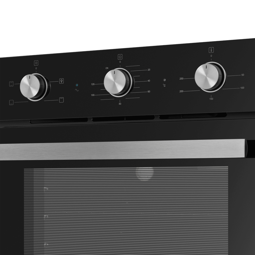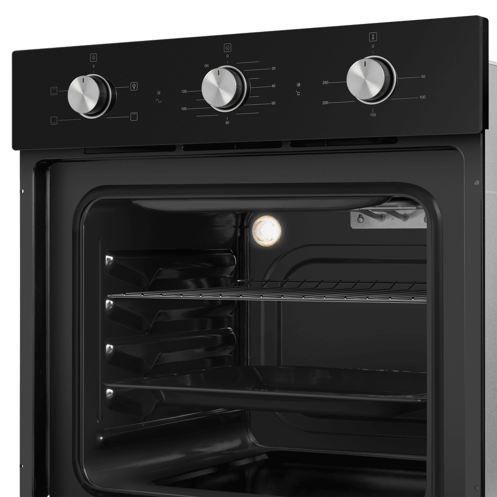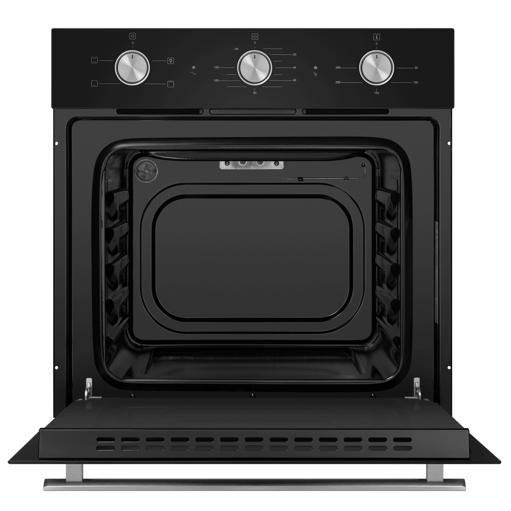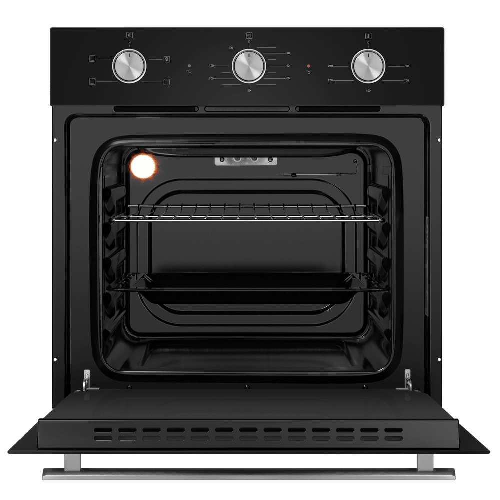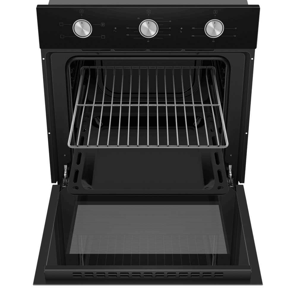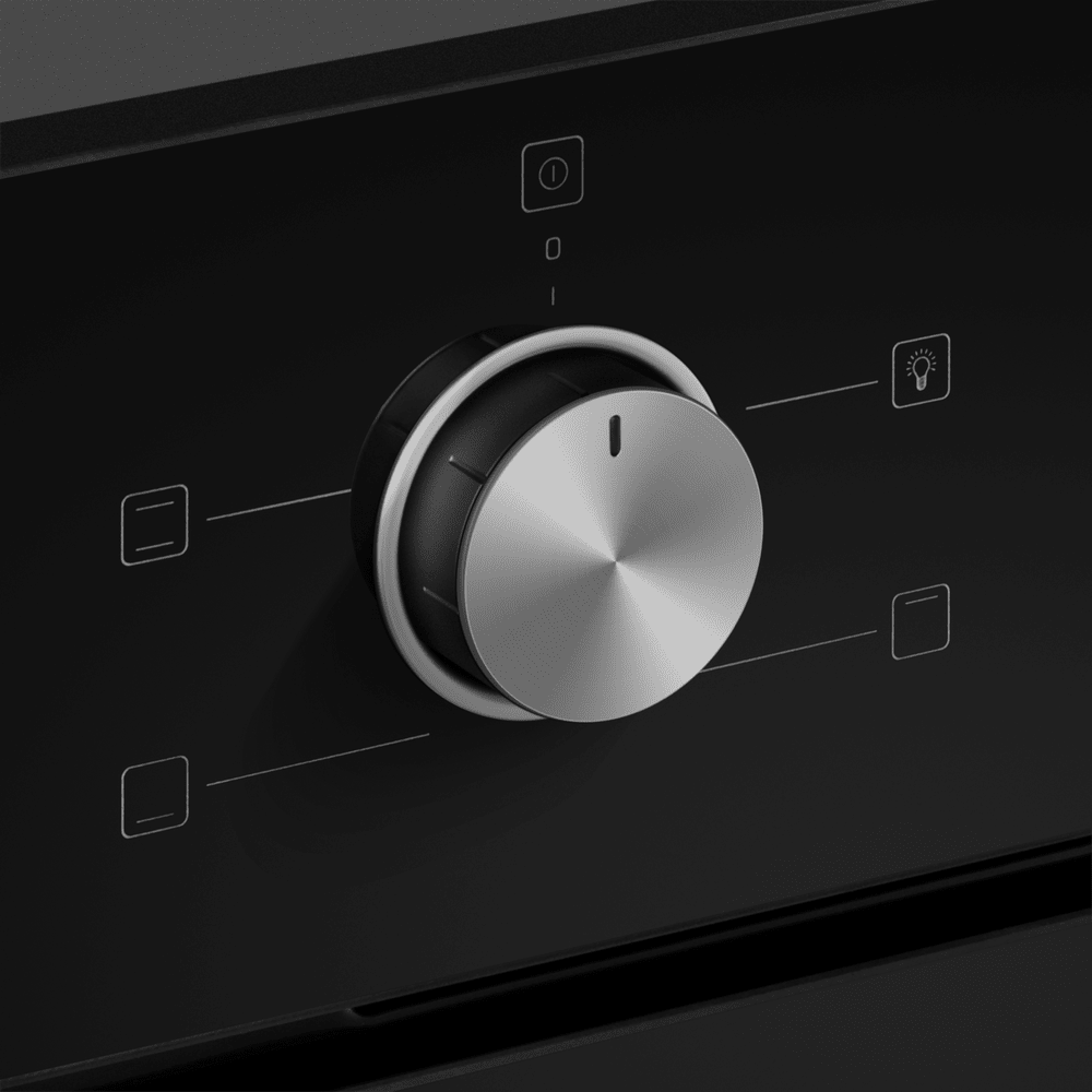Энергопотребление. Духовой шкаф имеет класс энергопотребления А, что говорит, о низком потреблении электроэнергии. Подсветка рабочей зоны. Модель оснащена ярким освещением камеры, что позволяет в деталях рассмотреть приготовление пищи. Черная эмаль легкой очистки. Внутреннее покрытие камеры выполнено из специальной эмали обладающей особенными свойствами к расщеплению осевшего на стенки жира, что позволяет легко очищать ее поверхность. Холодный фронт. Специальная функция при которой внешнее стекло не нагревается в процессе работы, что делает приготовление безопасным, особенно при нахождении на кухне маленьких детей. Управление происходит при помощи утапливаемых ручек PUSH PULL, которые легко убираются внутрь корпуса после использования, что делает уход за лицевой панелью шкафа максимально удобным. Духовой шкаф оснащен набором функций для приготовления: Подсветка духовки. Традиционный нагрев. Для выпекания и жарки на одном уровне. Работают верхний и нижний нагревательные элементы. Нижний нагрев. Используется для блюд, требующих длительного и медленного пропекания, например, для приготовления блюд в горшочках. Верхний нагрев Преимущества: Охлаждение: тангенциальное Тройное стекло дверцы