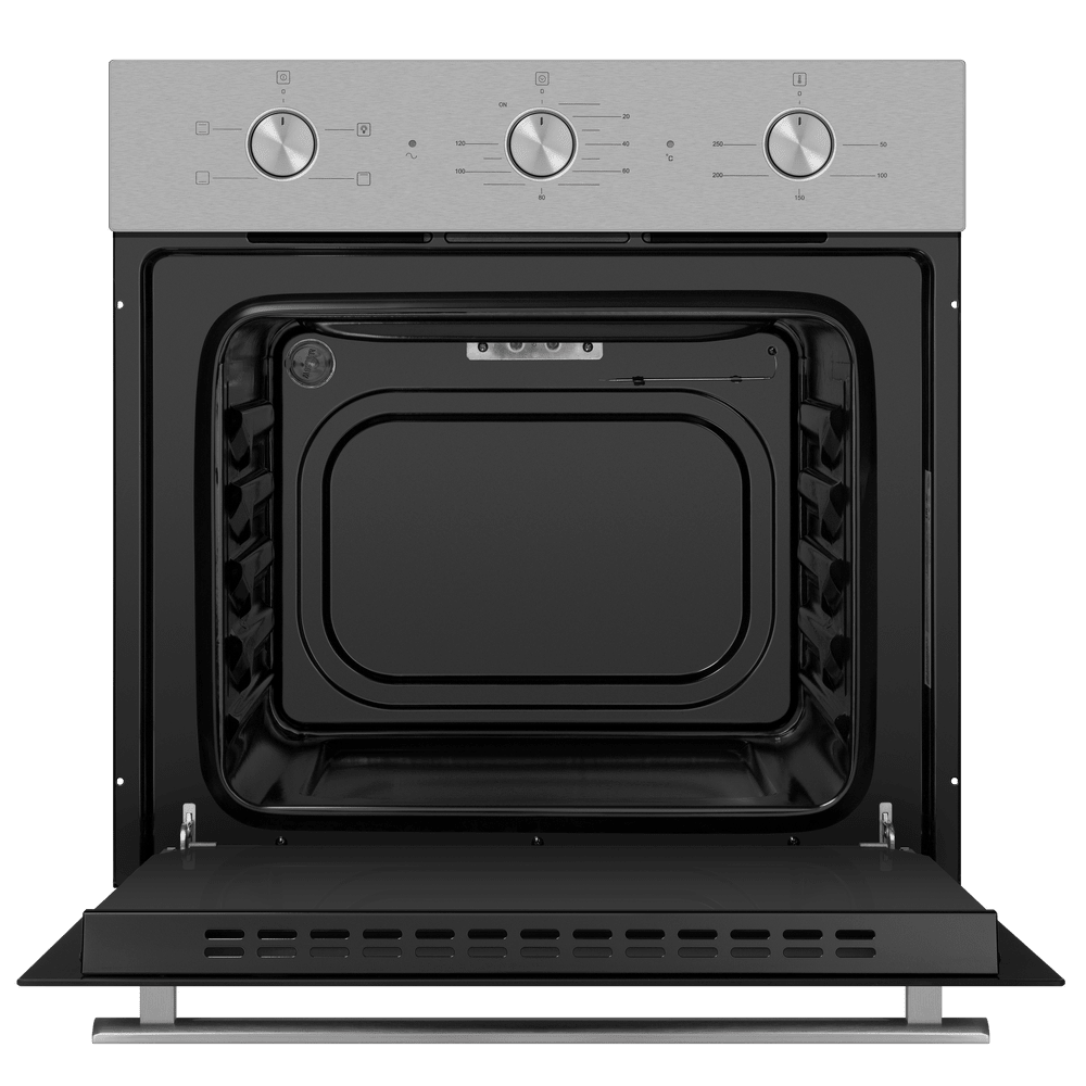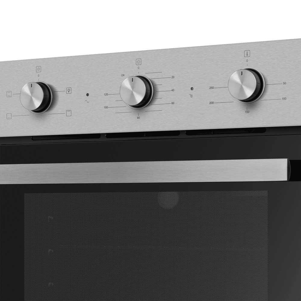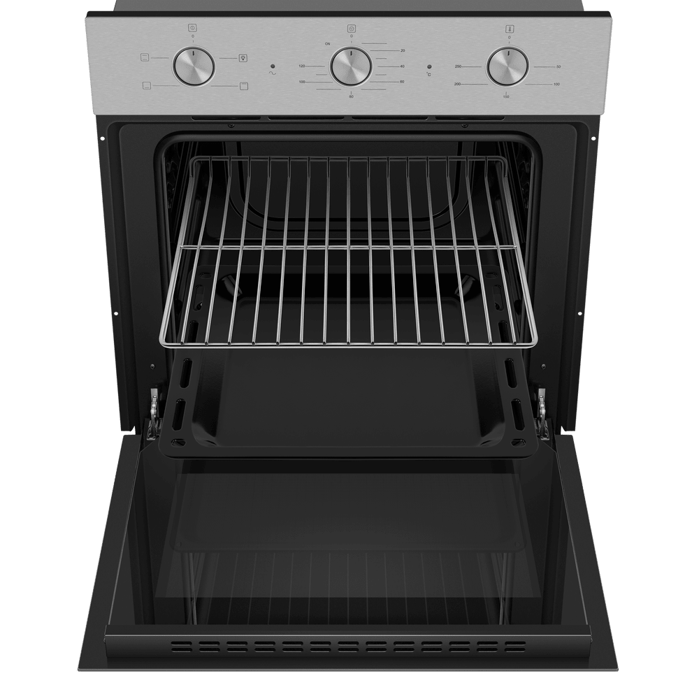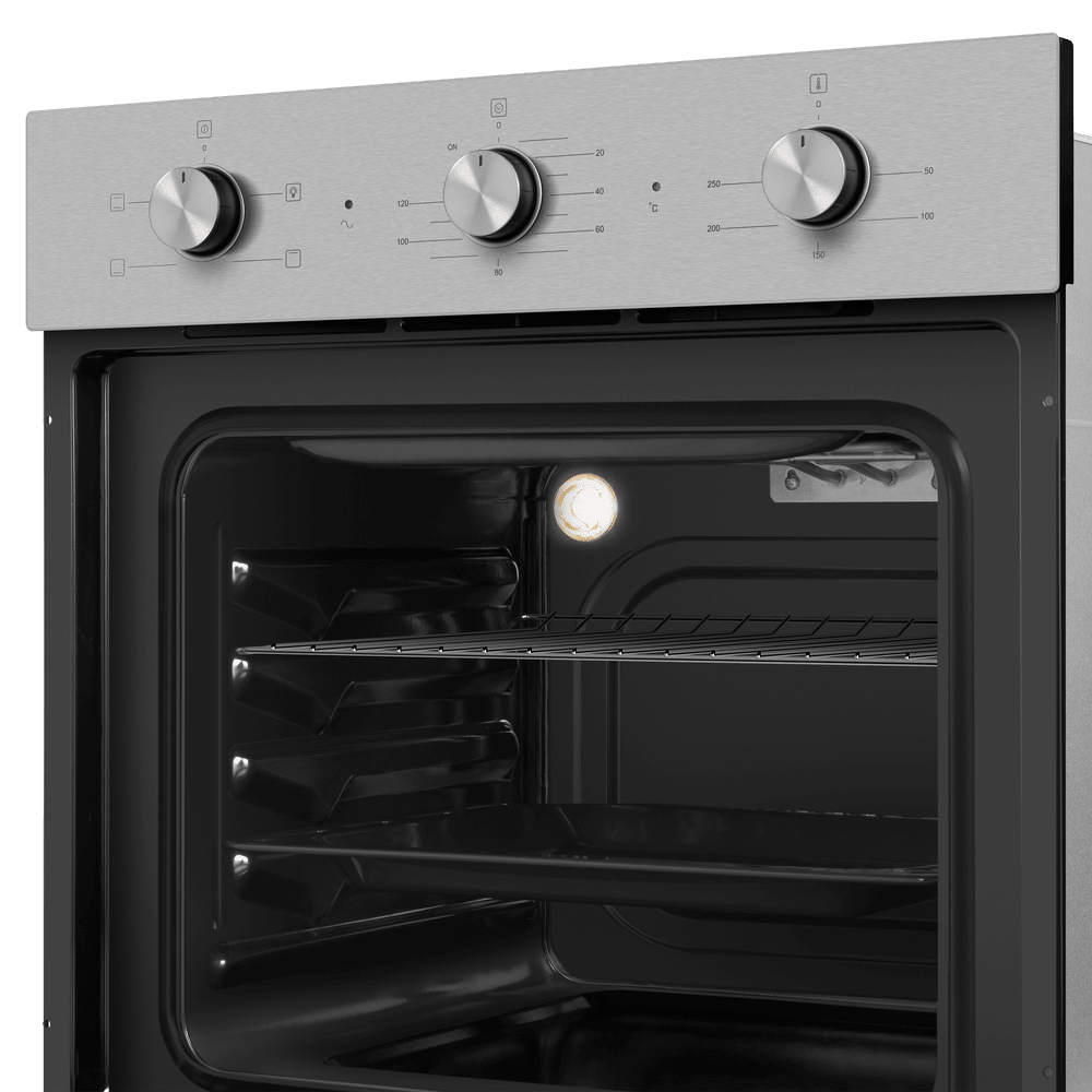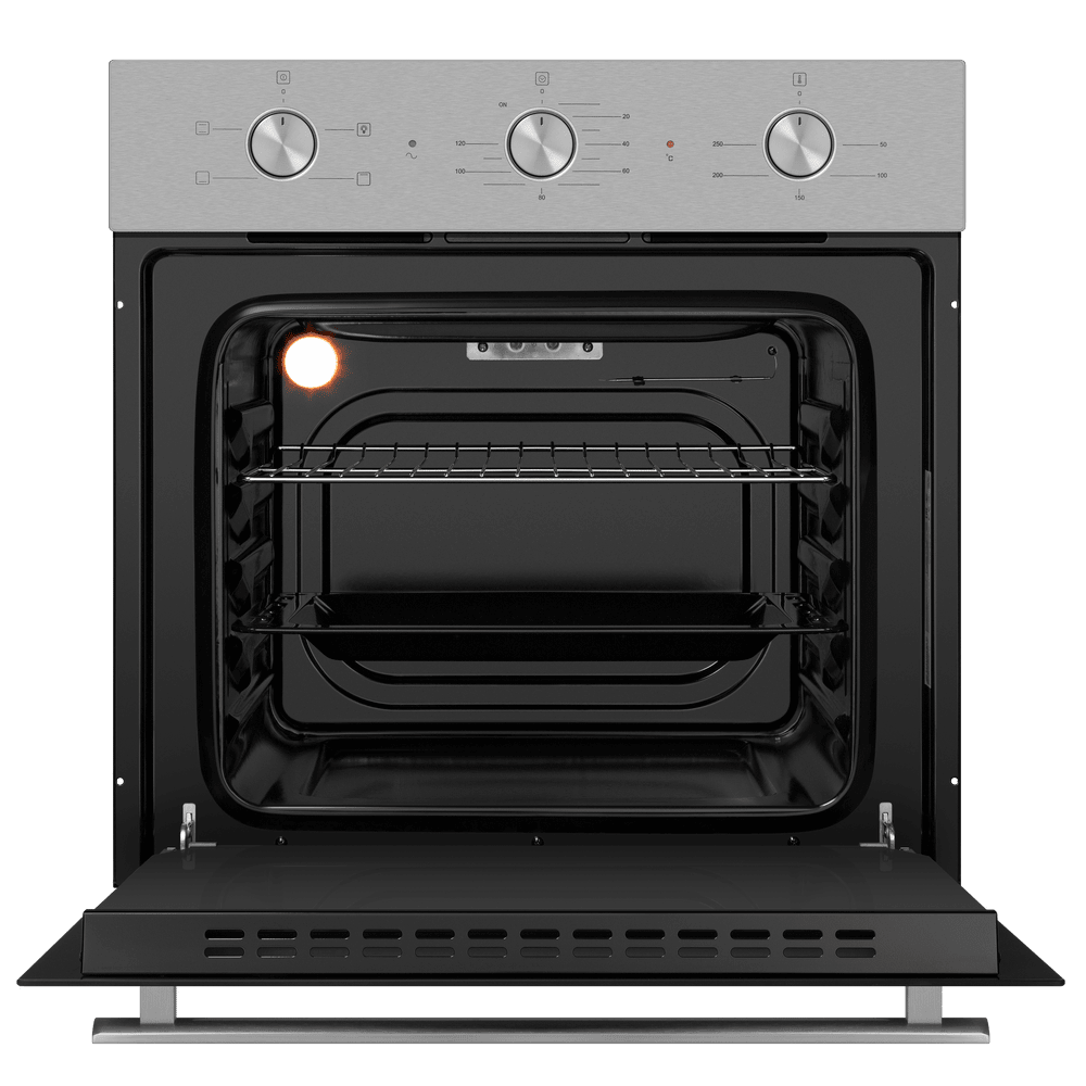 Энергопотребление. Духовой шкаф имеет класс энергопотребления А, что говорит, о низком потреблении электроэнергии. Подсветка рабочей зоны. Модель оснащена ярким освещением камеры, что позволяет в деталях рассмотреть приготовление пищи. Черная эмаль легкой очистки. Внутреннее покрытие камеры выполнено из специальной эмали обладающей особенными свойствами к расщеплению осевшего на стенки жира, что позволяет легко очищать ее поверхность. Холодный фронт. Специальная функция при которой внешнее стекло не нагревается в процессе работы, что делает приготовление безопасным, особенно при нахождении на кухне маленьких детей. Управление происходит при помощи утапливаемых ручек PUSH PULL, которые легко убираются внутрь корпуса после использования, что делает уход за лицевой панелью шкафа максимально удобным. Духовой шкаф оснащен набором функций для приготовления: Подсветка духовки. Традиционный нагрев. Для выпекания и жарки на одном уровне. Работают верхний и нижний нагревательные элементы. Нижний нагрев. Используется для блюд, требующих длительного и медленного пропекания, например, для приготовления блюд в горшочках. Верхний нагрев Преимущества: Охлаждение: тангенциальное Тройное стекло дверцы