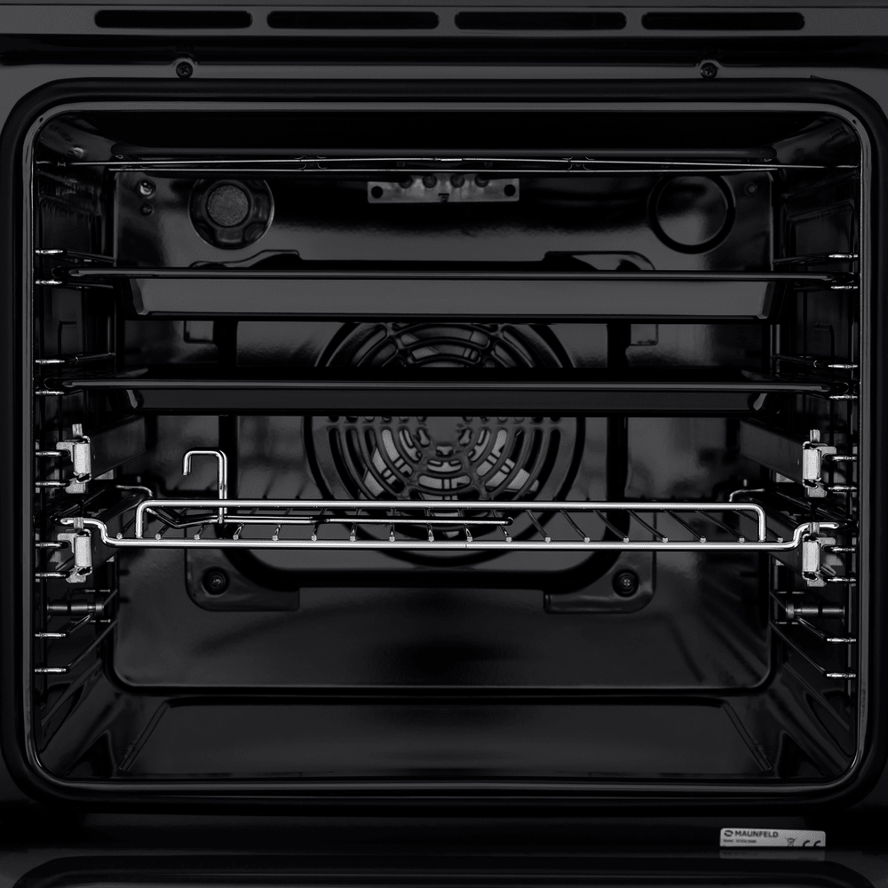 Фронтальная панель дверцы и лицевая часть блока управления сделаны из высококачественного жаропрочного стекла черного цвета. Цельнометаллическая ручка из полированной нержавеющей стали не нагревается в процессе готовки. Внутреннее покрытие камеры выполнено из специальной легкоочищающейся эмали черного цвета.