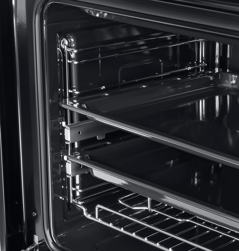 Объем 59 л при стандартных размерах 60 см позволяет готовить одновременно несколько блюд, разместив решетку или противень на одном из 5 уровней боковых направляющих. Два уровня оснащены удобными телескопическими направляющими. Дверца духового шкафа состоит из 2-х стекол, что создает холодный фронт и делает процесс приготовления безопасным, исключая возможность ожога при касании. Внутреннее стекло имеет трамп-линии.