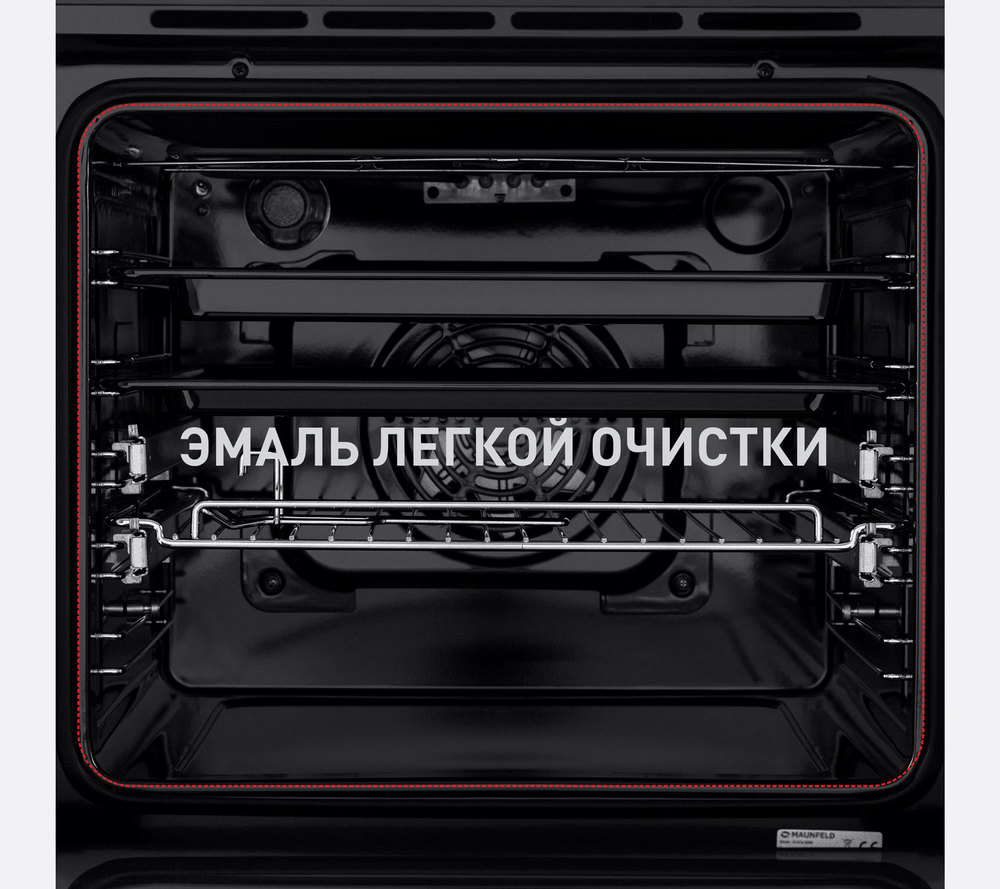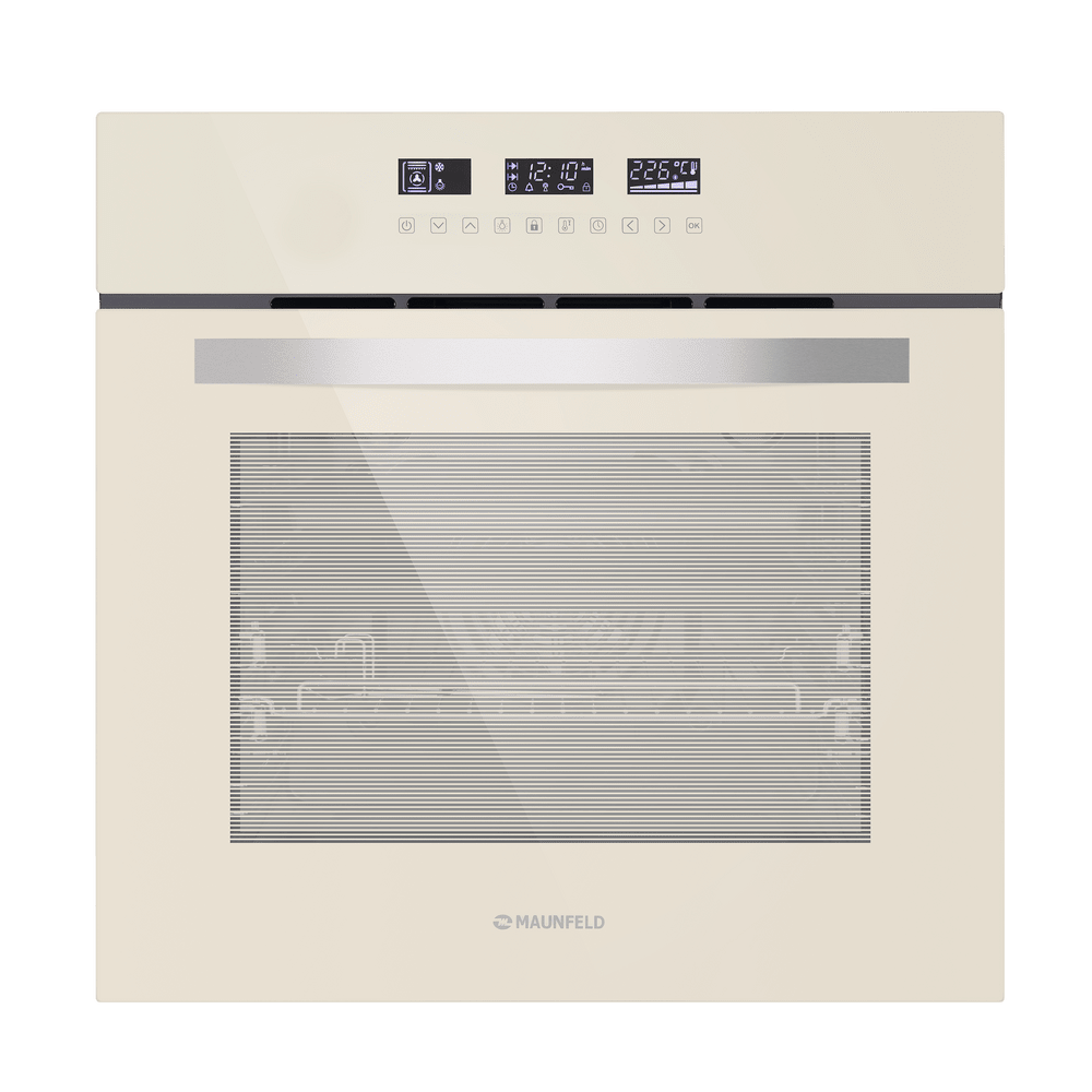 Фронтальная панель дверцы и лицевая часть блока управления сделаны из высококачественного жаропрочного стекла бежевого цвета. Цельнометаллическая ручка из полированной нержавеющей стали не нагревается в процессе готовки. Внутреннее покрытие камеры выполнено из специальной легкоочищающейся эмали черного цвета.