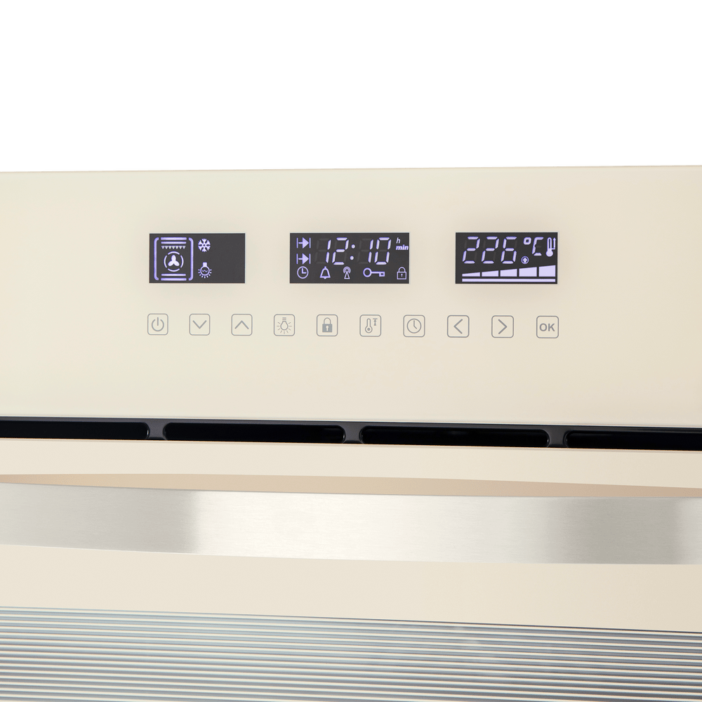 Сенсорный программатор с дисплеем COLD WHITE интуитивно понятен и удобен в использовании. Позволяет выбирать режимы нагрева, температуру, длительность готовки, устанавливать таймер, блокировать панель управления и выводить код ошибки при появлении проблем в работе духового шкафа. В данной модели поддерживается 11 функций работы: нижний и верхний нагрев, нижний нагрев, гриль, гриль с конвекцией, гриль с верхним нагревом, конвекция с нижним нагревом, полная конвекция с нижним нагревом, нижний и верхний нагрев с конвекцией, полная конвекция/равномерная выпечка, размораживание, освещение.
