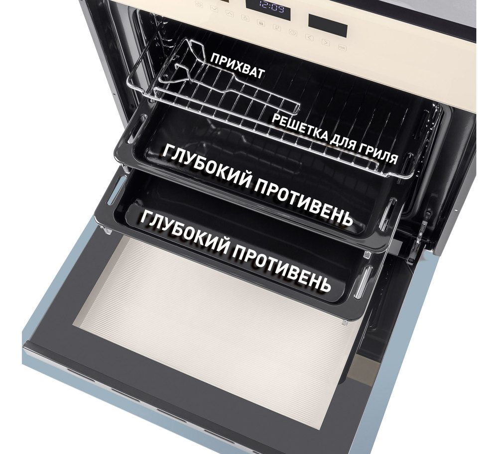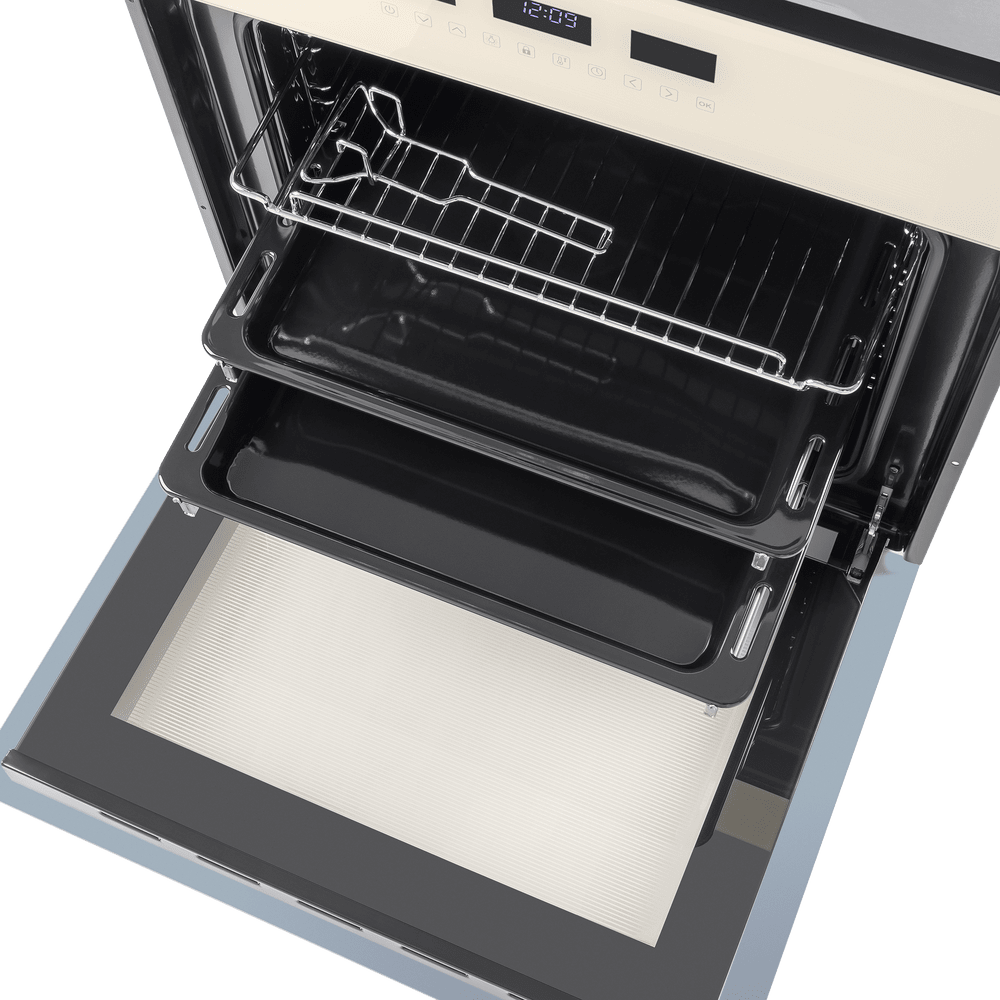 Объем 59 л при стандартных размерах 60 см позволяет готовить одновременно несколько блюд, разместив решетку или противень на одном из 5 уровней боковых направляющих. Два уровня оснащены удобными телескопическими направляющими. Дверца духового шкафа состоит из 2-х стекол, что создает холодный фронт и делает процесс приготовления безопасным, исключая возможность ожога при касании. Внутреннее стекло имеет трамп-линии.