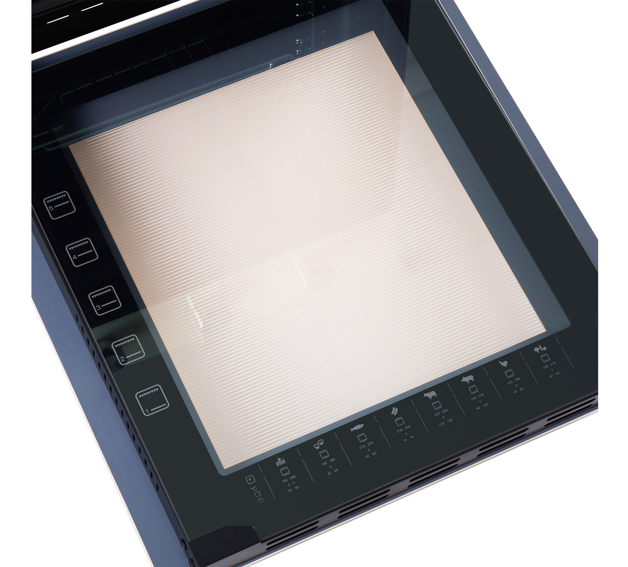 Фронтальная панель духовки сделана из высококачественного жаропрочного тонированного стекла белого цвета. Цельнометаллическая ручка дверцы остается холодной в процессе готовки.