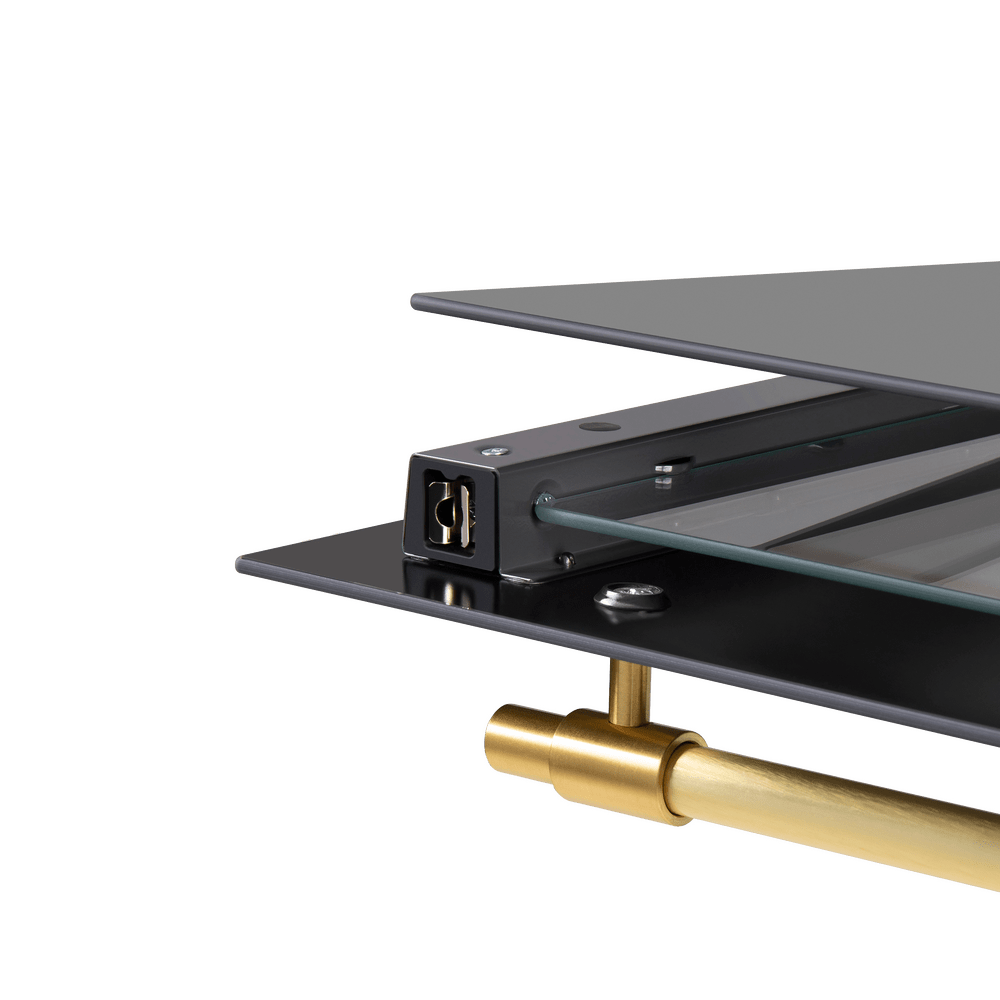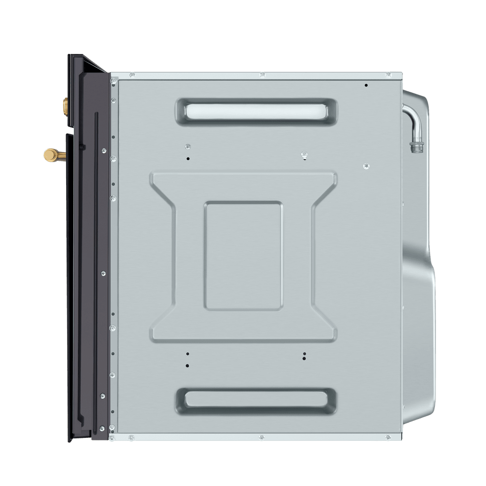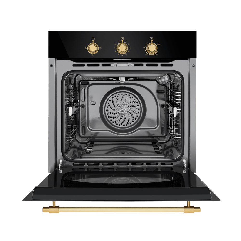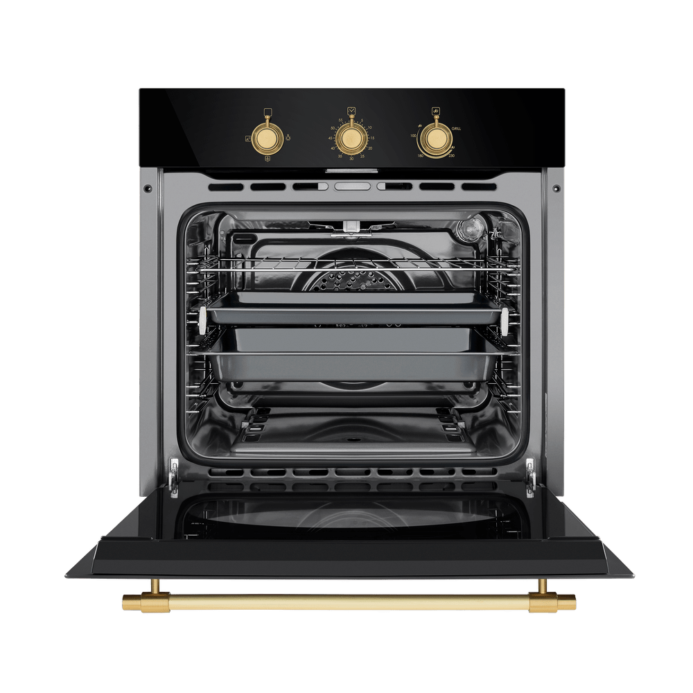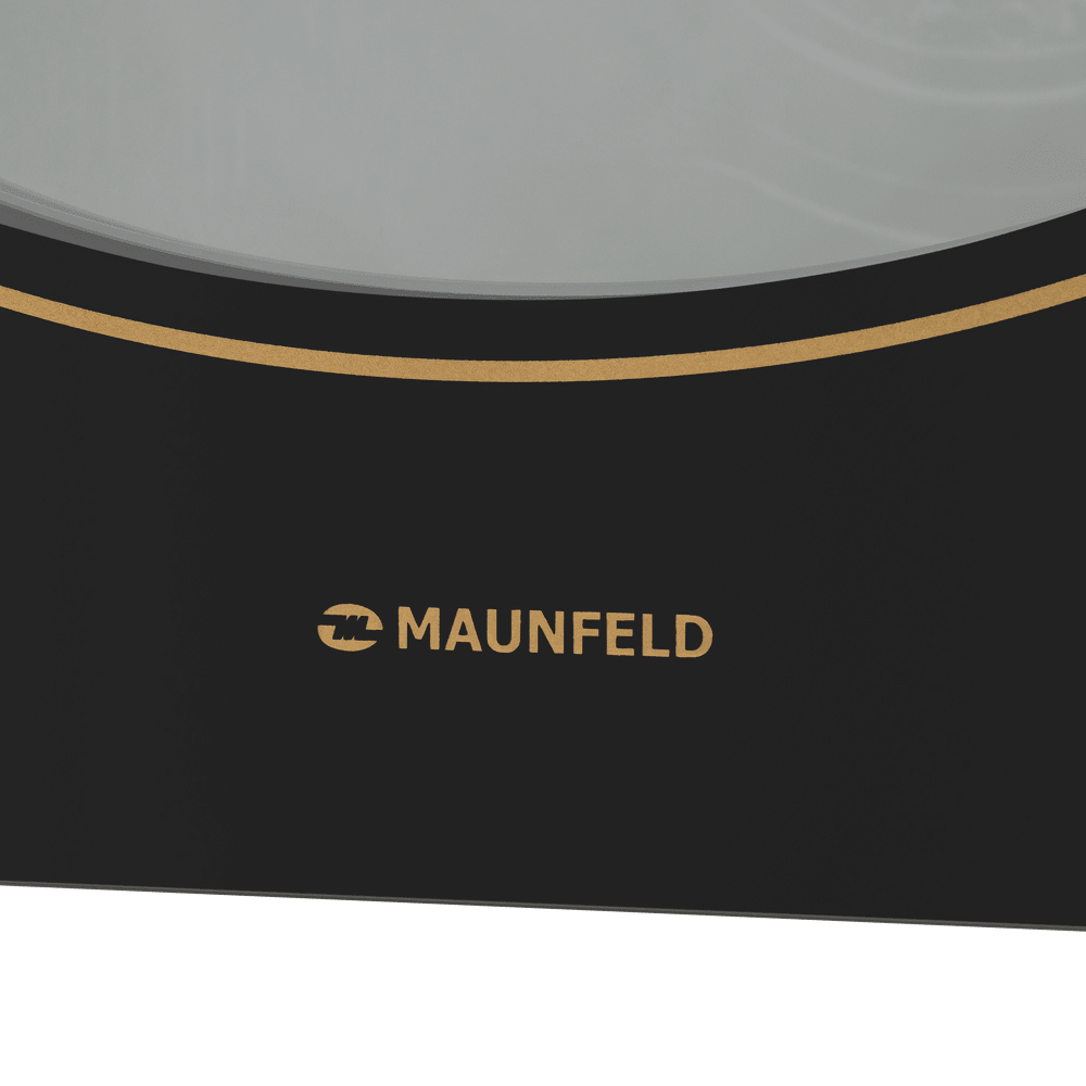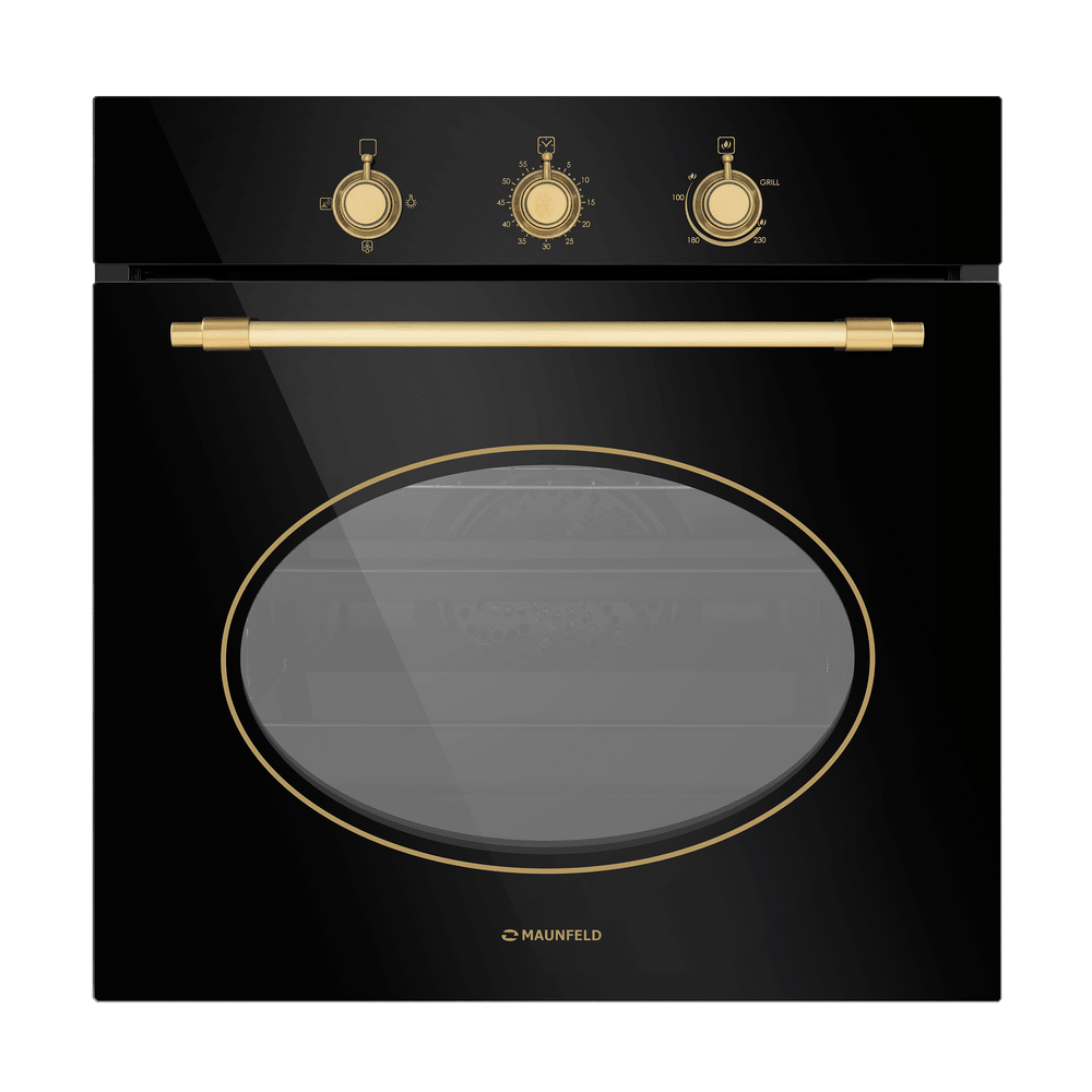 Фронтальная панель сделана из высококачественного тонированного жаропрочного стекла черного. Цельнометаллическая фурнитура золотого цвета идеально дополняет общий образ.