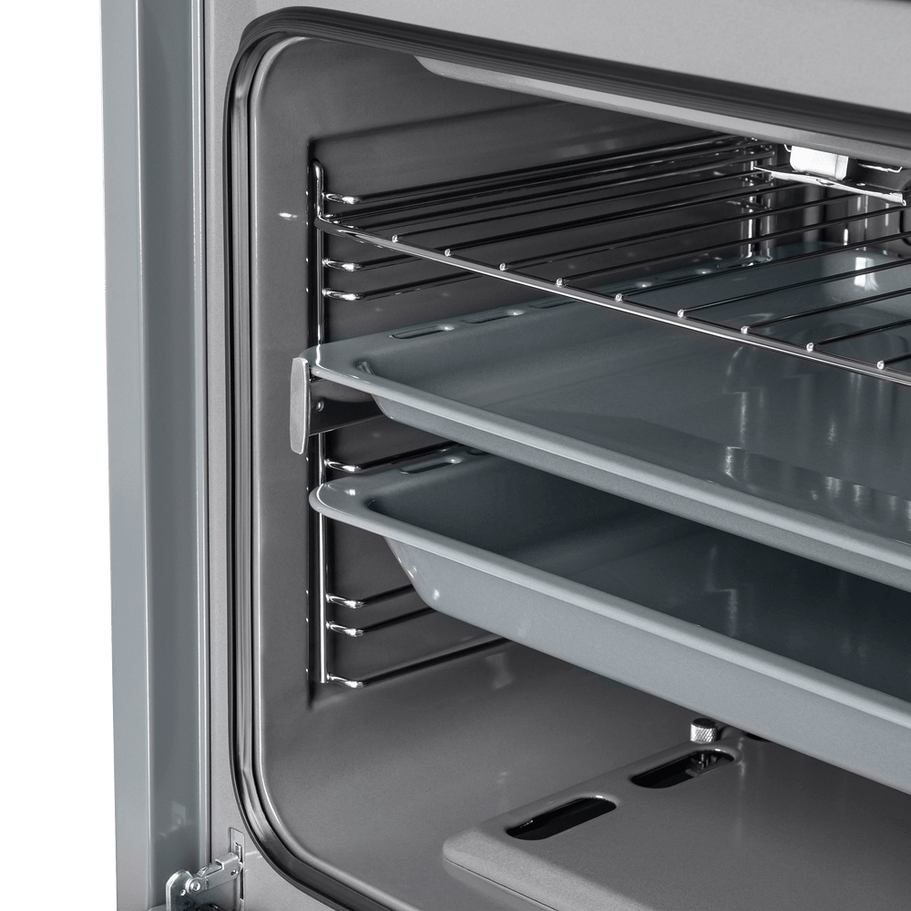Увеличенный объем (67 л) при стандартной ширине 60 см позволяет готовить одновременно несколько блюд, разместив решетку или противень на одном из 5-ти уровней боковых направляющих. Один уровень оснащен удобными телескопическими направляющими. Внутреннее покрытие камеры выполнено из специальной легкоочищающейся эмали серого цвета.