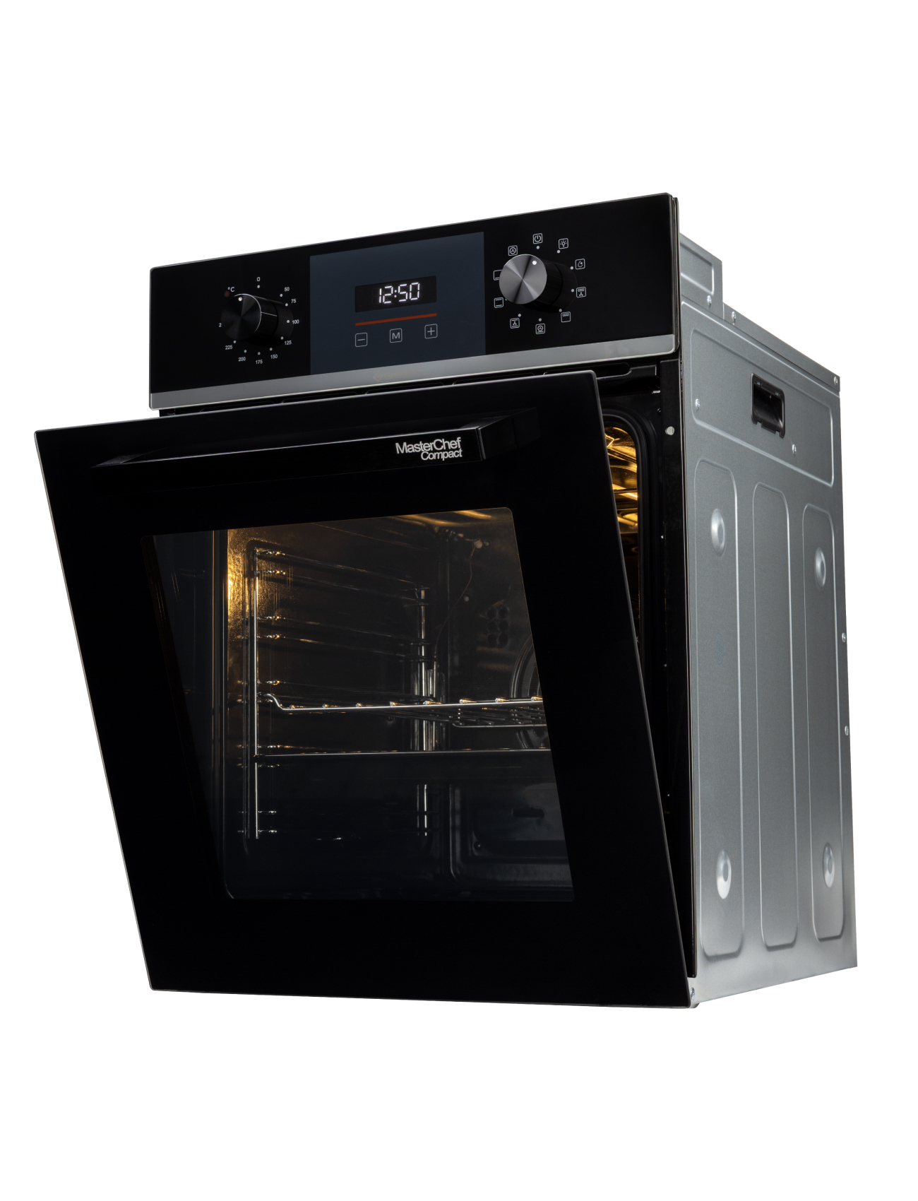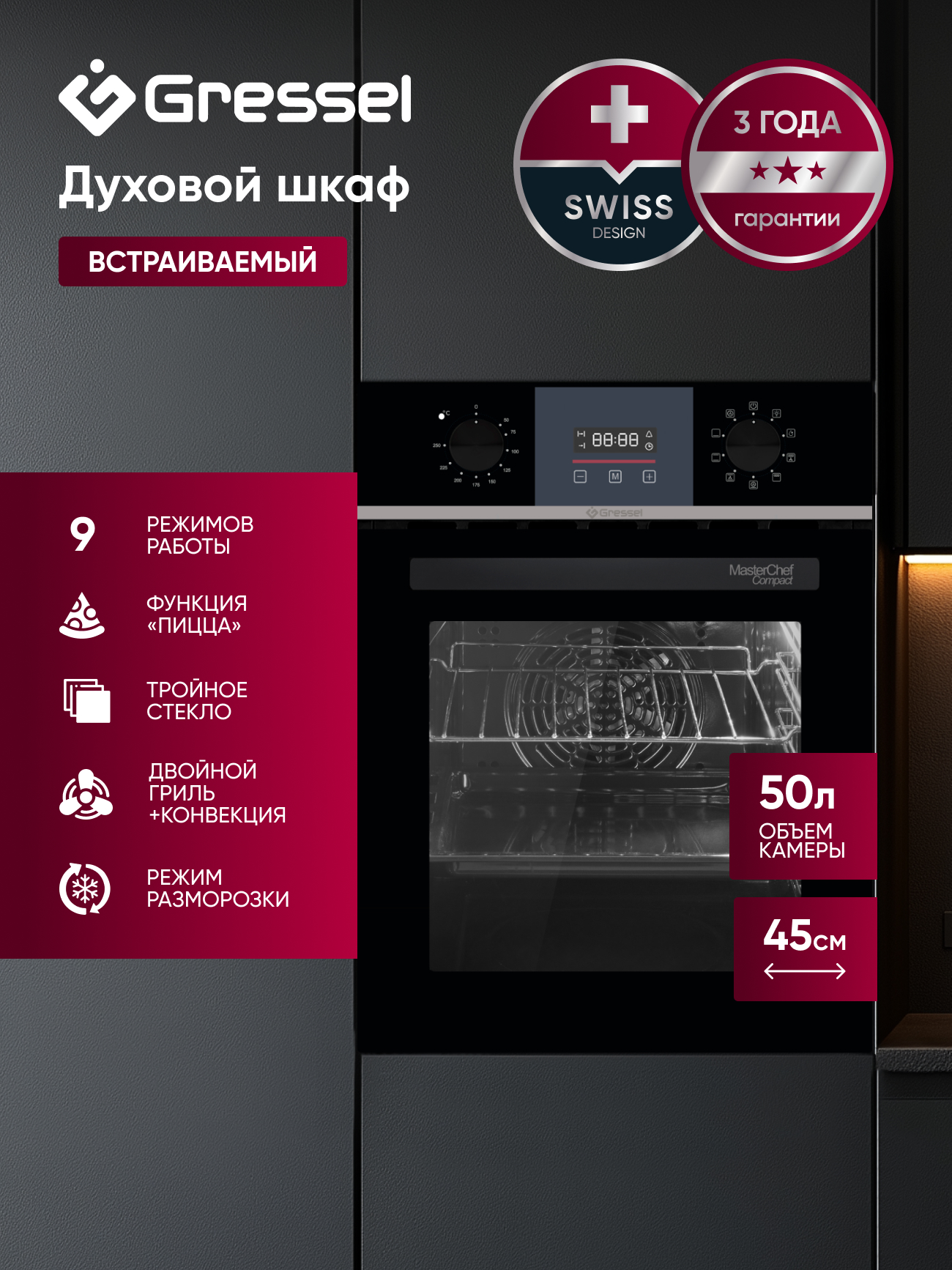 Объём духовки: 50 л — достаточно для приготовления полноценных блюд или нескольких порций одновременно.