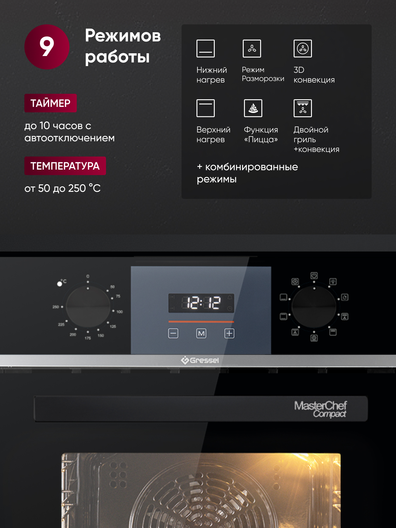 Количество режимов работы: 9, включая верхний и нижний нагрев, гриль, конвекцию, разморозку, режим «пицца» и другие комбинации.