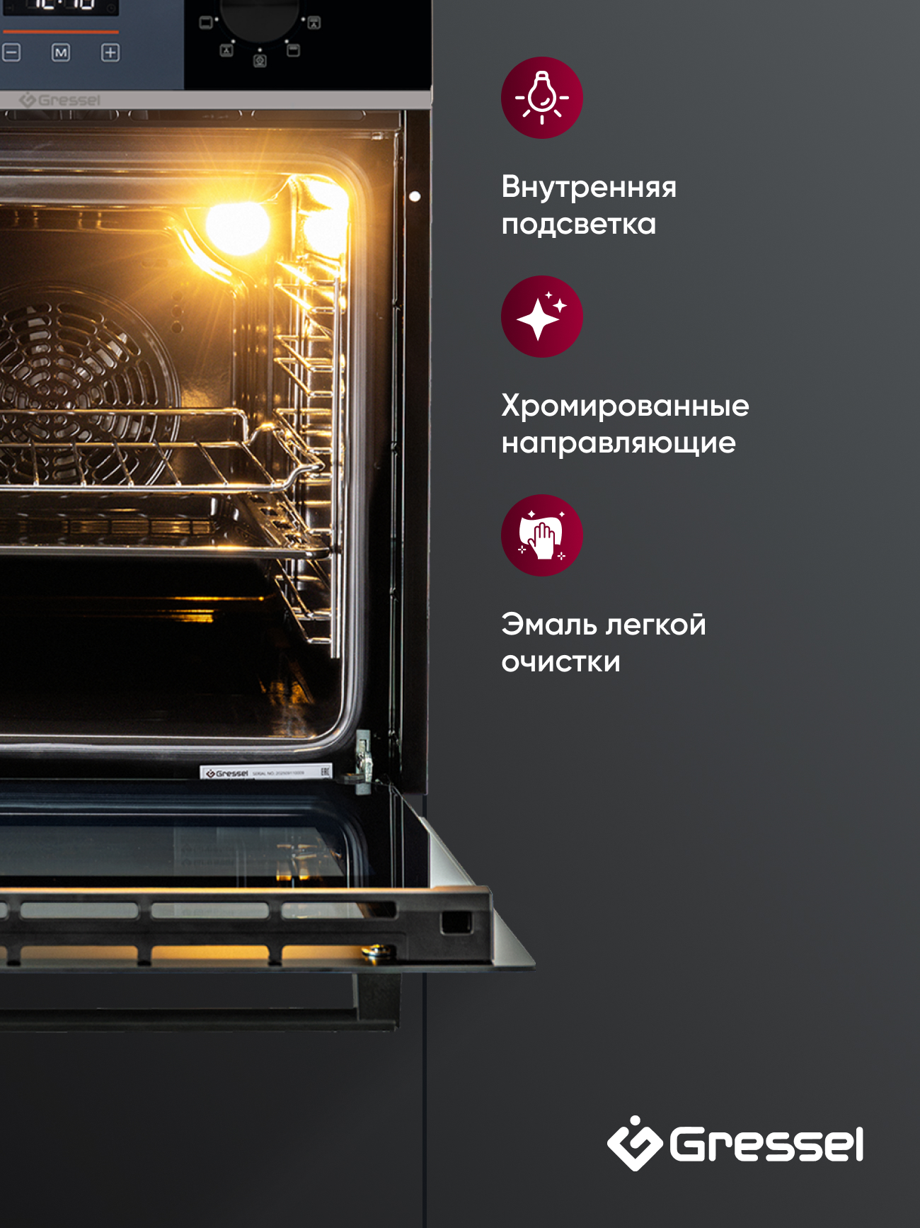 Дополнительные функции: вентилятор охлаждения корпуса, подсветка камеры, встроенные часы, эмаль лёгкой очистки.