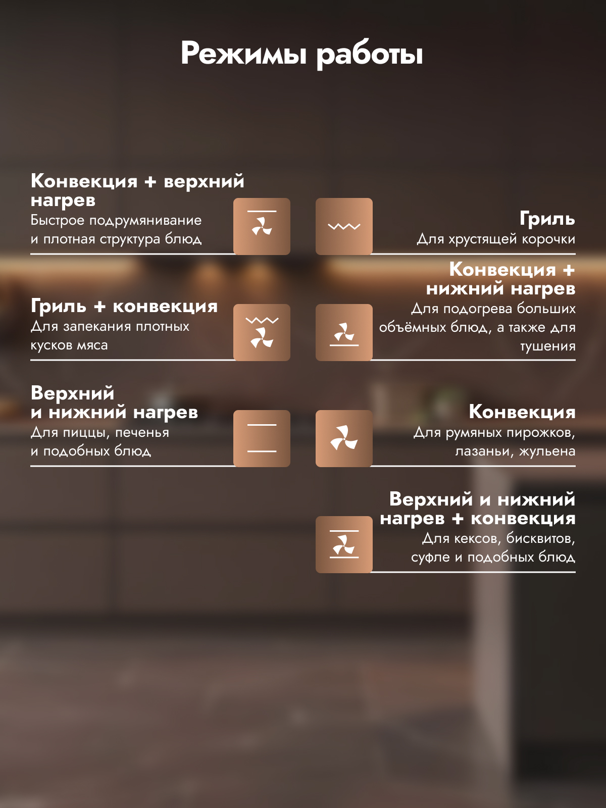 Гриль,верхний нагревы+конвекция, нижний+верхний нагревы+конвекция; нижний верхний нагревы; нижний нагрев+конвекция, конвекция+гриль; конвекция