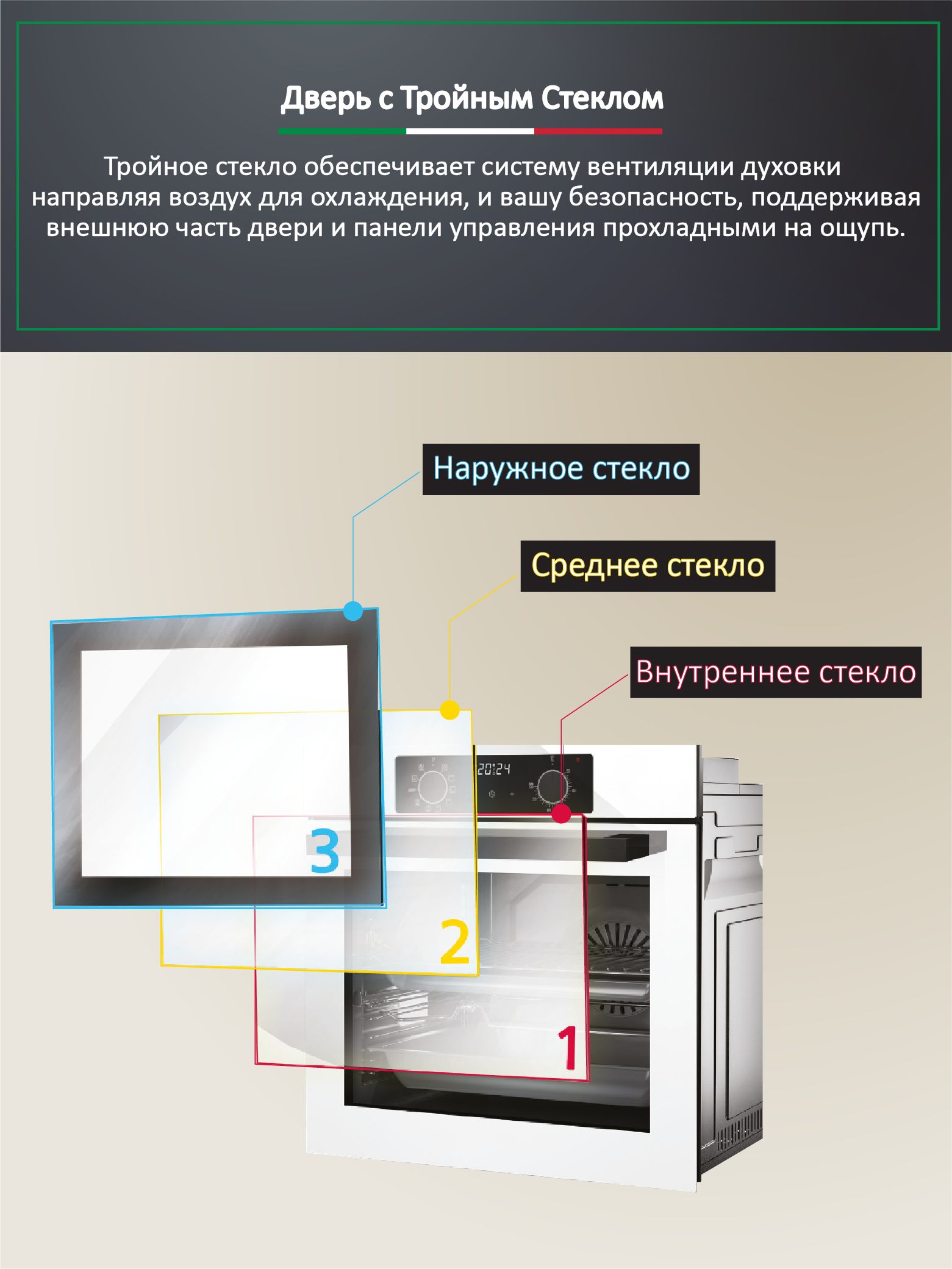 Духовой шкаф также предлагает стильные большие утапливаемые ручки, которые не только имеют современный вид, но и облегчают чистку поверхности. Тройное остекление дверцы обеспечивает отличную теплоизоляцию и безопасность, позволяя вам наблюдать за процессом приготовления без необходимости открывать дверцу.