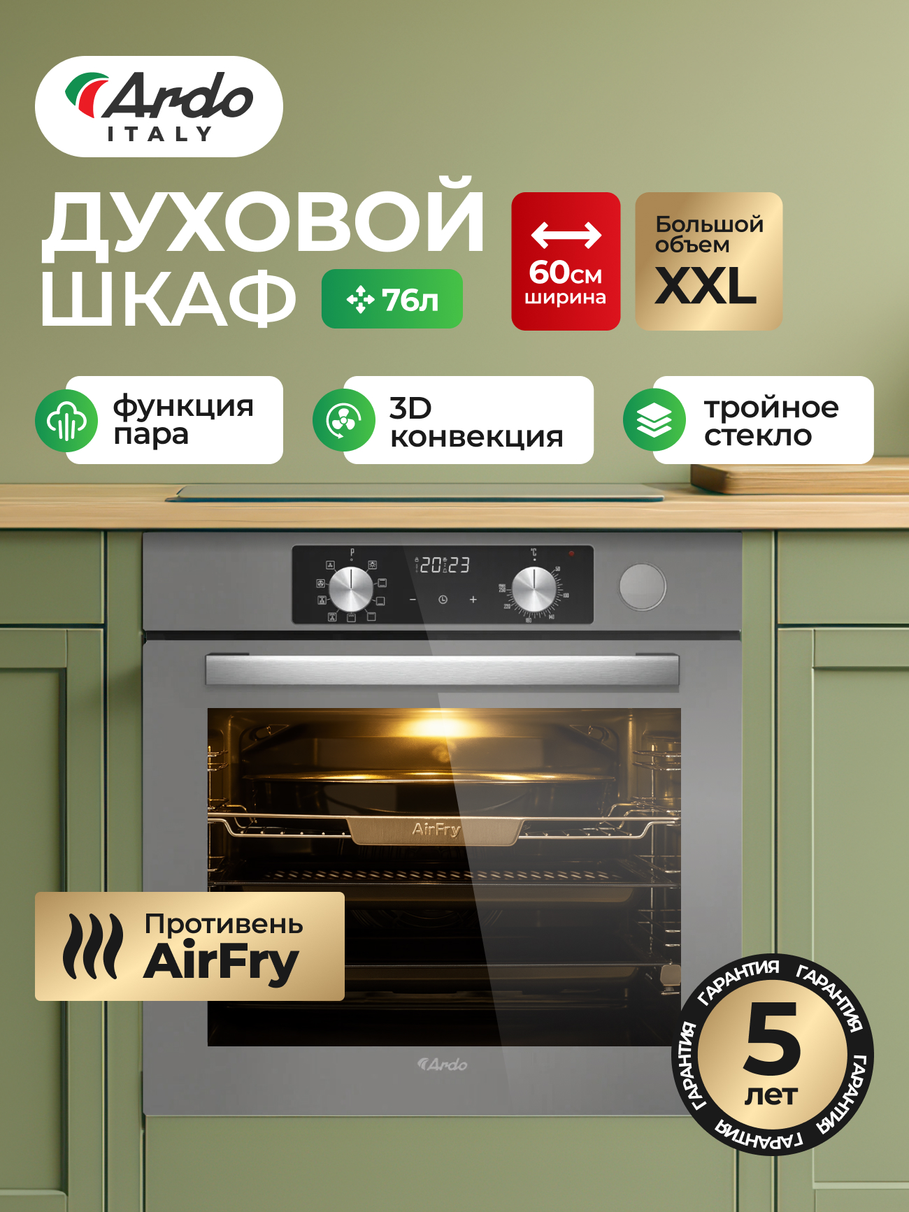 Духовой электрический шкаф Ardo BO810EAS2 76 л, гриль, конвекция, телескопические направляющие, 3 стекла, функция пара