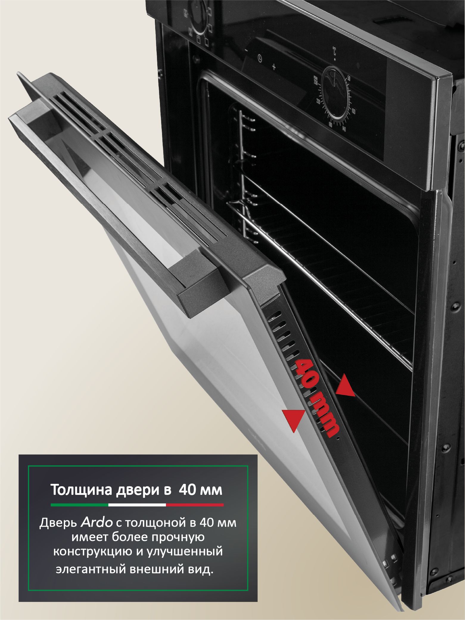 Встраиваемый духовой шкаф Ardo – идеальное решение для современной кухни, сочетающее в себе стильный дизайн и высокую функциональность. С объемом 76 литров, этот электрический духовой шкаф предоставляет достаточно места для приготовления больших блюд и выпечки.    Данная модель предлагает 9 различных режимов нагрева, что позволяет вам экспериментировать с кулинарными рецептами и выбирать оптимальные настройки для каждого блюда. Встроенная функция гриля делает его одним из лучших решений для создания аппетитных корочек и запеканок. Особенно приятно, что духовой шкаф оснащен системой конвекции, которая обеспечивает равномерное прогревание и пропекание ингредиентов, избавляя от необходимости переворачивать блюда во время готовки.    Одним из ключевых преимуществ является тройное остекление дверцы, которое гарантирует высокий уровень изоляции и безопасность во время использования. Вы можете не беспокоиться о перегреве внешней поверхности, что особенно важно, если у вас есть маленькие дети. Съемные стекла упрощают процесс чистки, позволяя вам поддерживать устройство в идеальном состоянии без лишних усилий.    Ширина 60 см делает этот встраиваемый духовой шкаф совместимым с большинством кухонных гарнитуров, а его стильный внешний вид легко вписывается в любой интерьер. Удобное управление и понятная панель управления обеспечивают легкость в использовании, даже для тех, кто не имеет большого опыта в приготовлении блюд.