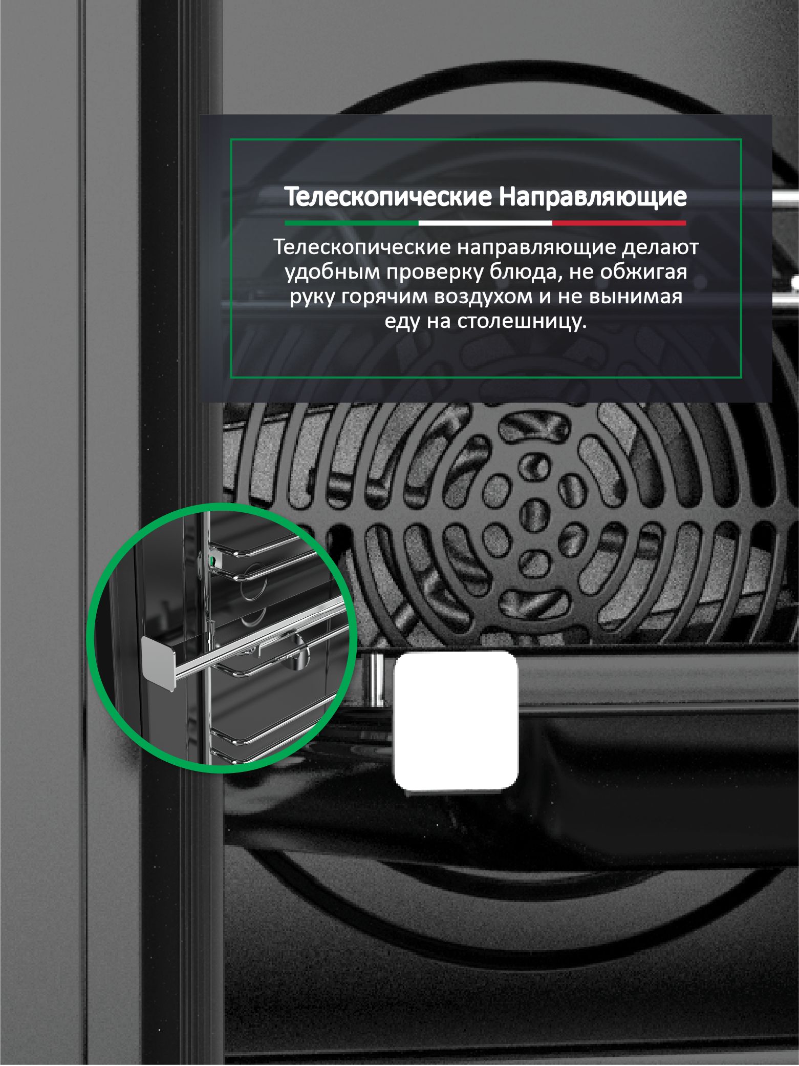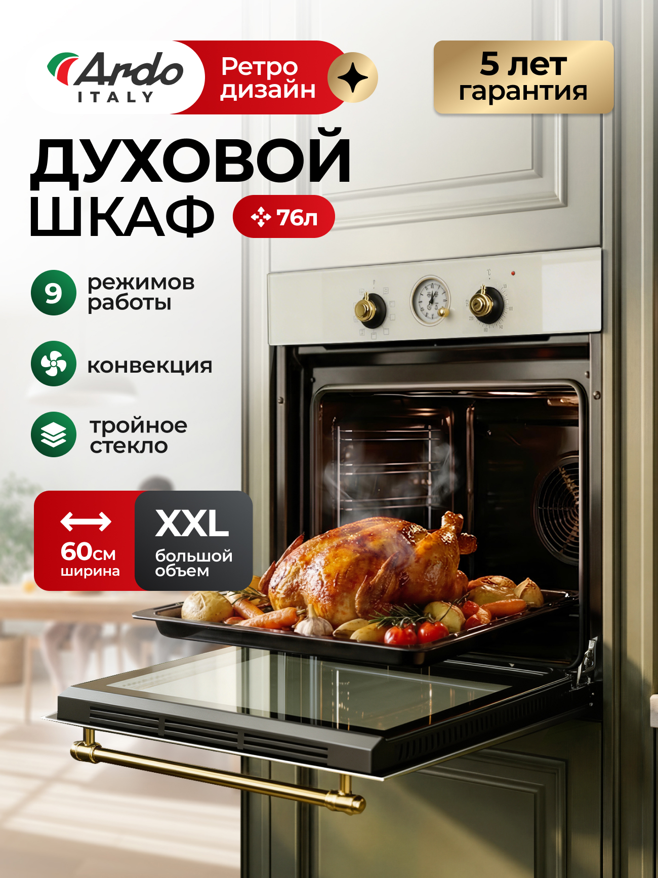 Духовой электрический шкаф Ardo BO58ERC2 с грилем и конвекцией, 76 л, 9 режимов, тройное остекление, съемные стекла