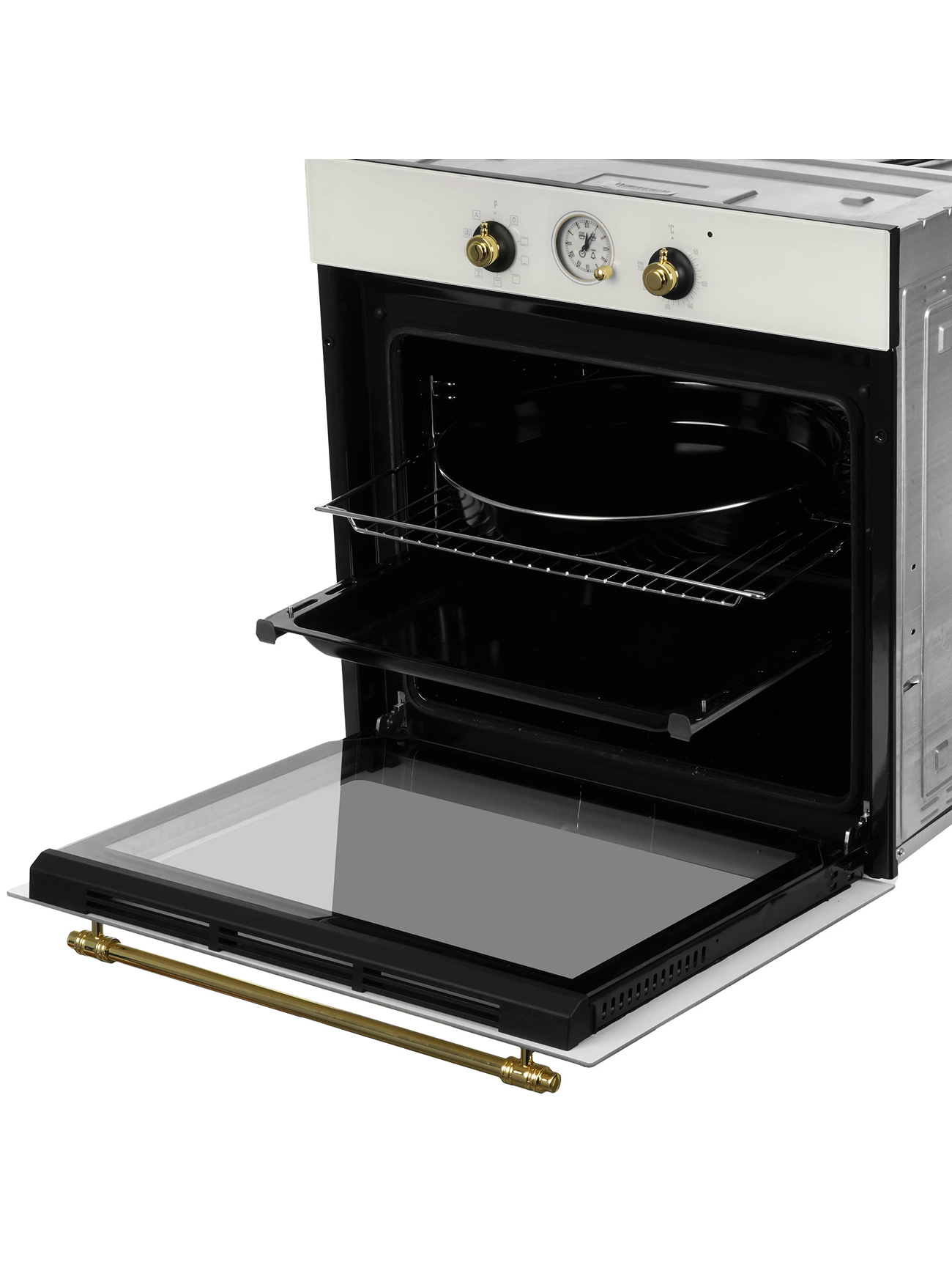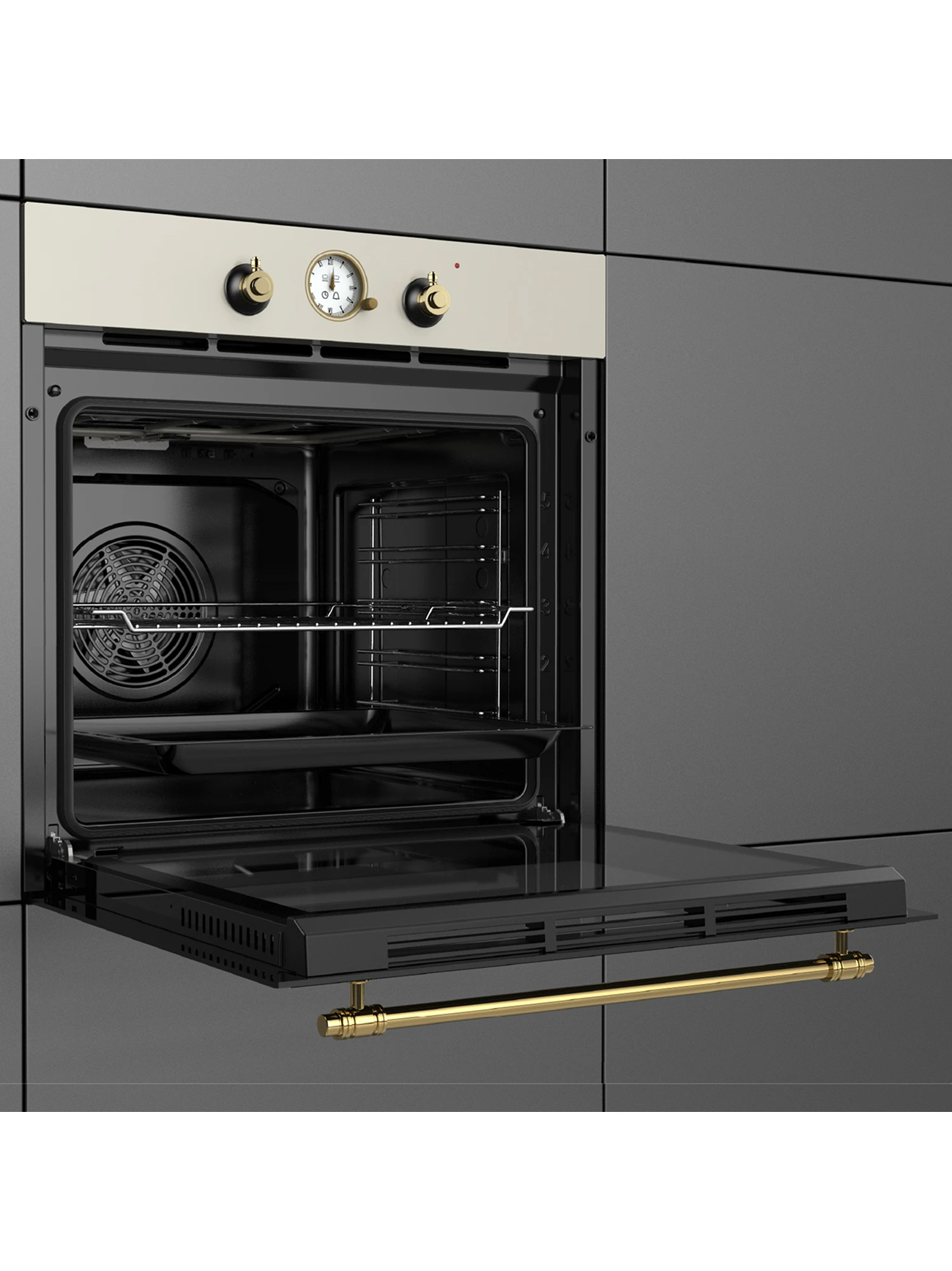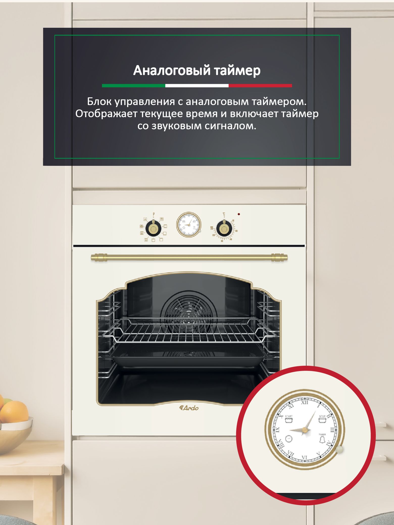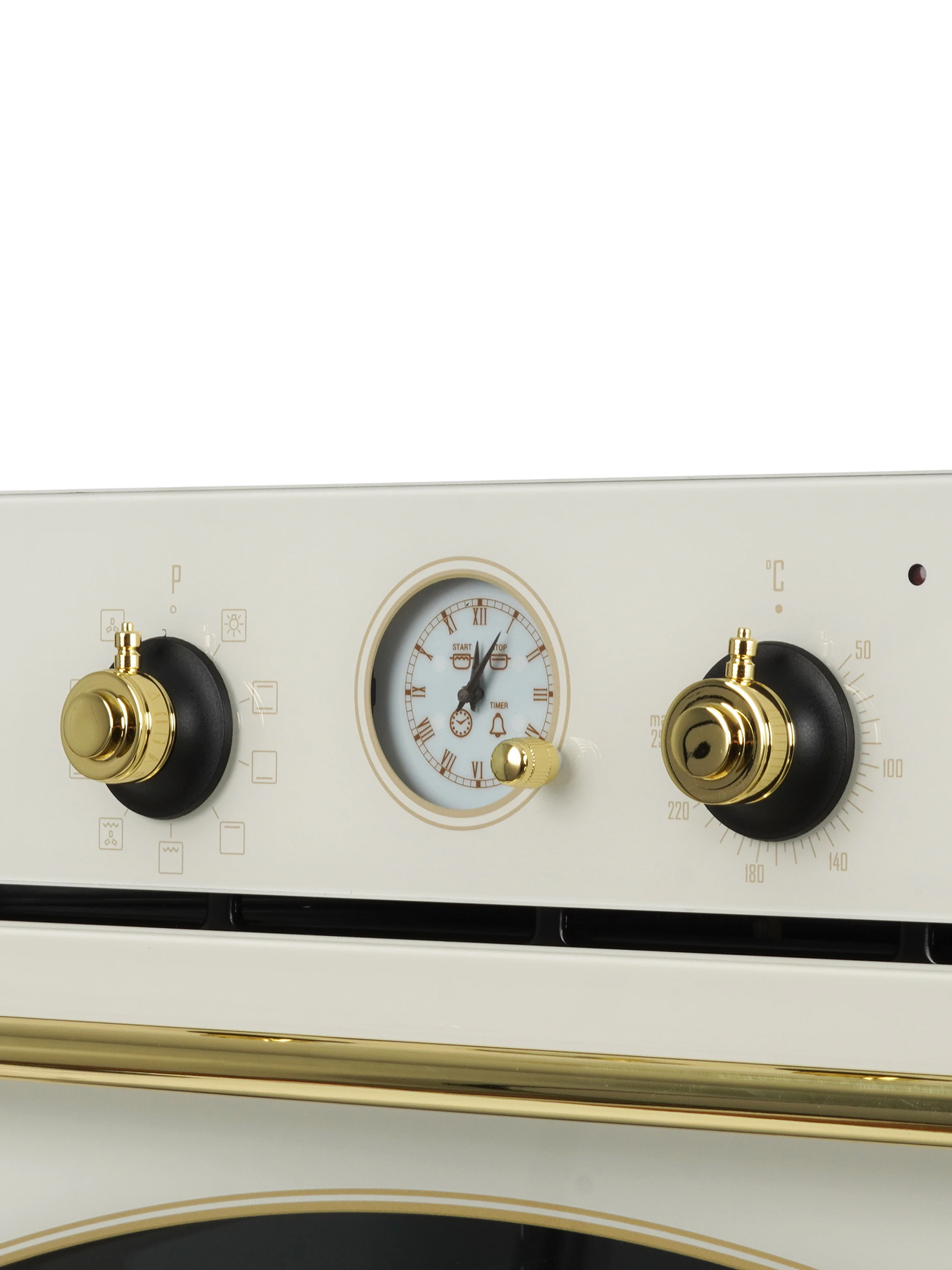 Представляем вашему вниманию встраиваемый духовой шкаф в стиле РЕТРО бежевого цвета. Этот уникальный прибор станет настоящим украшением вашей кухни благодаря своему элегантному дизайну и функциональности. Духовой шкаф предлагает 9 различных режимов, что позволяет готовить любимые блюда с максимальным удобством и стилем. Один из режимов включает гриль, который идеально подходит для запекания мяса и овощей, придавая им аппетитную корочку.    Управление духовым шкафом осуществляется с помощью аналогового таймера, что делает процесс приготовления простым и интуитивно понятным. Вы сможете легко устанавливать нужное время приготовления, не отвлекаясь от других дел.    Этот духовой шкаф в стиле РЕТРО не только функционален, но и вносит в ваш интерьер особую атмосферу. Его бежевый цвет гармонично впишется в любой дизайн кухни, добавляя ей нотку изысканности и стиля. Встраиваемый формат позволяет эффективно использовать пространство, а тщательная проработка дизайна делает шкаф идеальным выбором для тех, кто ценит не только качество, но и эстетический вид бытовой техники.