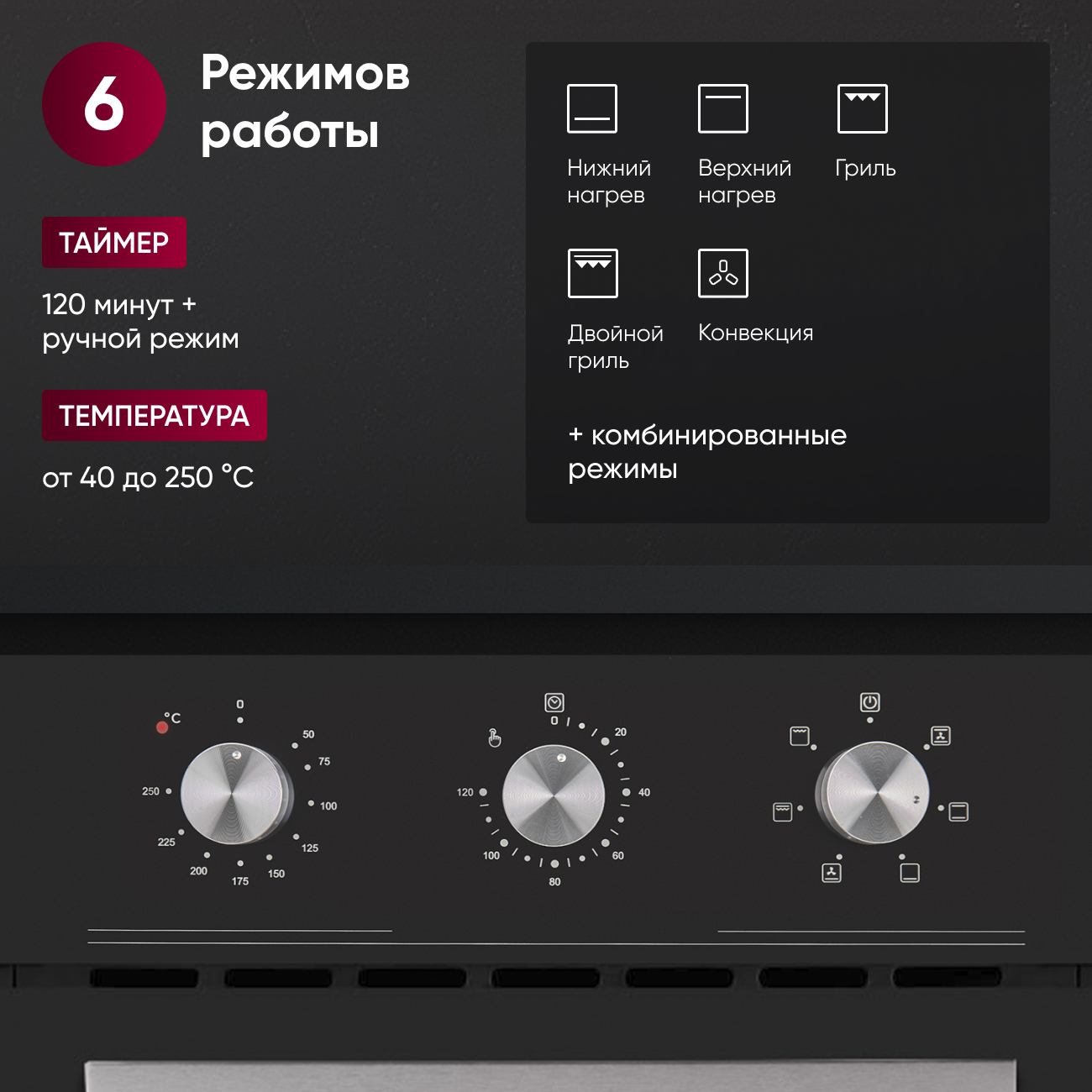Шесть режимов приготовления: Доступные режимы включают большой и малый гриль, конвекцию и их комбинации, обеспечивая гибкость в приготовлении ваших любимых блюд.