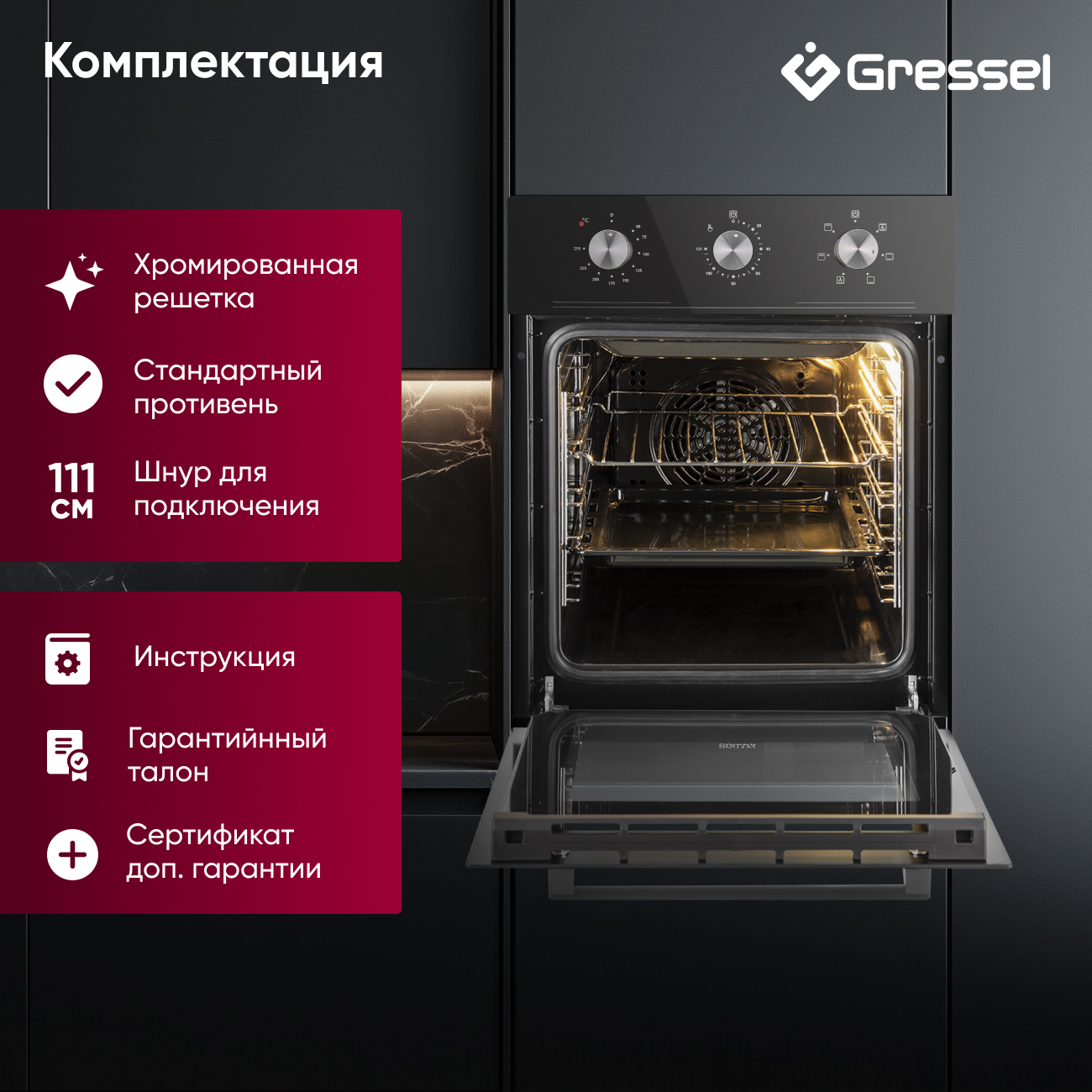 Комплектация: Духовка комплектуется хромированной решеткой и стандартным противнем, а также имеет шнур для подключения длиной 111 см (без вилки), инструкцию, гарантийный талон и сертификат дополнительной гарантии.
