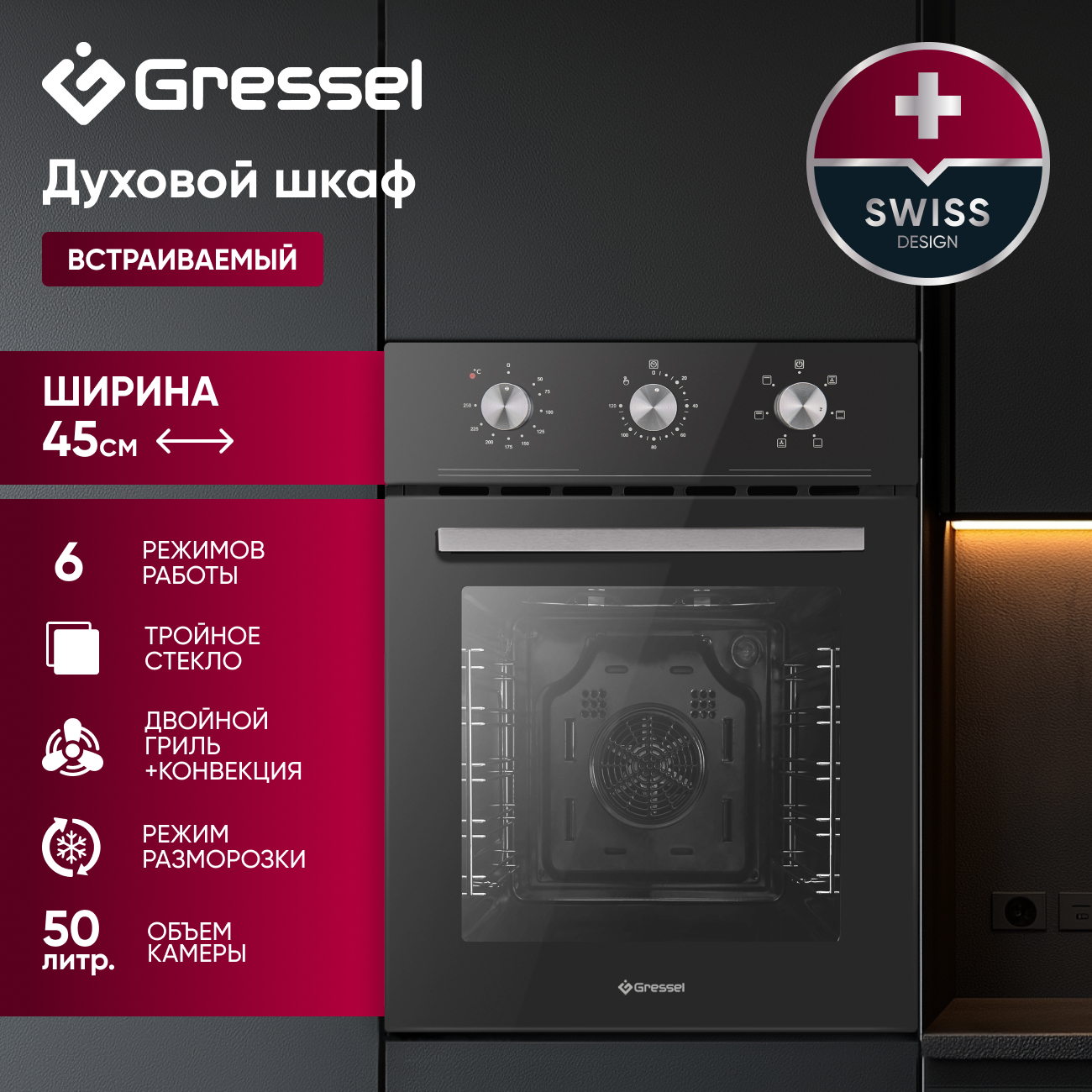 Встраиваемый духовой шкаф GRESSEL RU4ES7716000 45 см, 50 л, 6 режимов