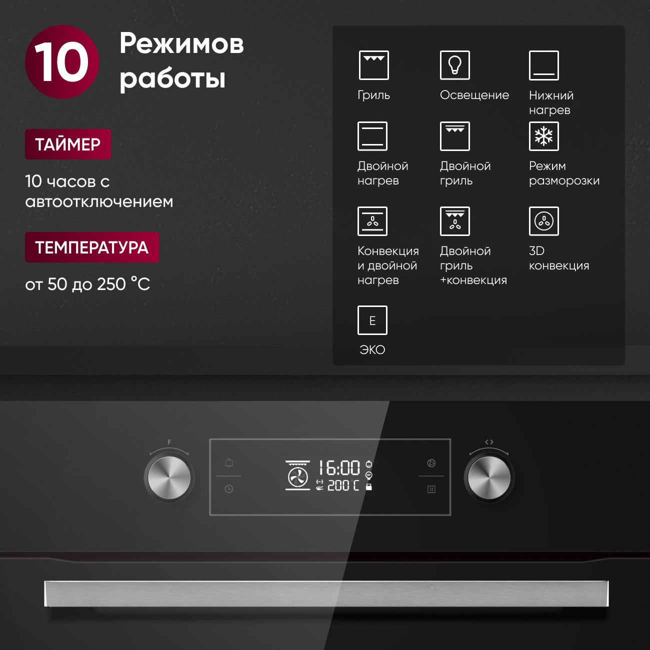 Мощность 3000 Вт обеспечивает быстрый нагрев, а цифровой таймер-программатор на 10 часов даст точное время готовки даже для сложных рецептов. Дверца с двойным стеклом удерживает высокую температуру внутри, а хромированные направляющие и 2 противня в комплекте делают приготовление более комфортным.