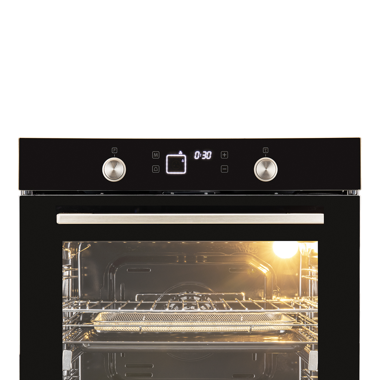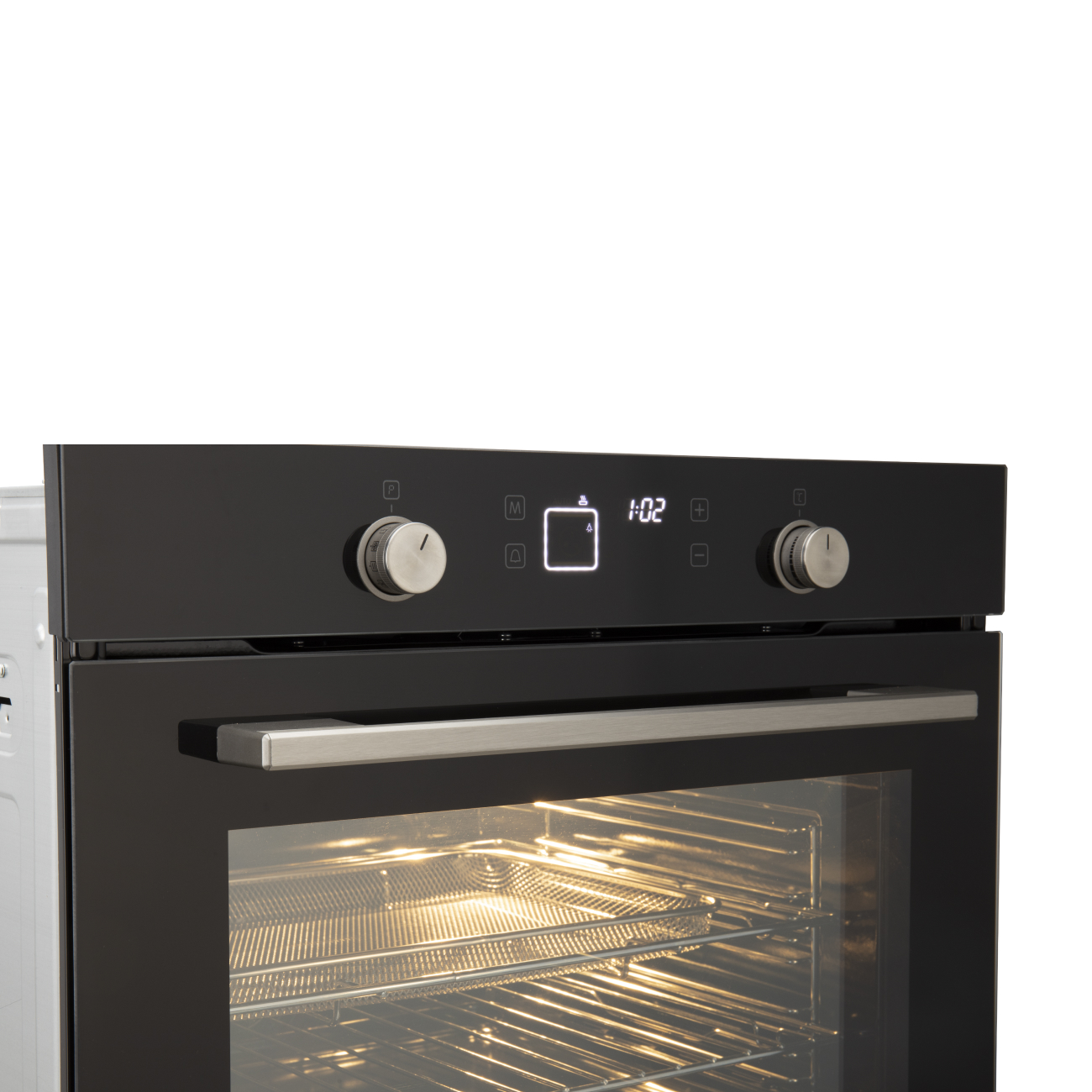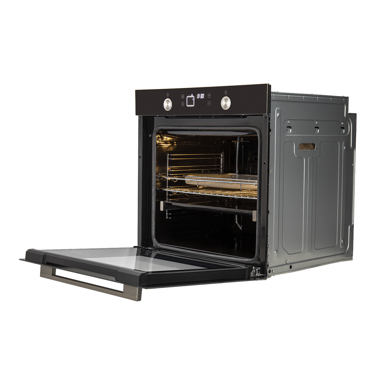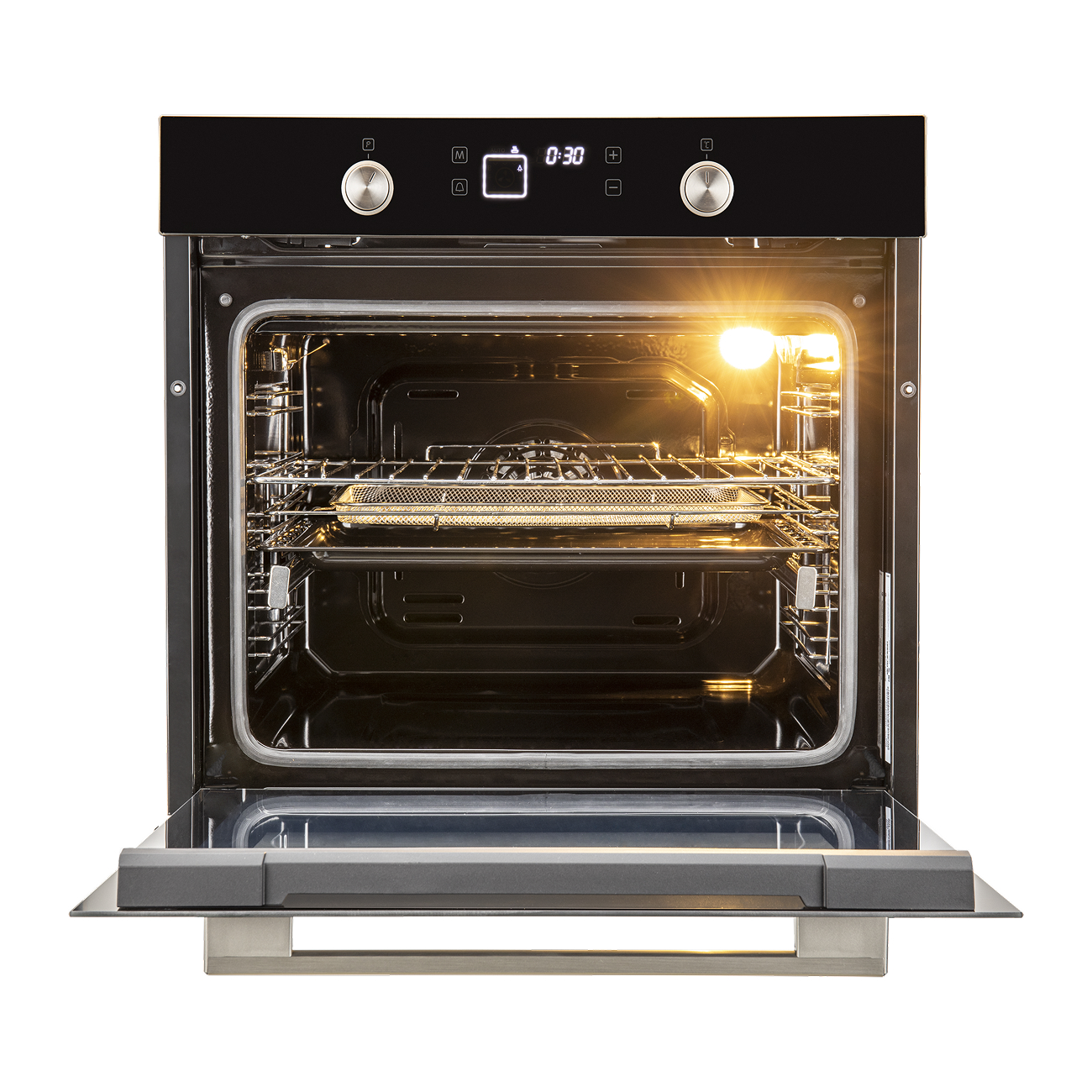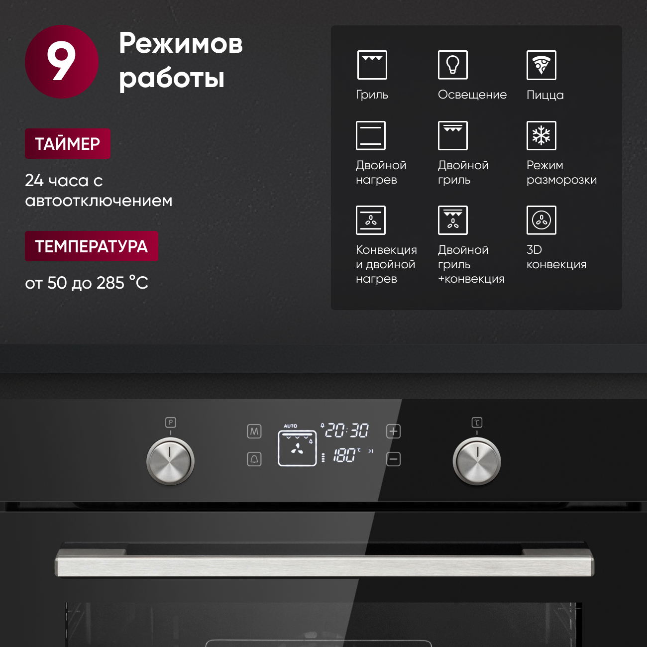 Современный дизайн с утапливаемыми переключателями и внутренней подсветкой делает эту духовку не только функциональной, но и стильным добавлением к любой кухне.