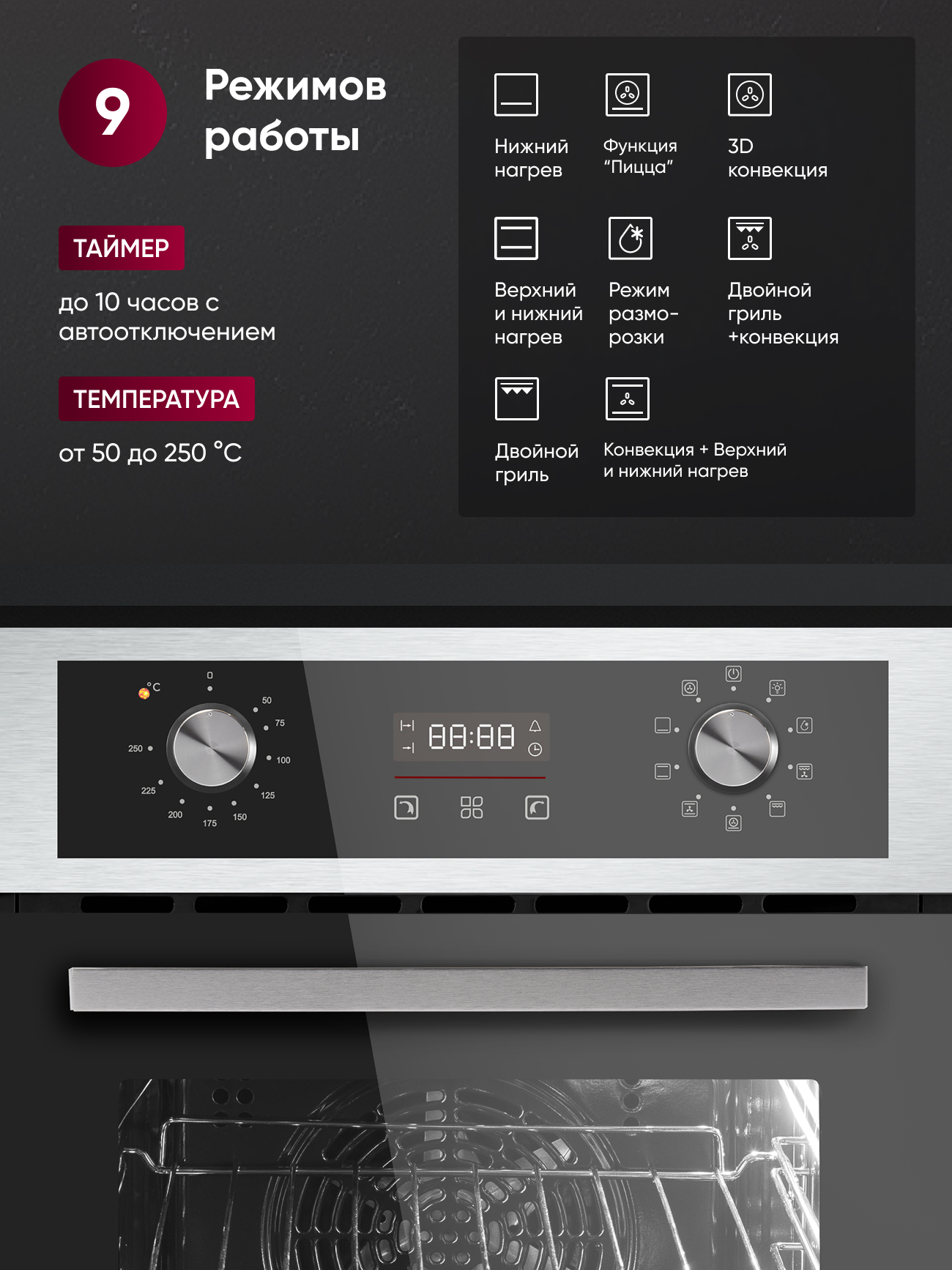 Пароочистка, освещение, нижний нагрев и верхний нагрев, верхний нагрев, гриль, гриль + конвекция, нижний нагрев и верхний нагрев + конвекция, Турбо конвекция, конвекция