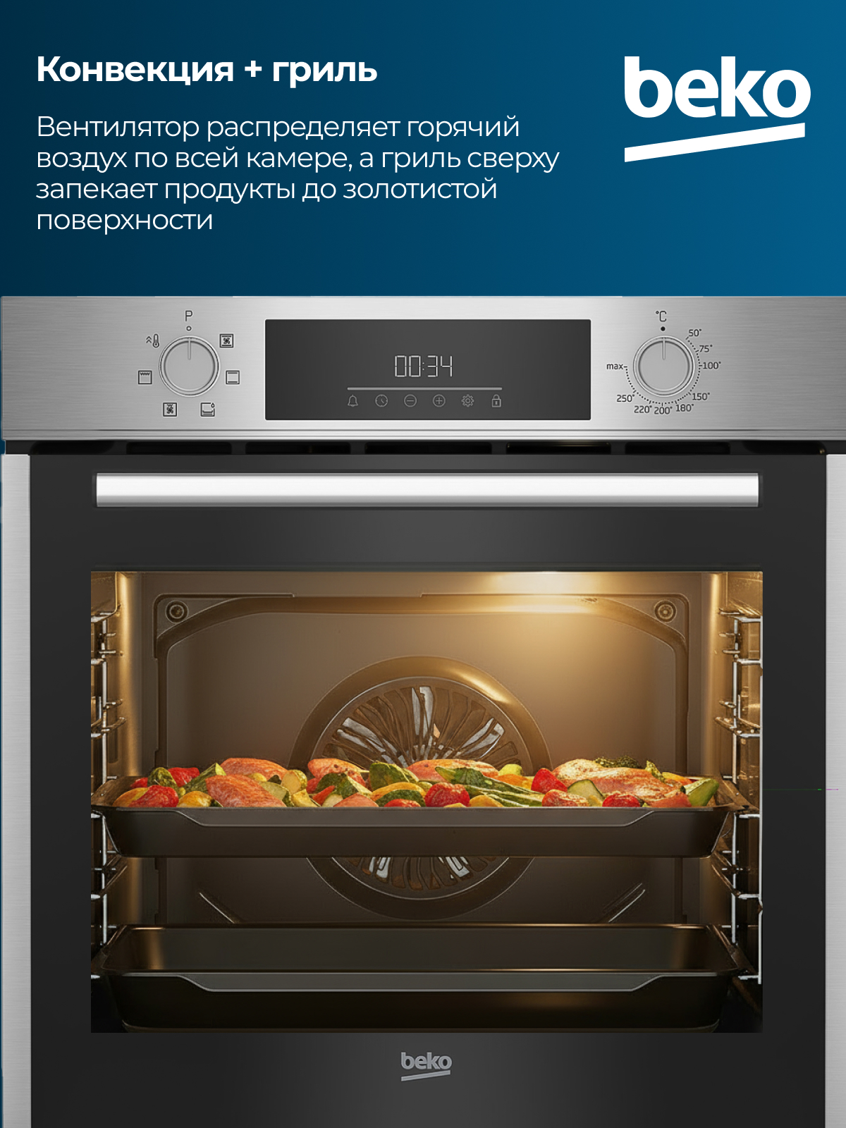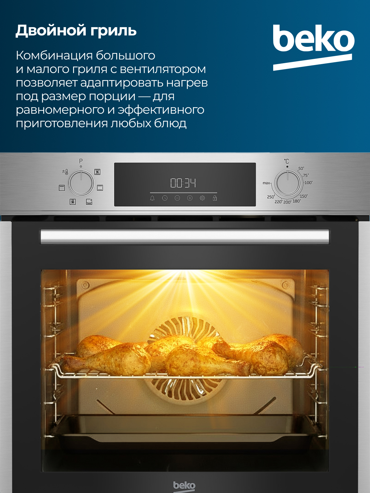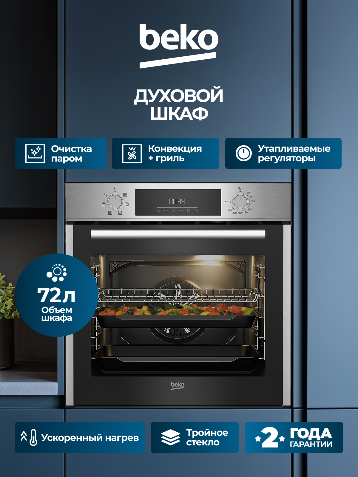 Встраиваемый электрический духовой шкаф Beko объемом 72 литра предлагает 6 режимов работы, включая конвекцию, гриль и верхний нагрев. Это позволяет вам легко приготовить разнообразные блюда, от выпечки до мяса.