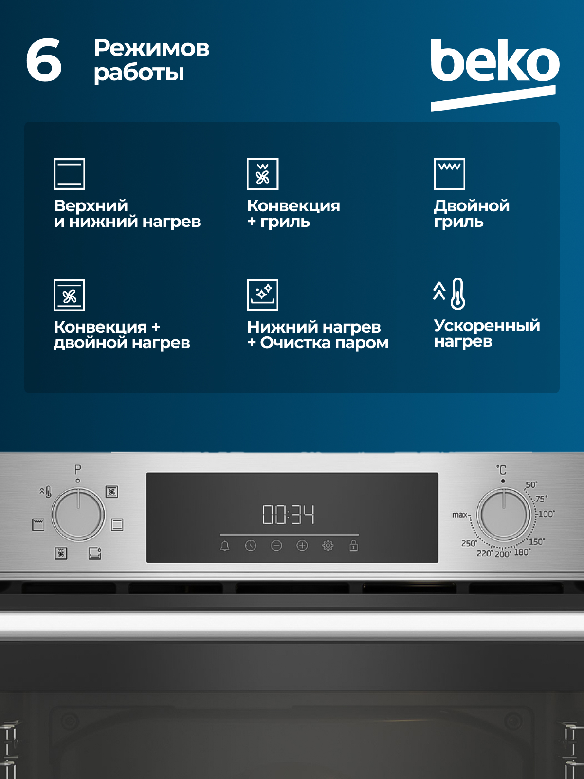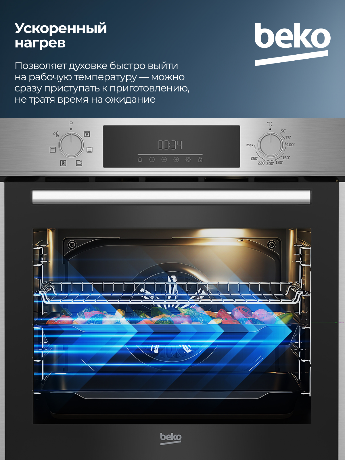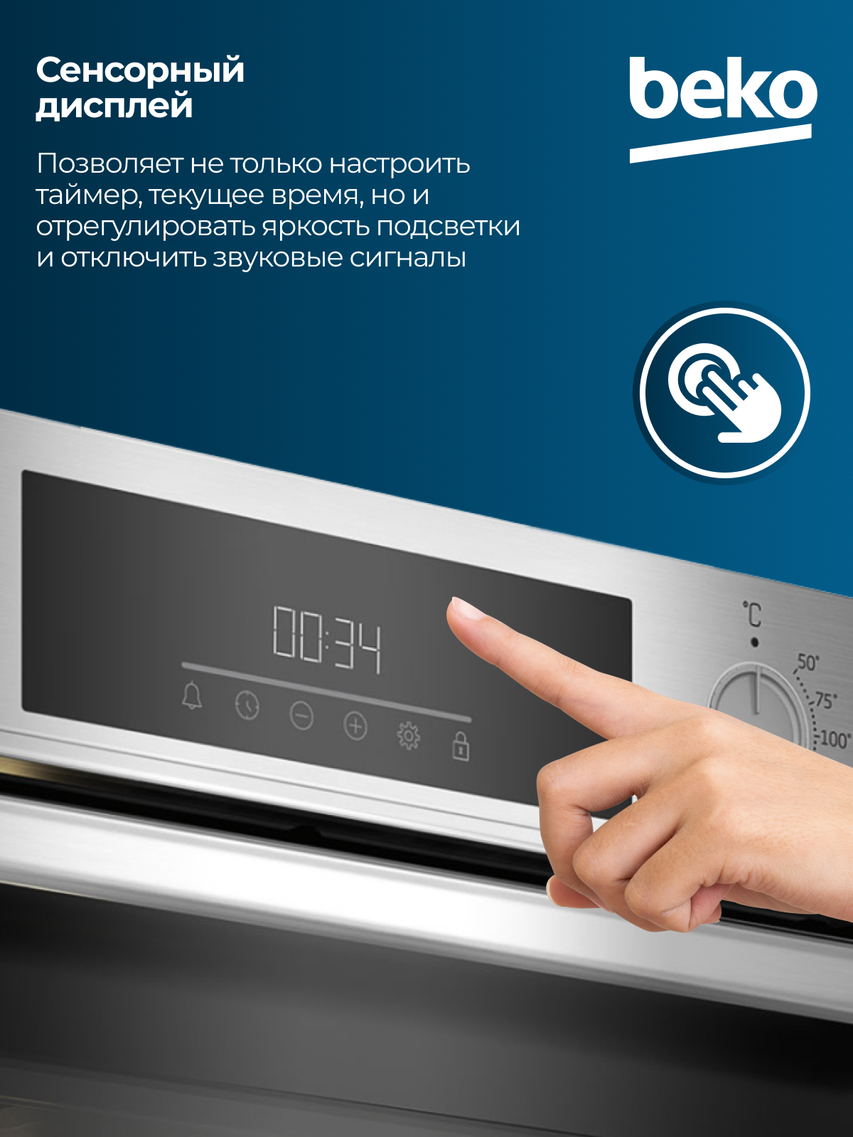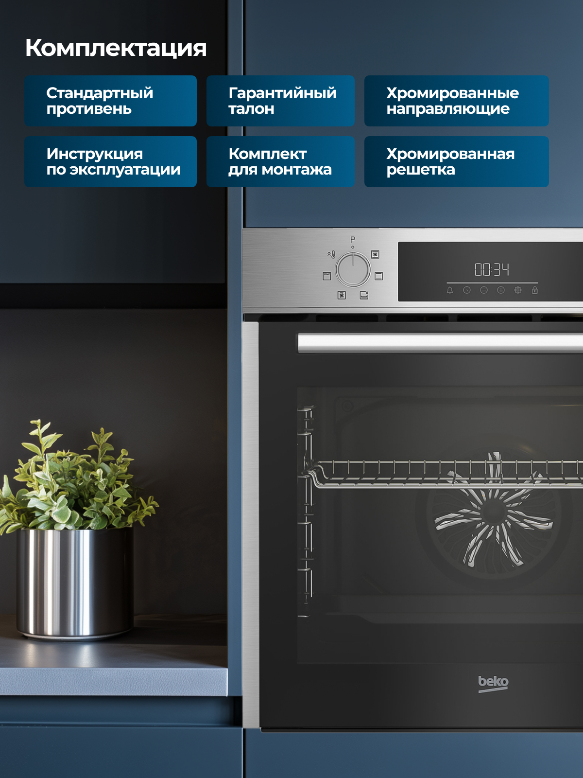 Встраиваемый электрический духовой шкаф Beko объемом 72 литра предлагает 6 режимов работы, включая конвекцию, гриль и верхний нагрев. Это позволяет вам легко приготовить разнообразные блюда, от выпечки до мяса.